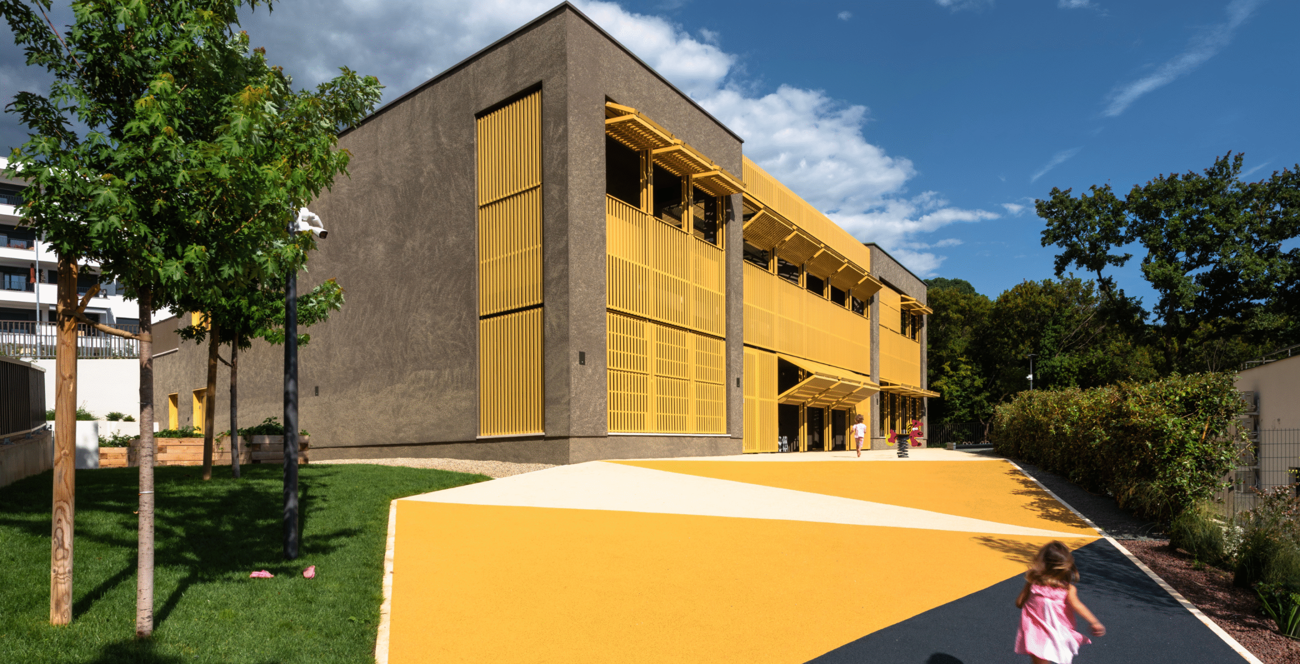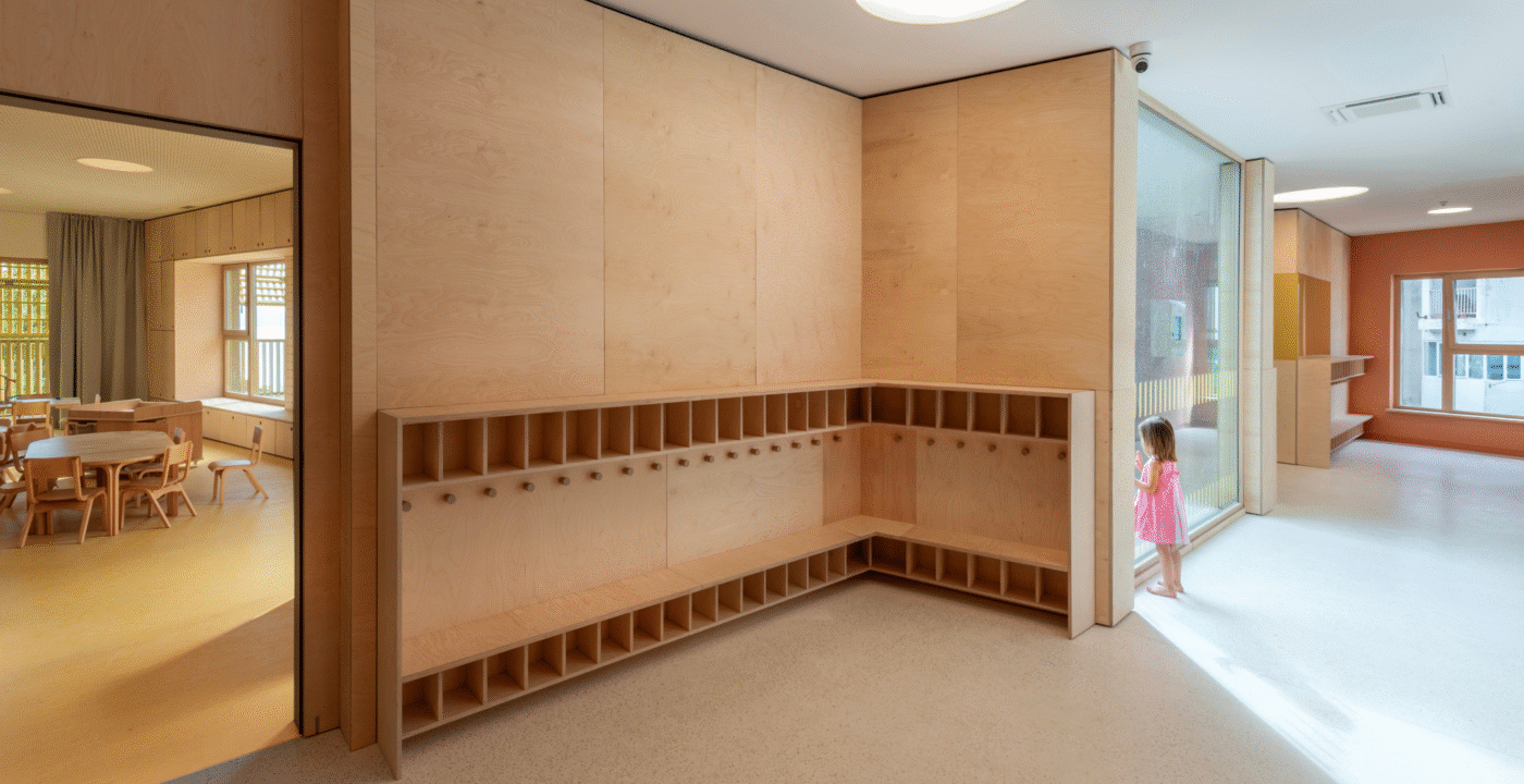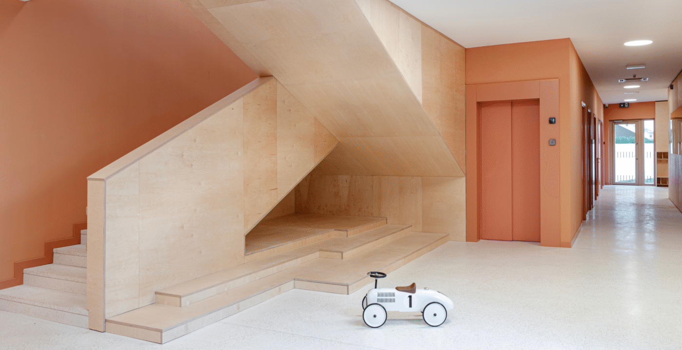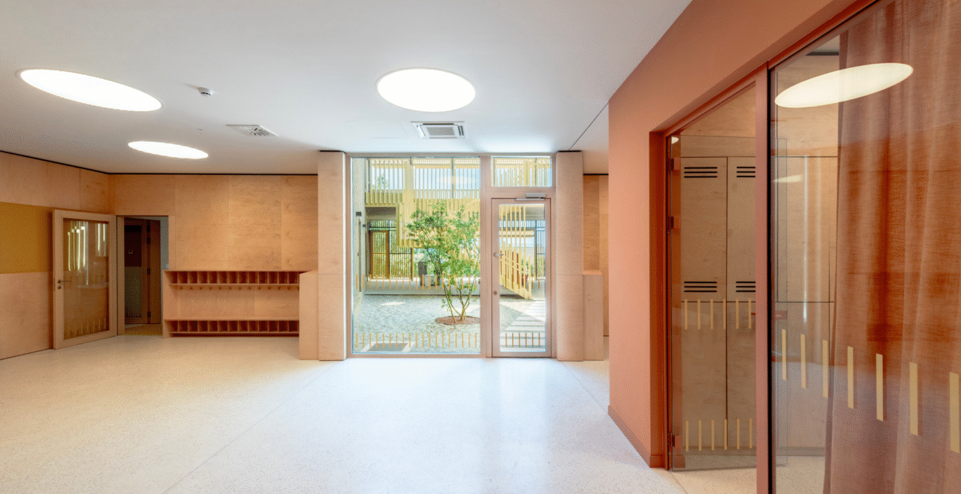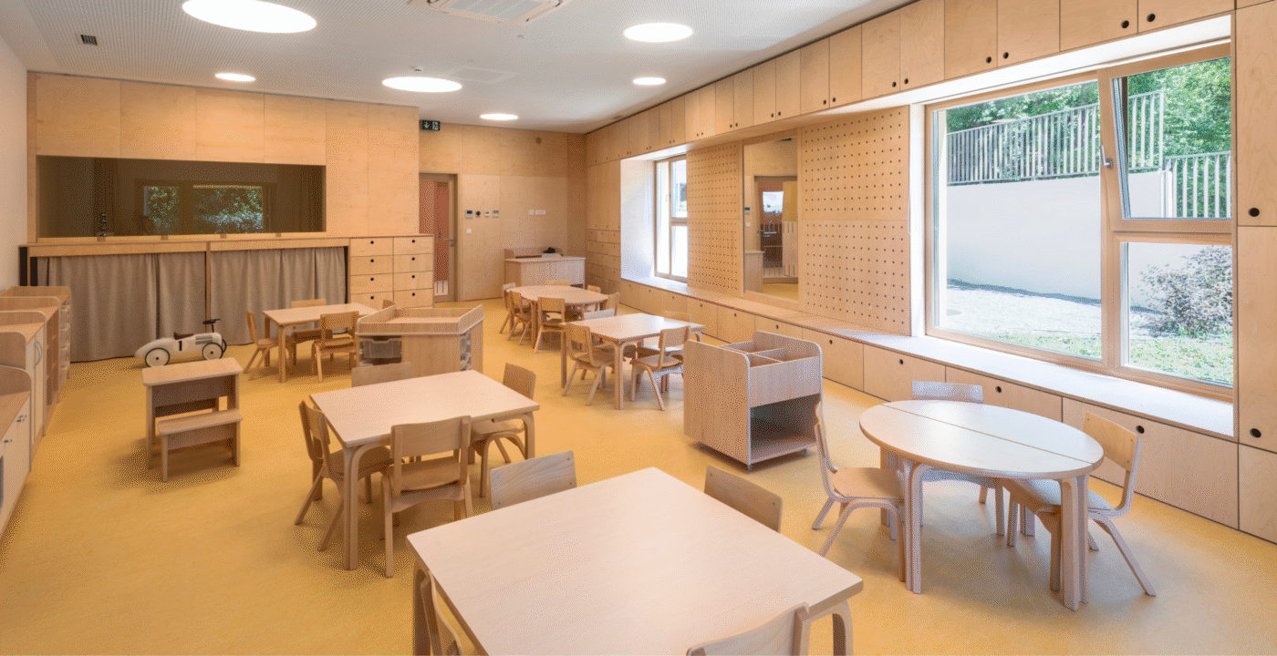 The Paveki branch kindergarten becomes a space for play, learning, and carefree childhood for around ninety new children, organized into two nursery groups and three kindergarten groups. Every piece of equipment was designed to integrate harmoniously into the concept of an airy and light-filled interior—from pastel-toned walls and wooden finishes to functional elements that follow the linear organization of the space. The outdoor playground also includes a pavilion designed as an outdoor living area, enriched with a variety of play elements: a colorful bicycle ramp, slide, climbing net, amphitheater, and green modules. The result is a playful landscape of colors and forms, where the boundaries between play, nature, and communication gently dissolve.