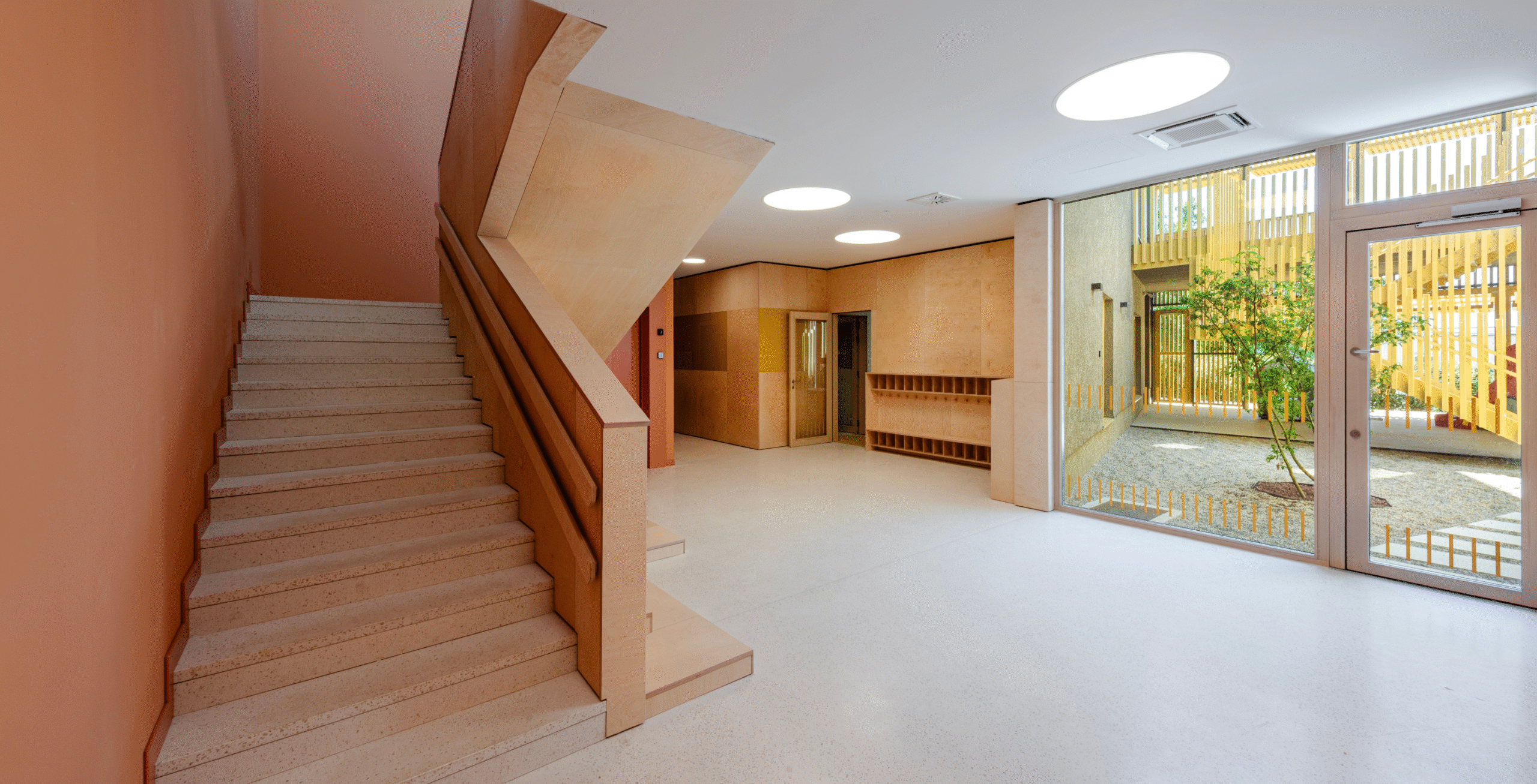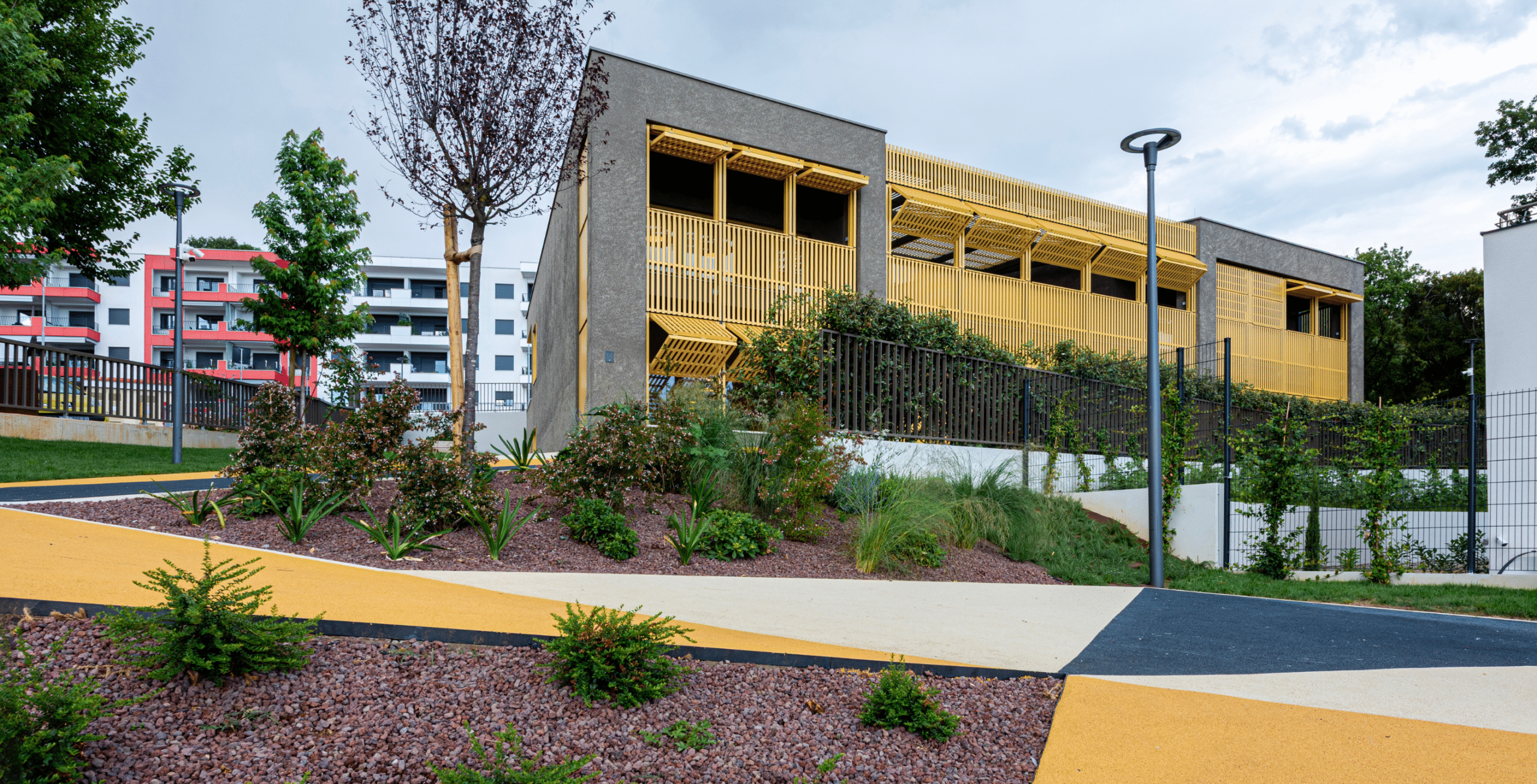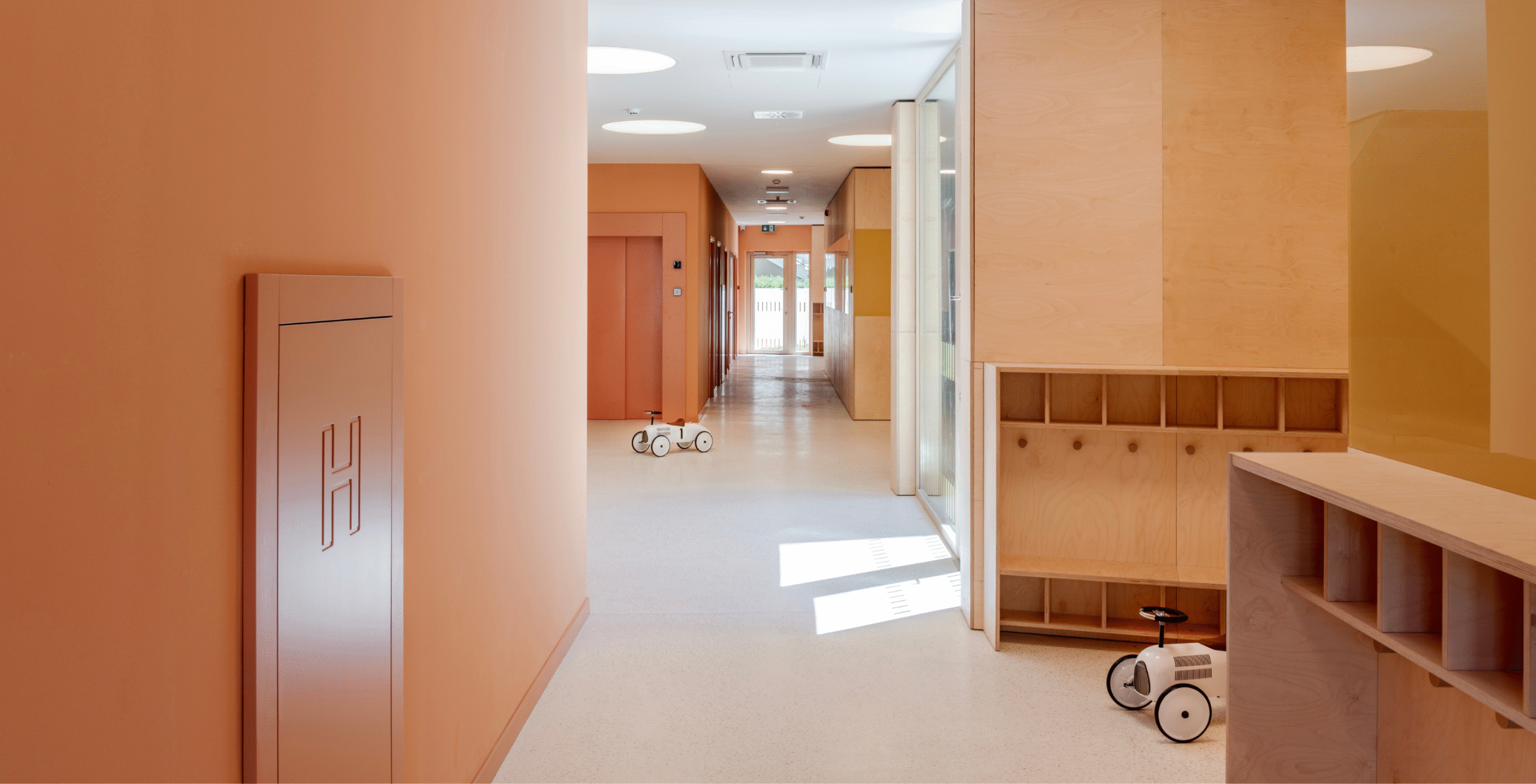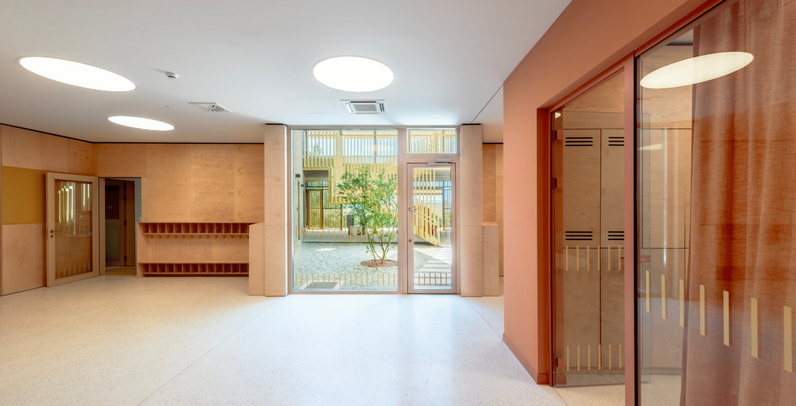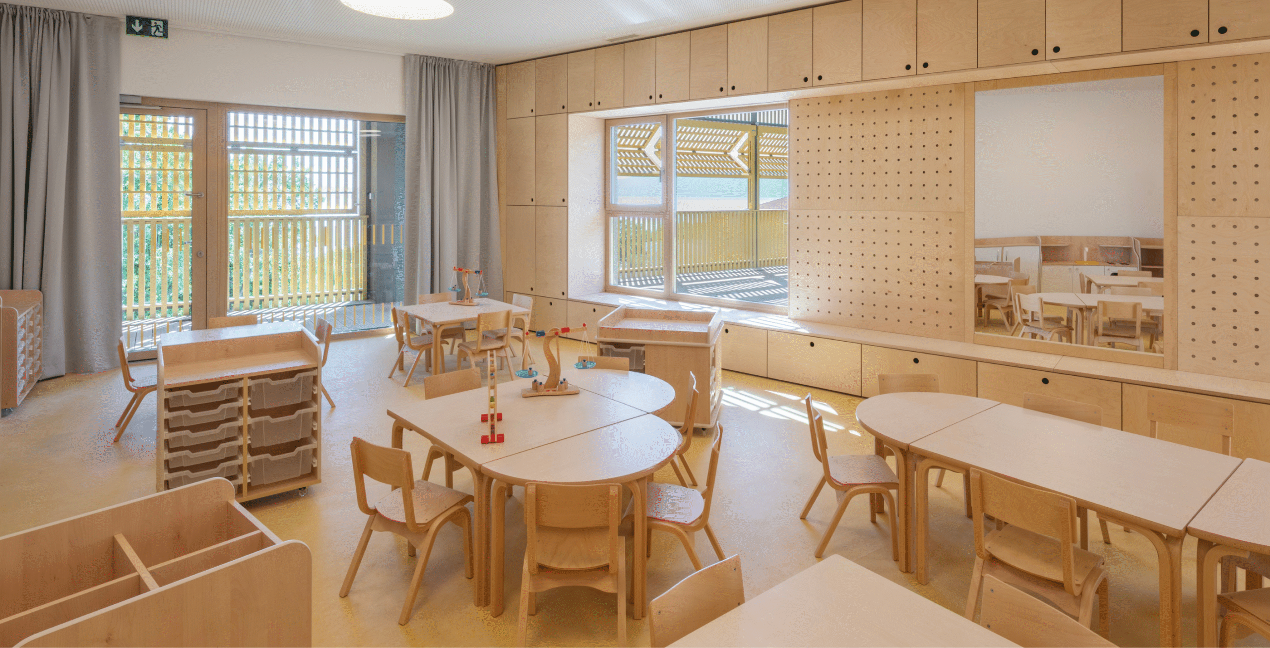 The Paveki branch kindergarten becomes a space for play, learning, and carefree childhood for around ninety new children, organized into two nursery groups and three kindergarten groups. Every piece of equipment was designed to integrate harmoniously into the concept of an airy and light-filled interior—from pastel-toned walls and wooden finishes to functional elements that follow the linear organization of the space. The outdoor playground also includes a pavilion designed as an outdoor living area, enriched with a variety of play elements: a colorful bicycle ramp, slide, climbing net, amphitheater, and green modules. The result is a playful landscape of colors and forms, where the boundaries between play, nature, and communication gently dissolve.