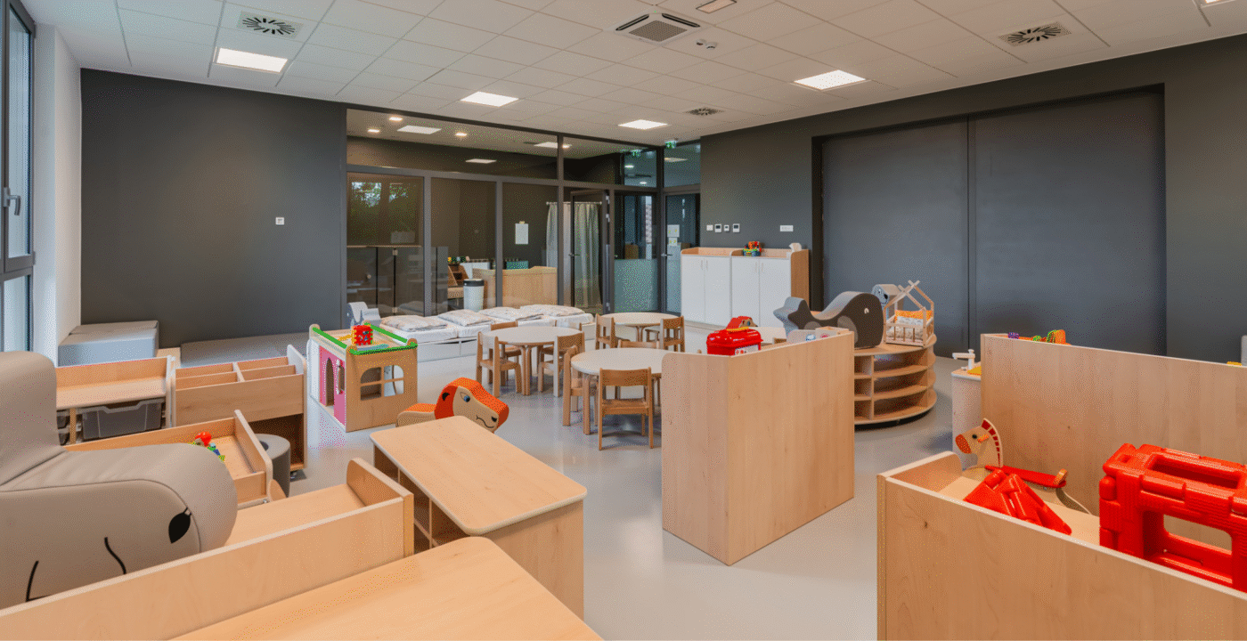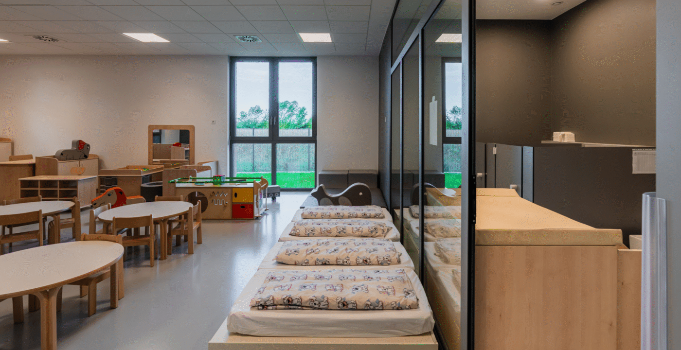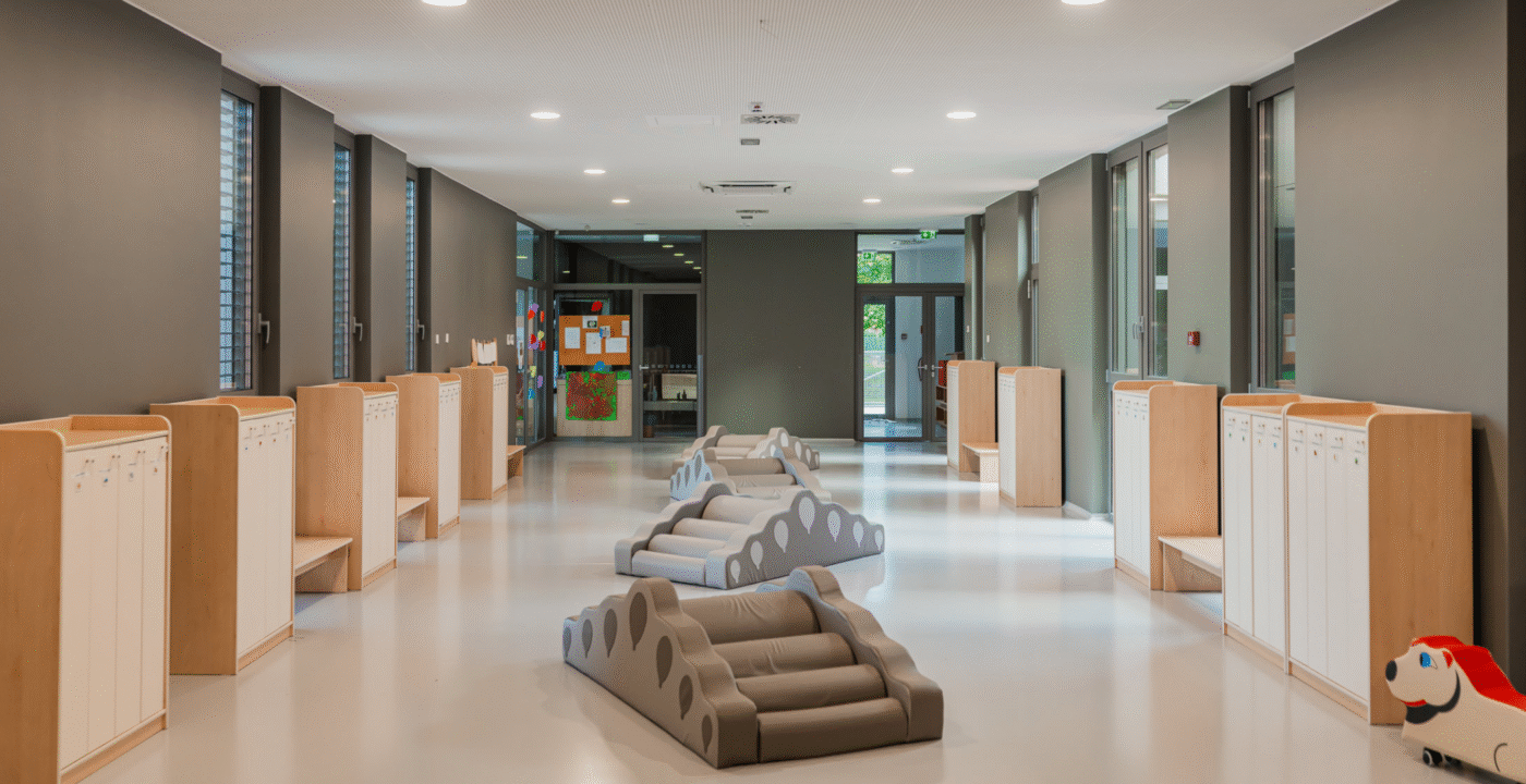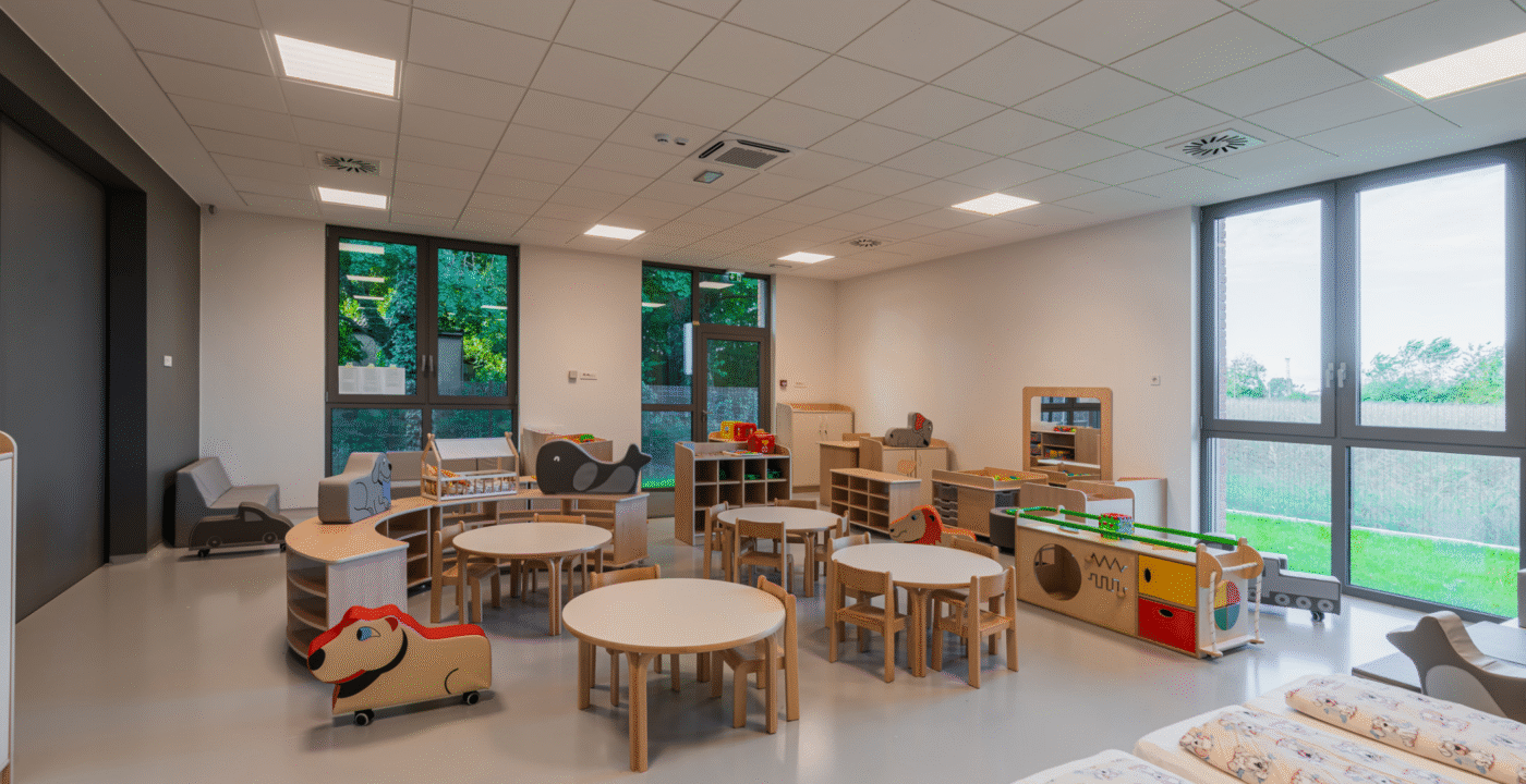 Zrno Kindergarten opened in 2024, with the City of Zagreb investing €4.2 million to create a modern and functional space for play and learning. The 1,700 m² facility accommodates six educational groups and features a range of amenities tailored to children of different ages. A distinctive feature of this kindergarten is the indoor atrium with a stress-absorbing floor, designed for outdoor-style play while ensuring maximum child safety. Each floor also includes a dining area, which is uncommon in kindergarten facilities. The kindergarten is further equipped with multisensory rooms and spaces for exploring light and shadow, fostering children’s curiosity and development through play. Carefully selected toys and equipment enhance safety, variety, and a stimulating environment that promotes play, learning, and social interaction.