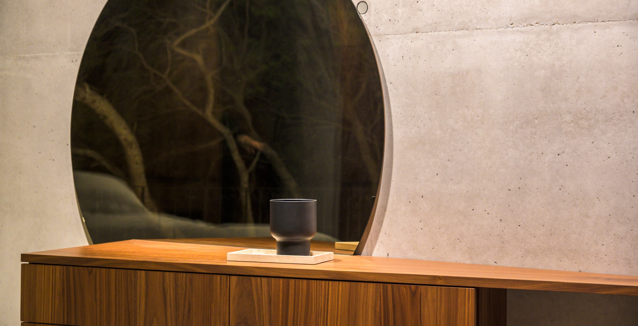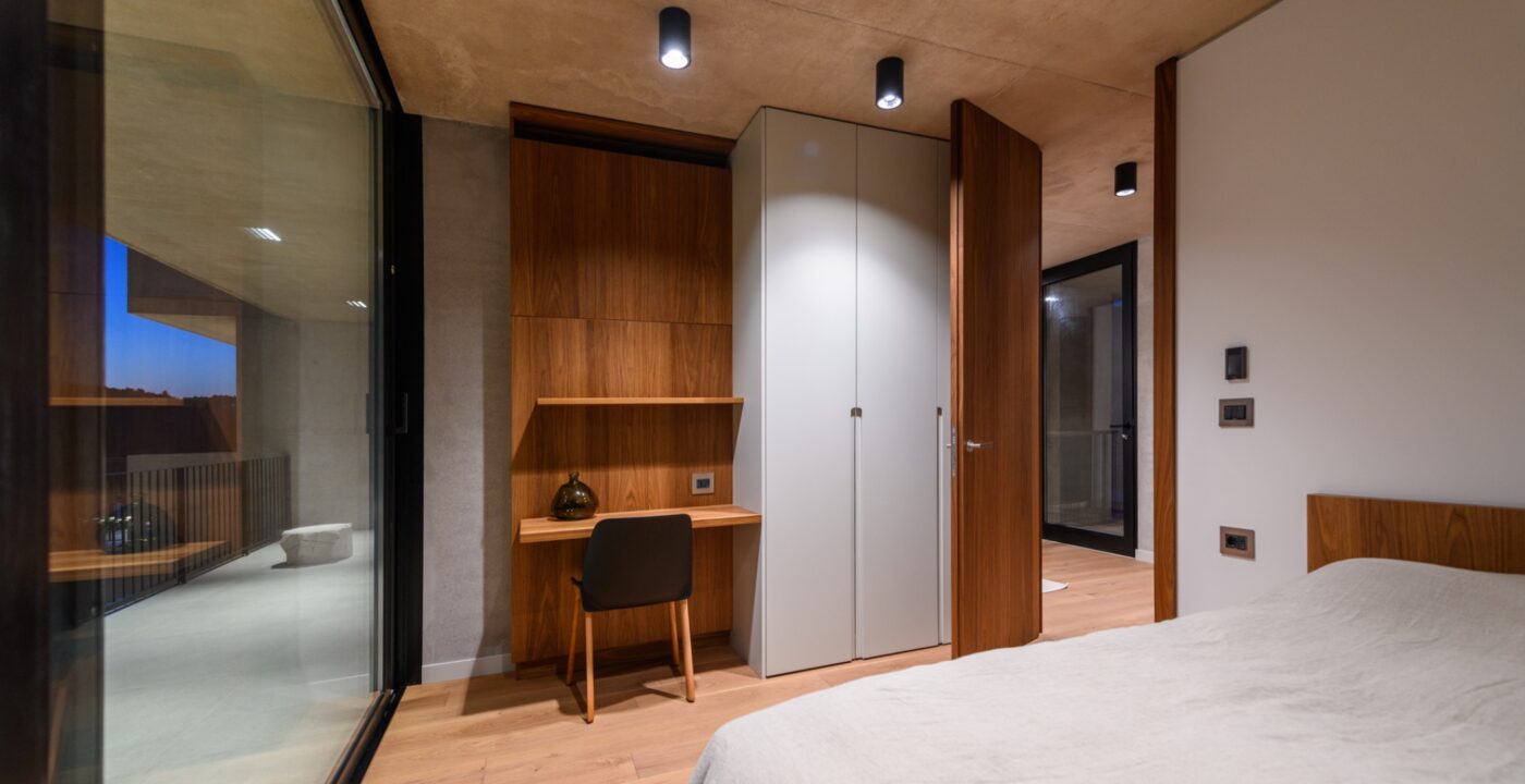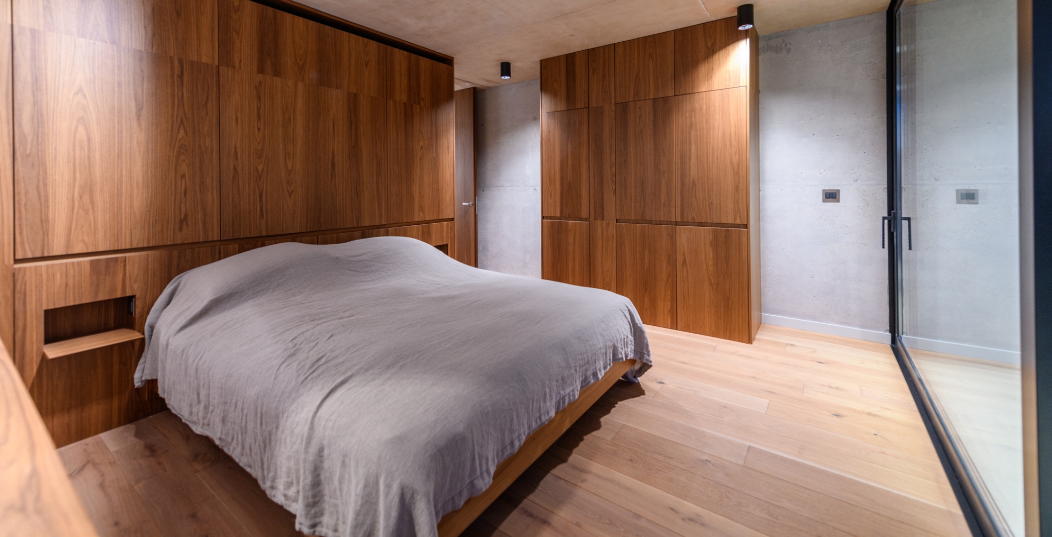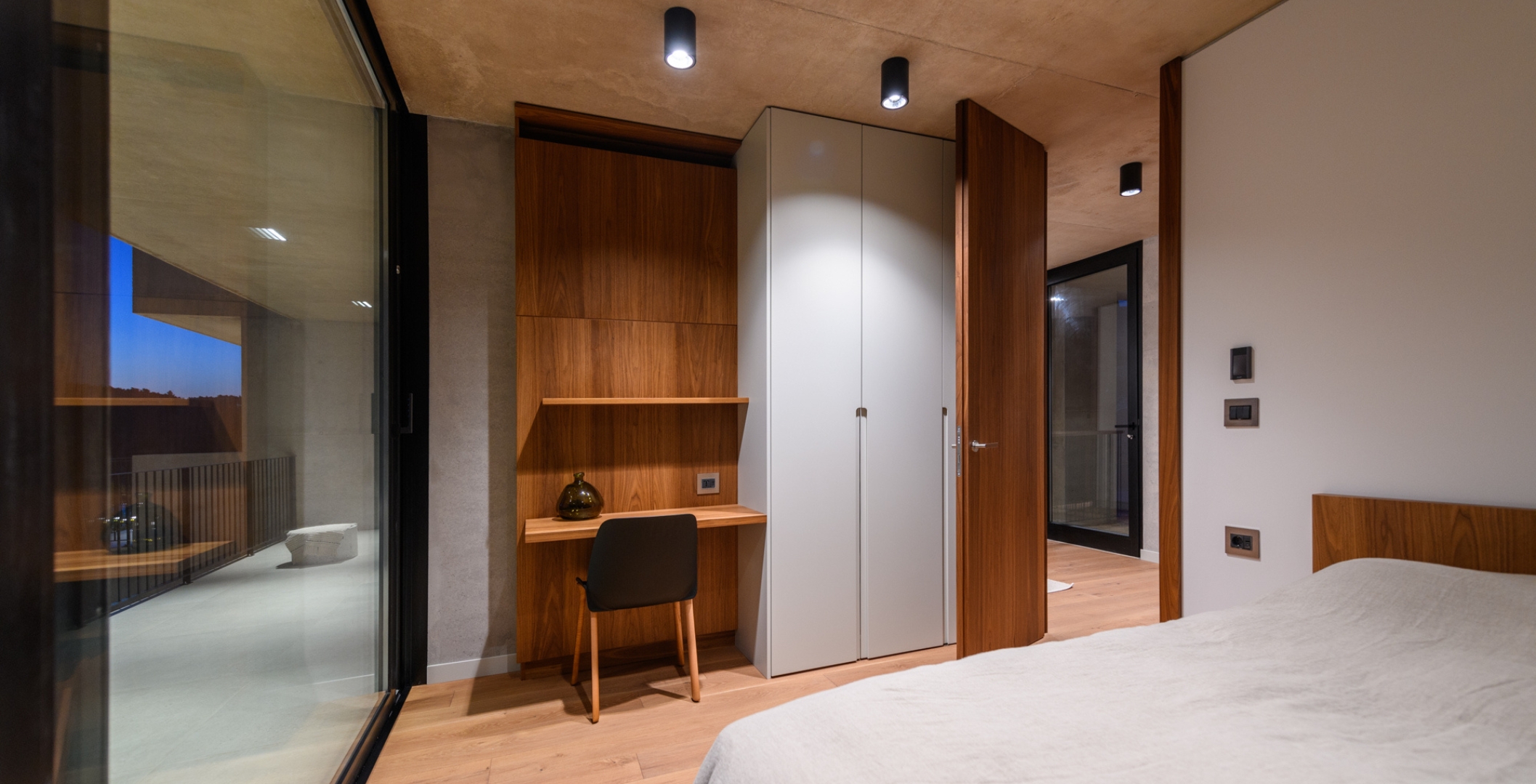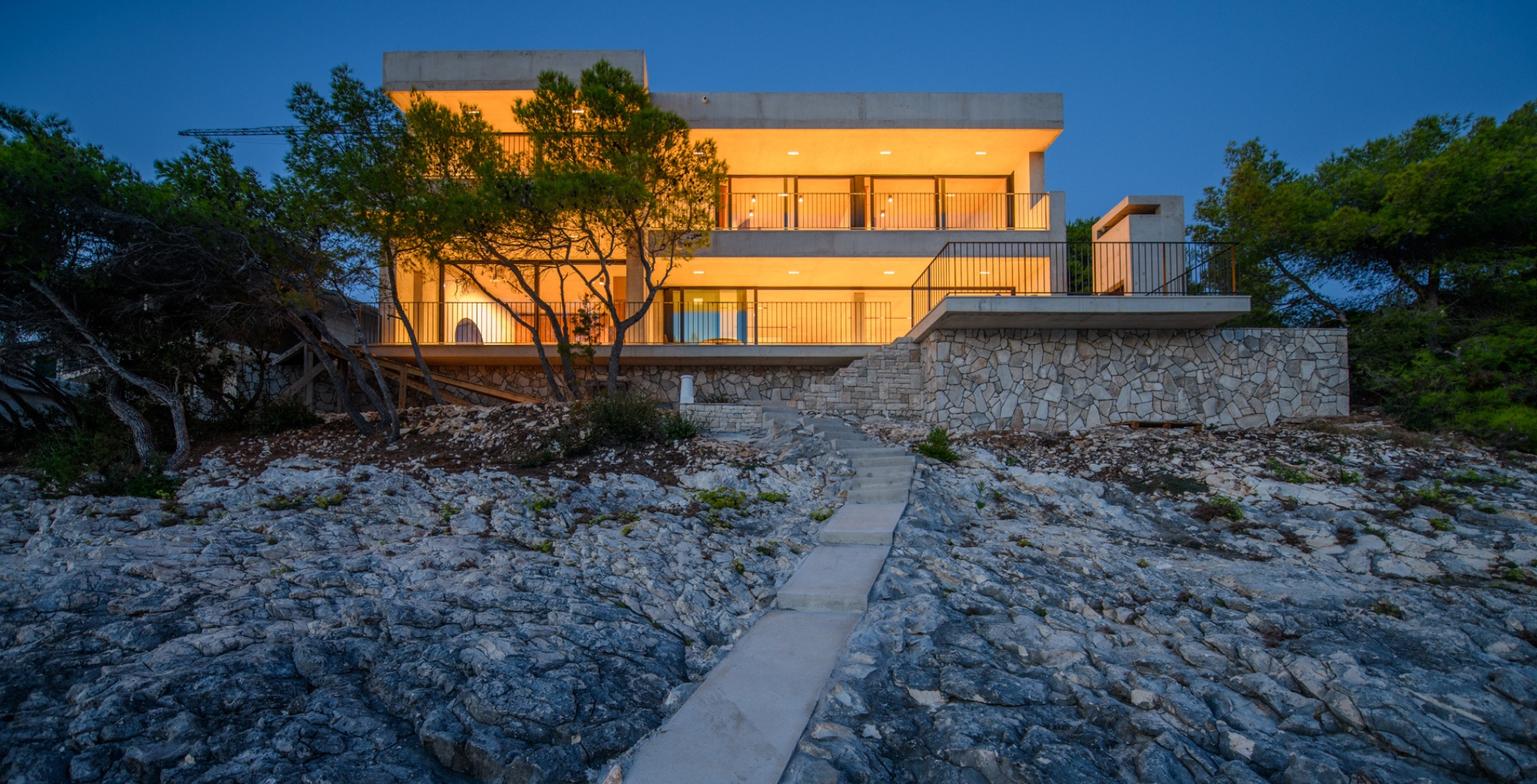 Family house in the Korčula bay Tri porte is located on the shore featuring unique view to the open sea with the purpose to become the second home of the owners. The house has been inspired by the work of the famous Japanese architect Tadao Andō emphasizing the reinforced concrete walls in contrast with the warm interior made of American walnut wood. Huge glass openings and mirrors that reflect the sea make the feeling of connection with nature even stronger. Černelić Interior Solutions, based on the vision of the owner, has developed the interior project with all technical details, produced and installed all the interior elements and furniture to create a unique interior experience.