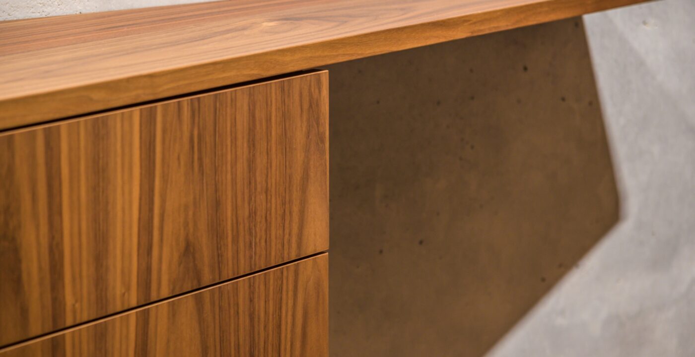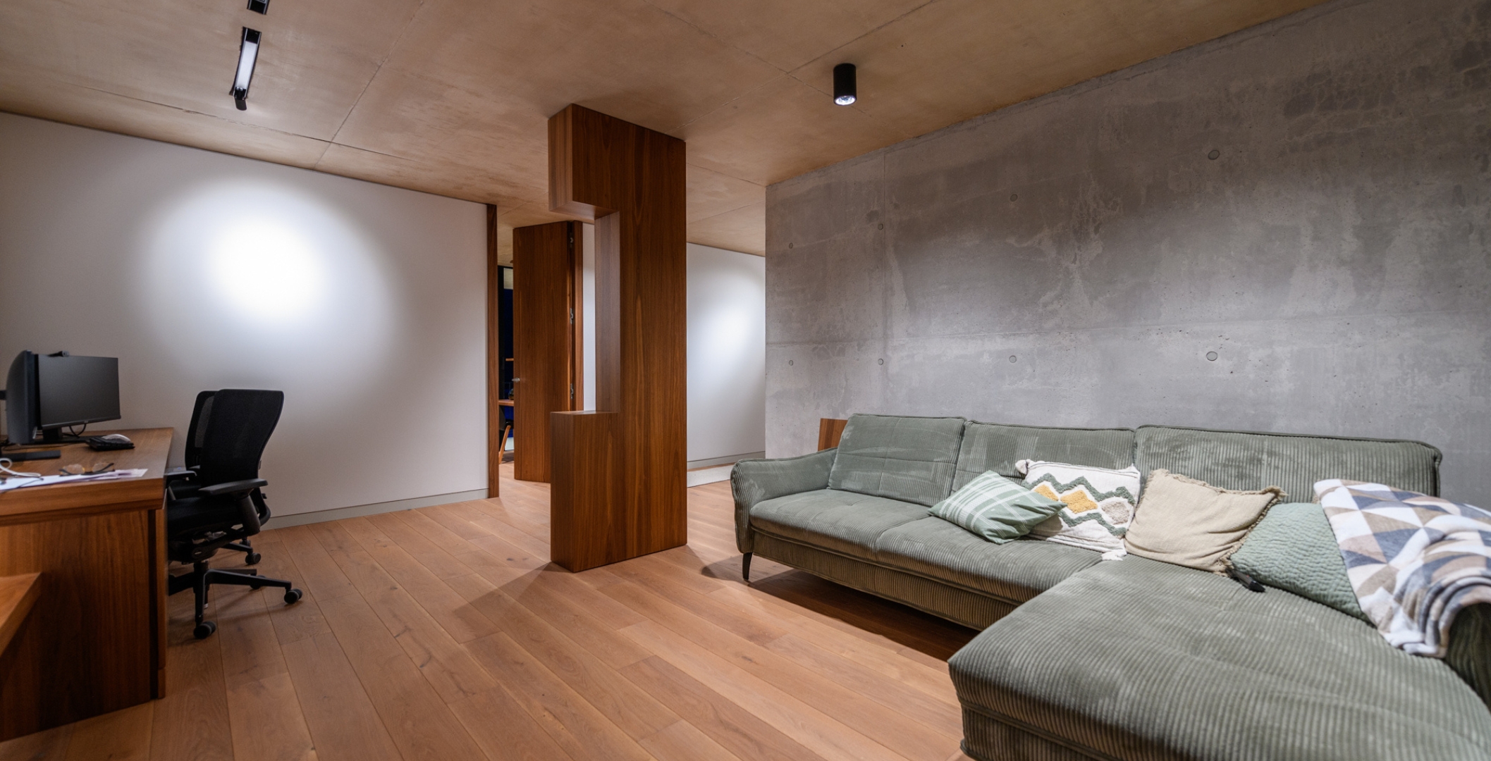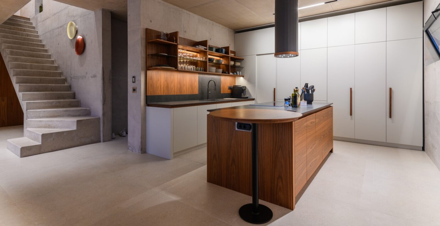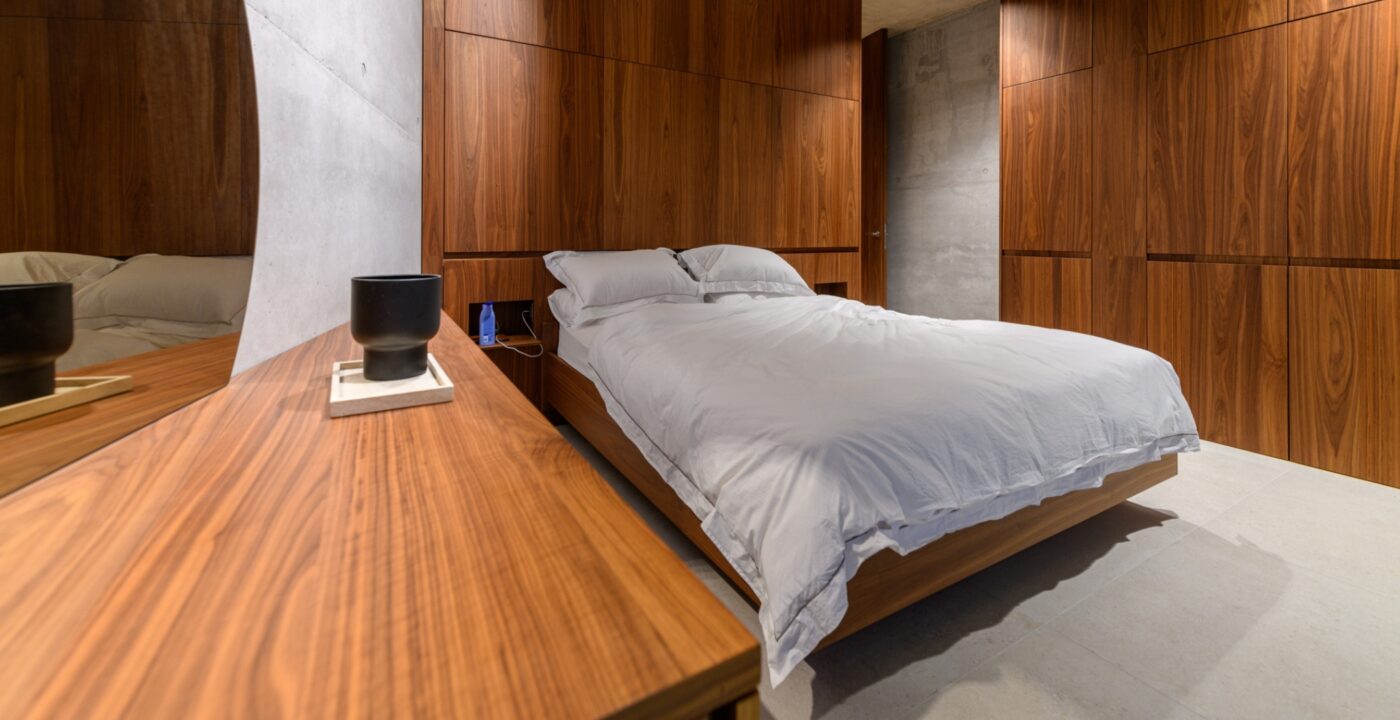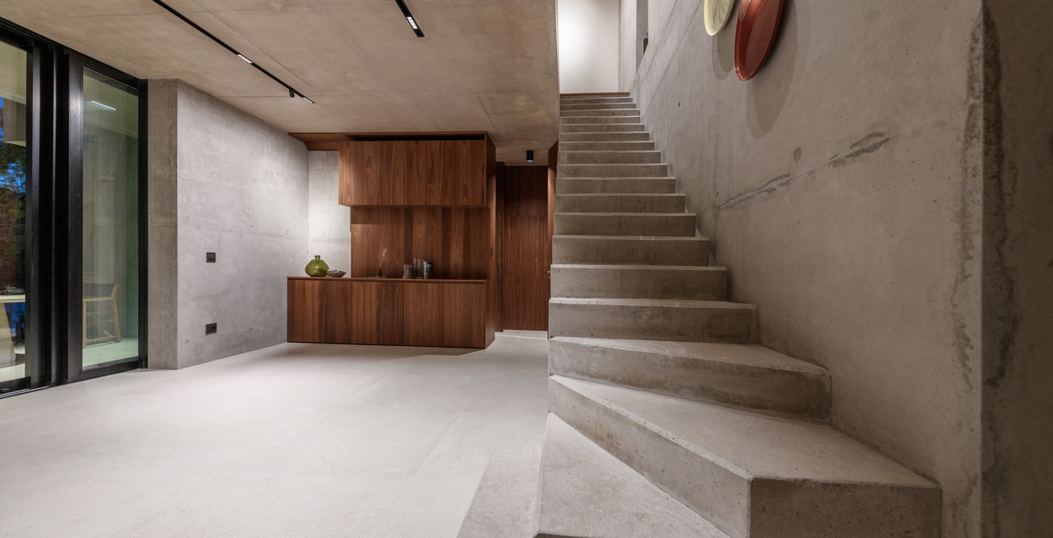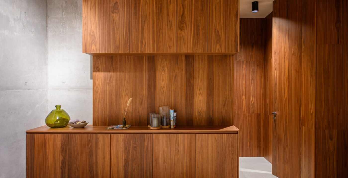 Family house in the Korčula bay Tri porte is located on the shore featuring unique view to the open sea with the purpose to become the second home of the owners. The house has been inspired by the work of the famous Japanese architect Tadao Andō emphasizing the reinforced concrete walls in contrast with the warm interior made of American walnut wood. Huge glass openings and mirrors that reflect the sea make the feeling of connection with nature even stronger. Černelić Interior Solutions, based on the vision of the owner, has developed the interior project with all technical details, produced and installed all the interior elements and furniture to create a unique interior experience.