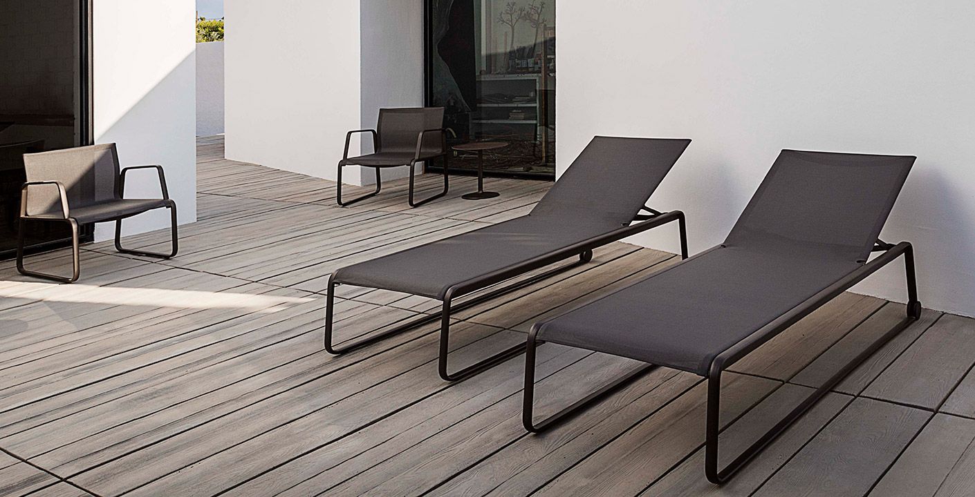 Aire Outdoor is composed of armchairs, lounge chairs and chaise lounges. The use of technology provides this design with a light, subtle and balanced character, which adapts to many types of outdoor environments. Developed according to the highest quality standards for materials such as injected aluminum elements in combination with extruded aluminum shell and the steel sled with anti-oxidation molecular EPL5 treatment, and self-supporting mesh fabric, ensuring its durability, great comfort and easy maintenance. The collection is offered in steel EPL5 finishes colors of earth brown earth and white and in different batyline colors of white, sand, graphite, grey and dark grey basalt stone. The armchair, lounge chair and chaise lounge are all available with optional cushions for each respective version. The chaise lounge, with a design of essential lines that transmit serenity and lightness, and is constructed with a durable aluminum and steel frame, it is offered with a reclining backrest and optional incorporated wood wheels.
