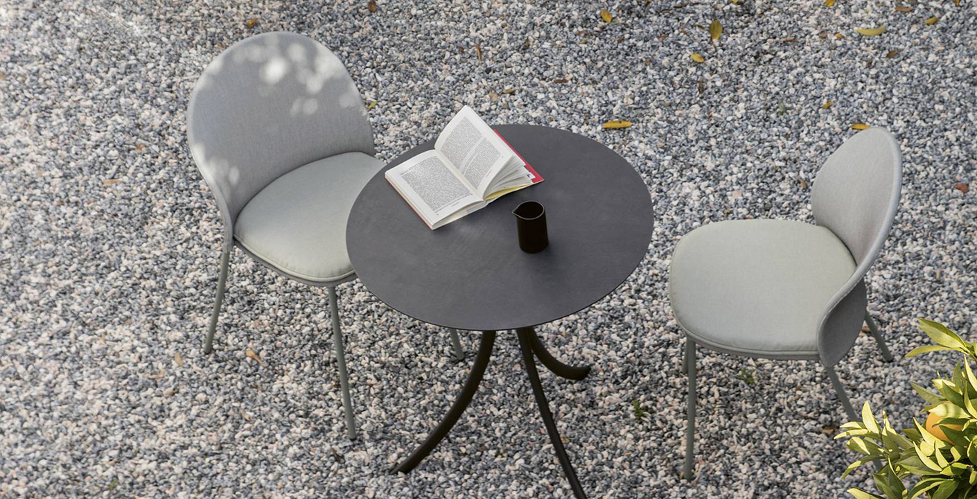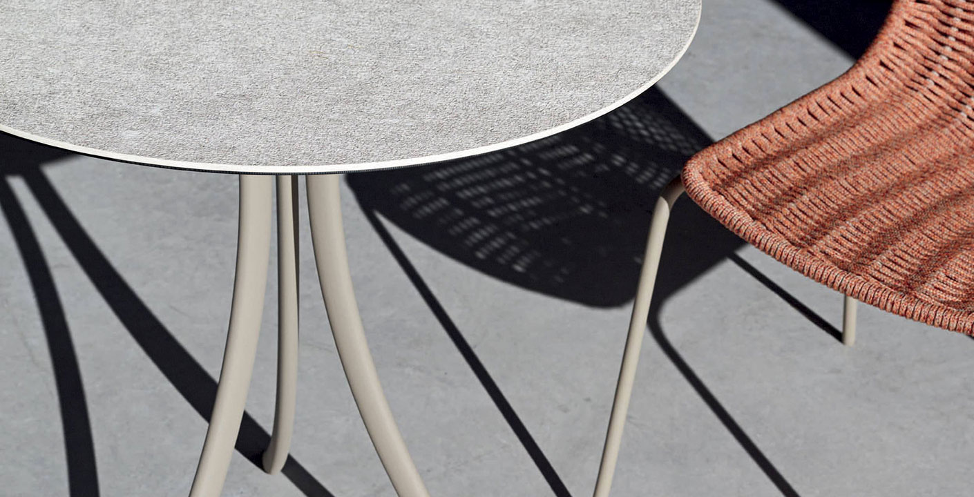 Structure made of oval stainless steel tube, finished with polyester powder. Tabletop options: HPL Trespa® 8 mm thick