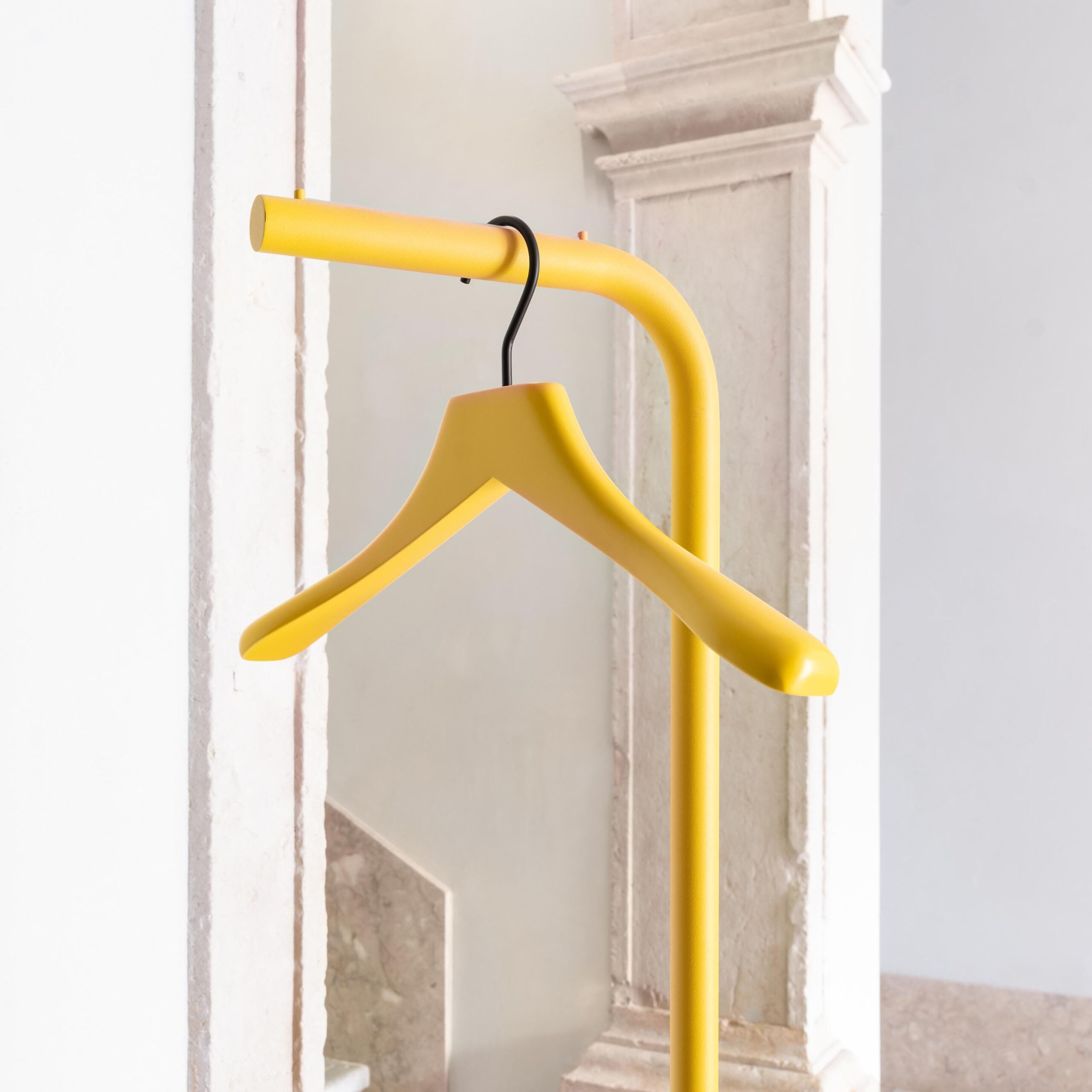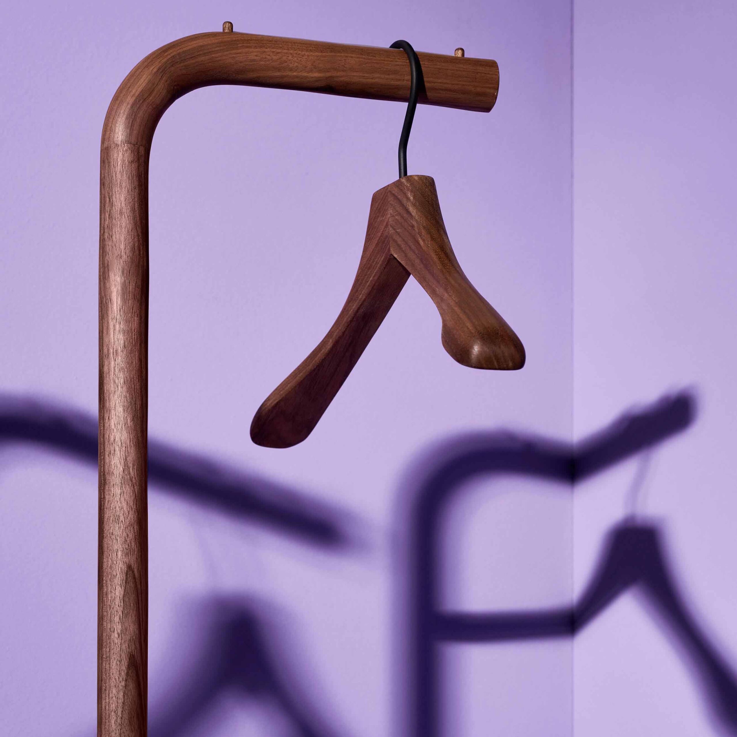 Coat stand…A creative focus on the essentials can result in a purist interior highlight – and the BOW coat stand proves it. Its delicate proportions belie its true strength. Strikingly, the post is positioned towards the side of the foot plate, giving BOW the look of an oversized bracket, especially from the side. It comes with a post of solid oak or walnut with an oiled, natural finish, or in oak with an open-pored finish painted in black. Alternatively, BOW can be ordered in steel with a finely textured powder coating in a choice of colours. The flat steel foot plate is finished to match, with either a powder coating or a veneer. On top of the hanging rail, an almost invisible flat plastic strip protects it from moving hangers. BOW is a handy addition for any interior and ideal even for tight spaces. Its unfussy appearance also makes it the perfect business partner for offices or practices. Maximum minimalism.