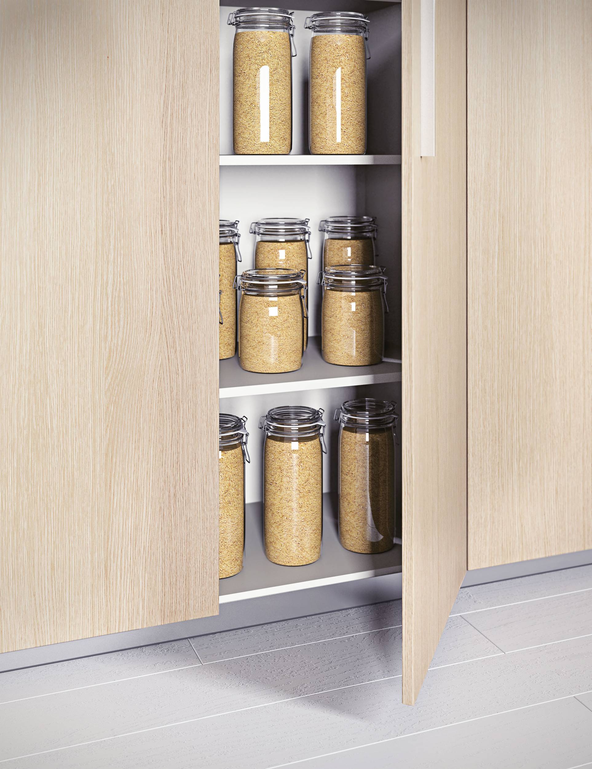 Organized wall with 50 and 100 cm wide modules with a shoulder bearing assembly system according to standard heights, with compensation modules up to the ceiling or in door frame heights with panel to measure. It is made up of structural elements, doors and backboards in laminated wood panels and inner shelves in wood or metal