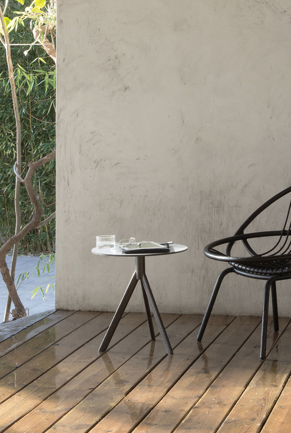 Structure made of oval stainless steel tube, finished with polyester powder. Tabletop options: HPL Trespa® 8 mm thick