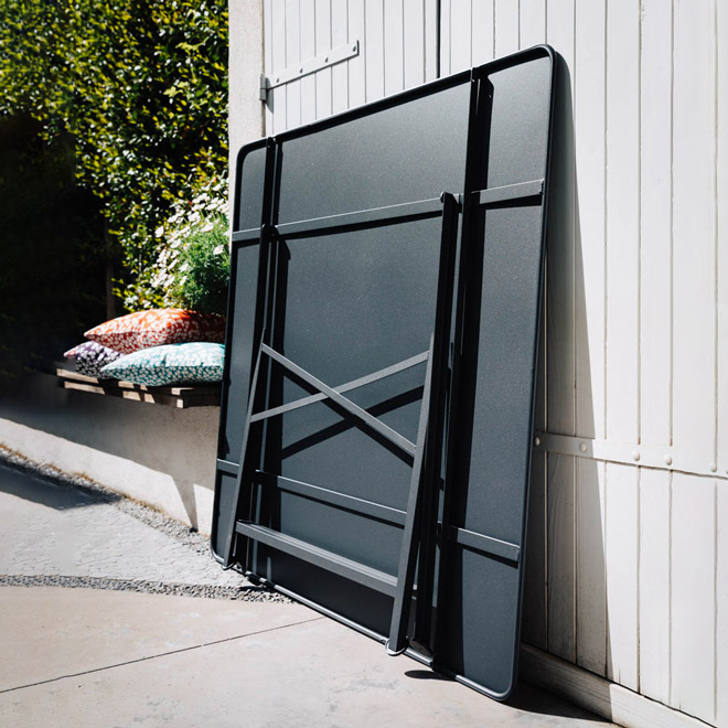 Cargo is where simplicity and practicality meet resistance and stability: it can be folded away or opened up in a trice, and can accommodate up to 8 guests around its square tabletop, offering optimum seating comfort thanks to its central leg.