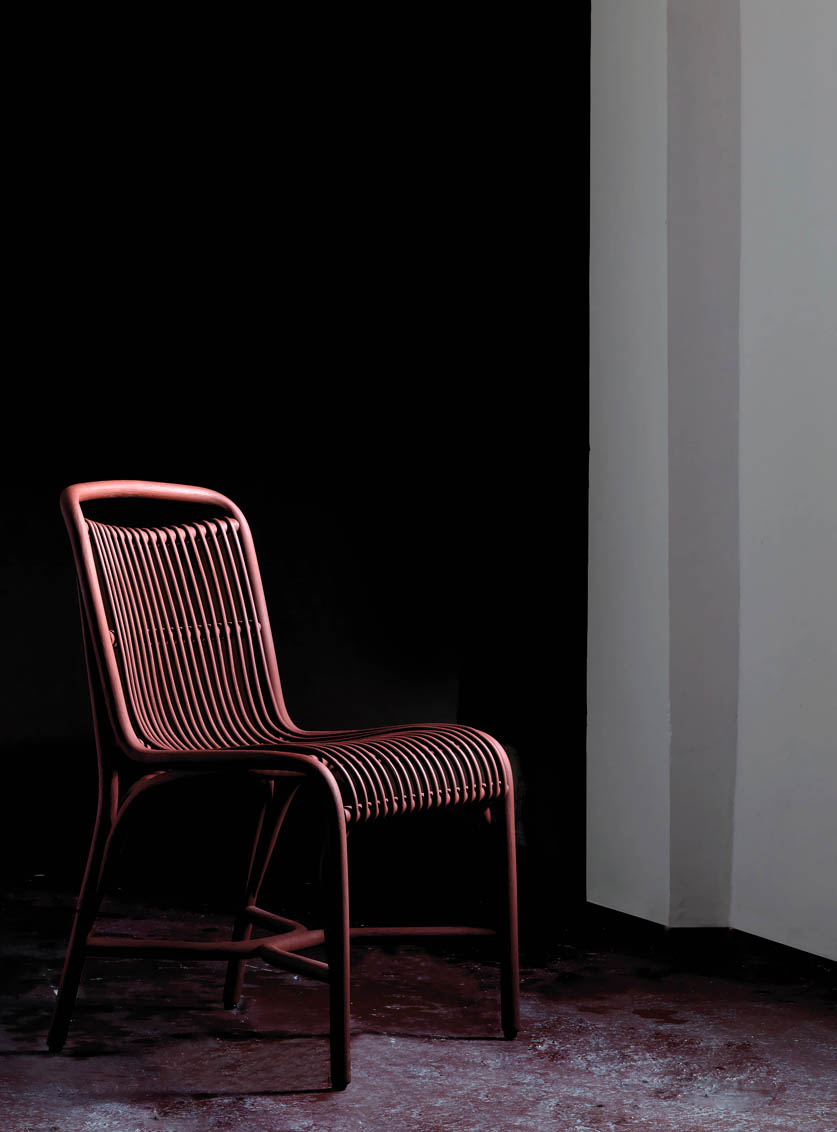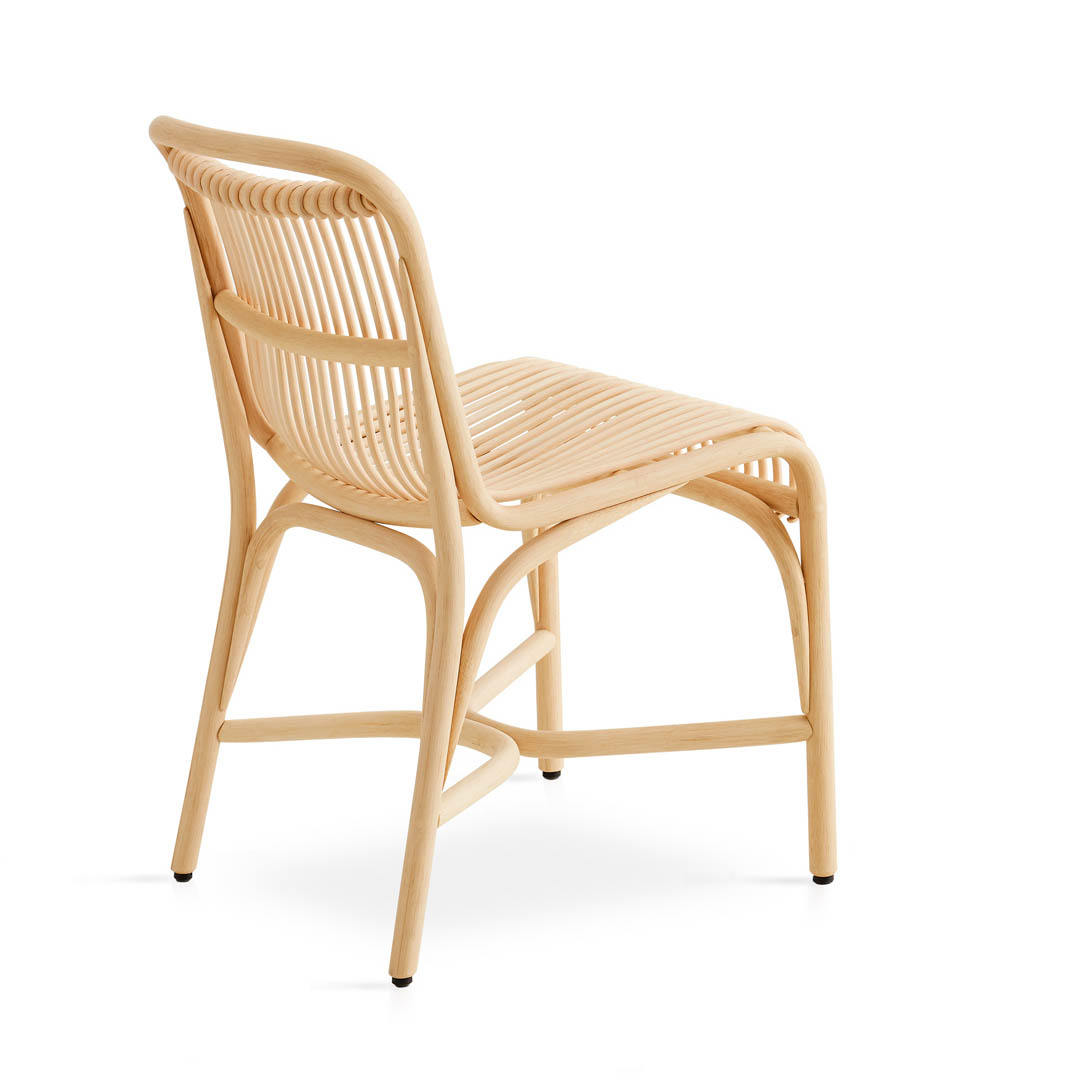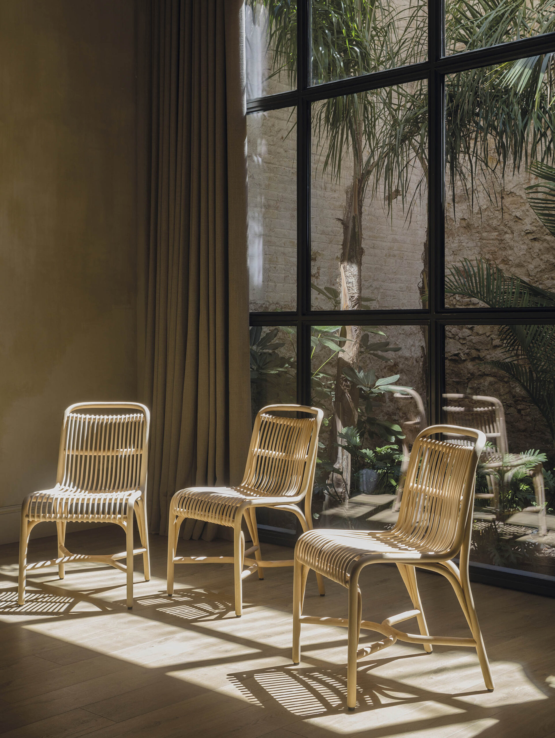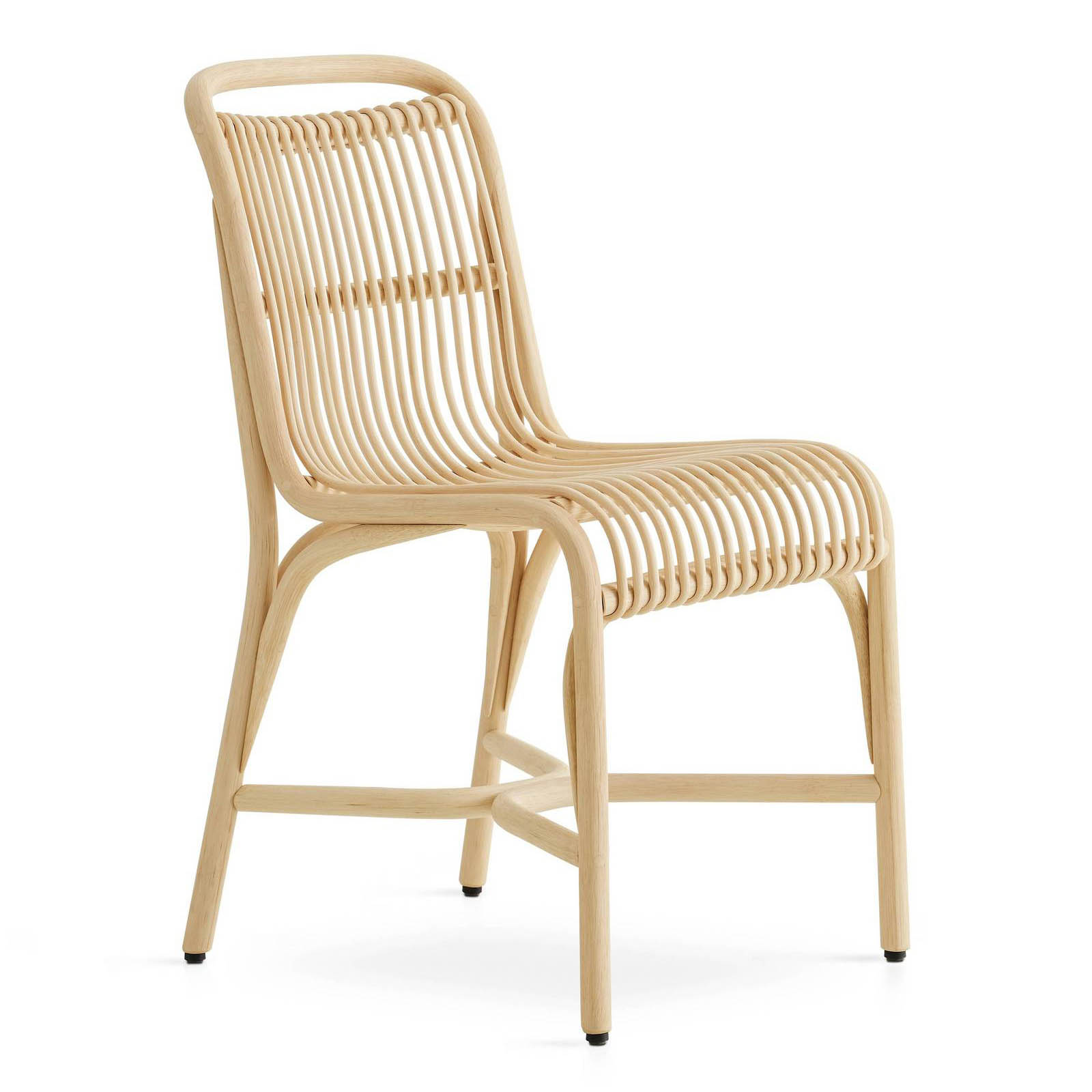 Chair with structure made of peeled natural rattan 28 mm/1.1” in diameter. Seat and backrest manufactured with peeled natural rattan 10 mm/0.4” in diameter. Finished with a three step coating (dye, base coat and top coat) highly resistant to solar radiation thanks to UV filters. Optional cushion with upholstery available in: natural or faux leather, virgin wool fabrics, velvet and polypropylene. Protective caps with removable plastic-felt inserts.