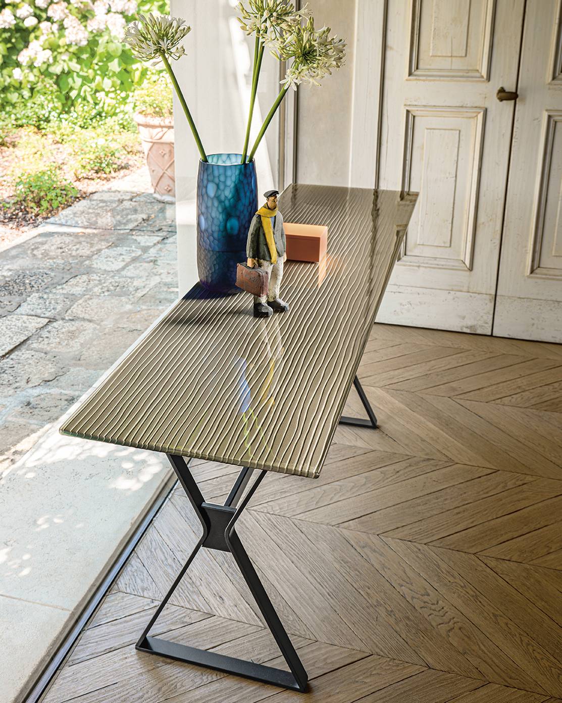 Console with 12 mm fused, tempered and back-lacquered glass top with metal shades Lava Grey, Copper Brown or Champagne. Metal painted base, “Lava Grey” finish.