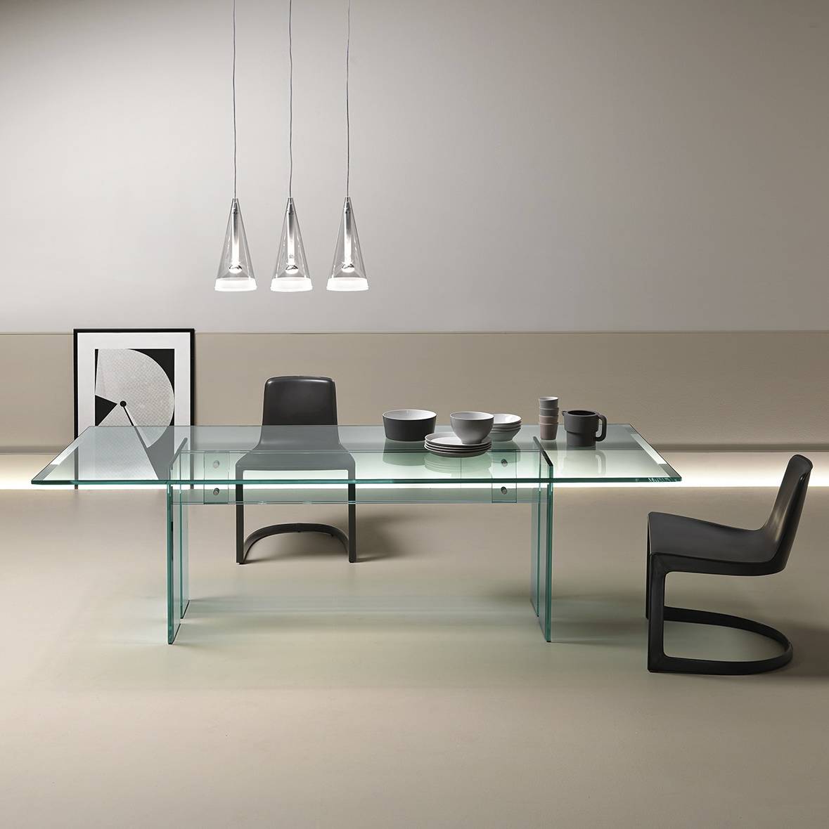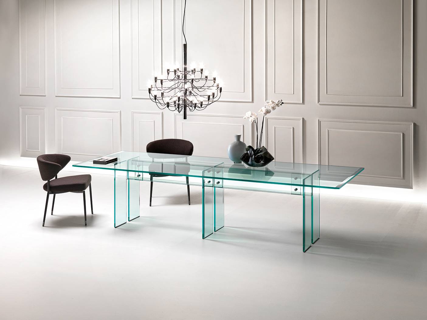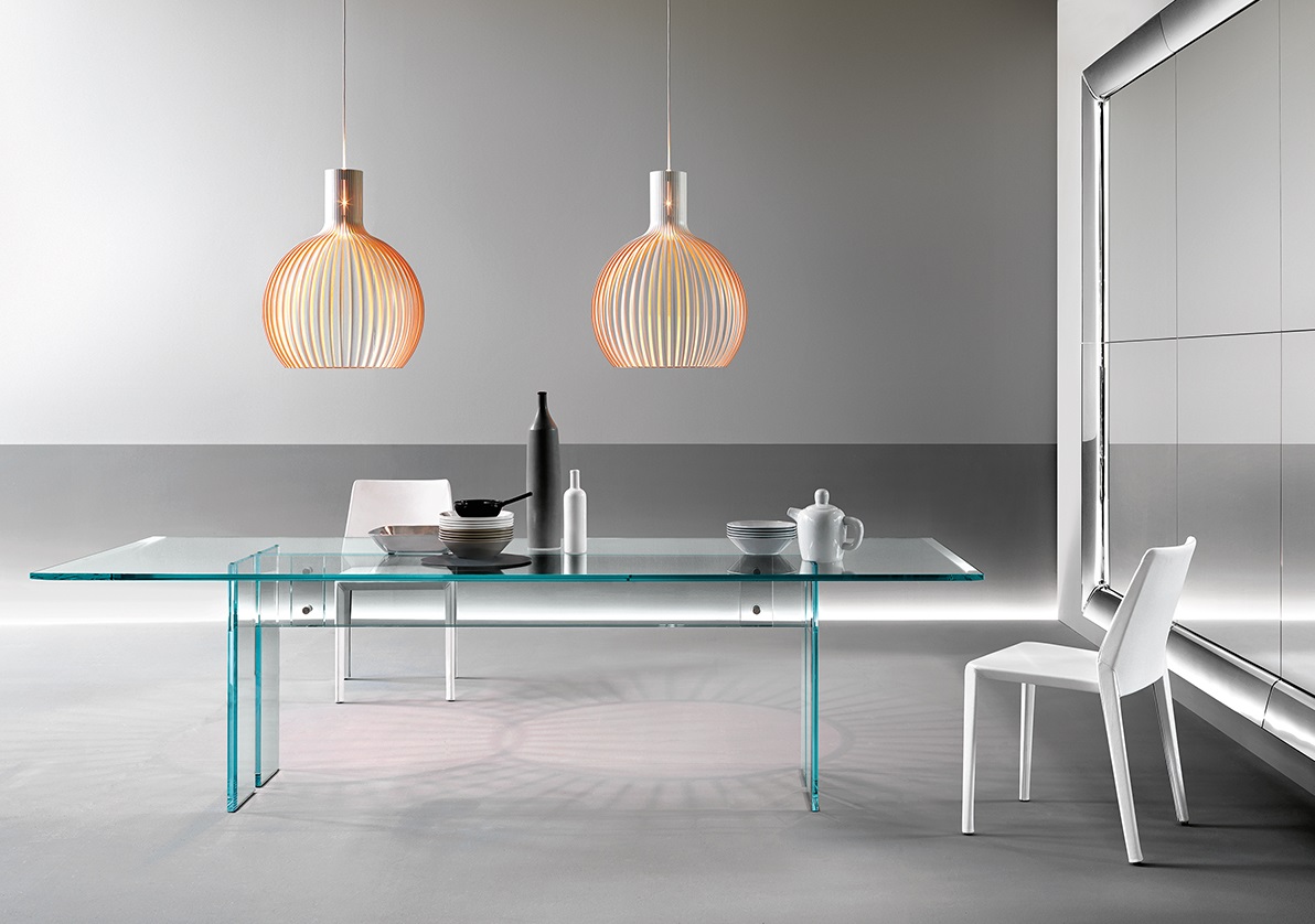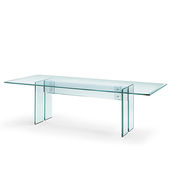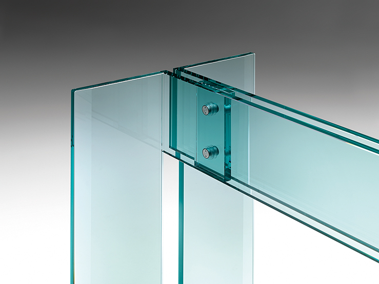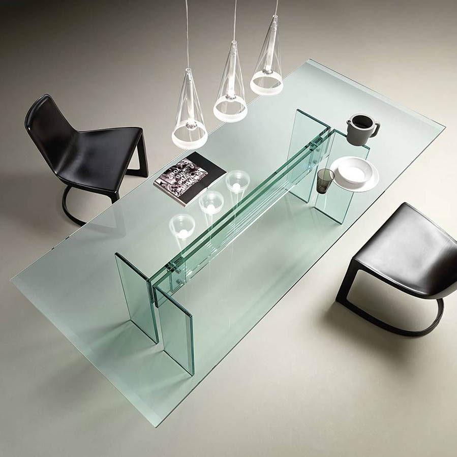 Table composed of a 15 or 19 mm thick transparent glass top with bevelled edges on the two shorter sides and of a base in 15 or 19 mm thick transparent welded glass with bevelled edge. Fastening elements in stainless steel. The Table LLT can be fitted with two or three bases depending upon the top length. LLT table is also available with custom-sized top up to 360×100 cm.