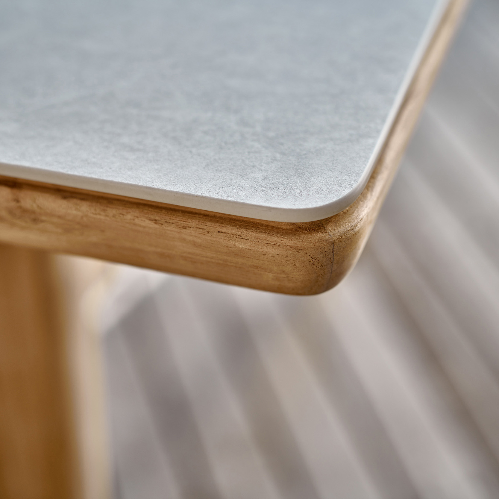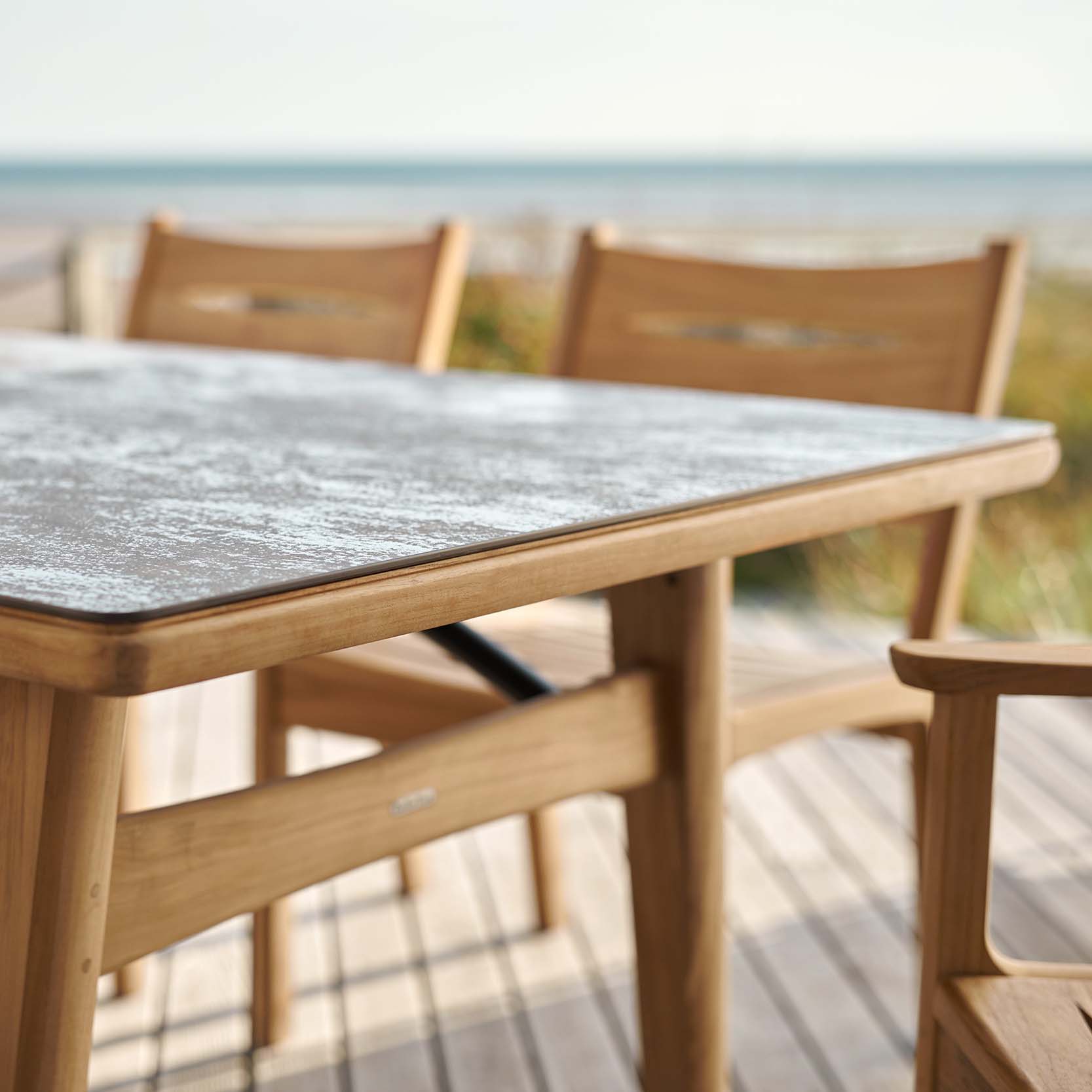 This range of furniture combines teak with the latest materials, Italian High Fired Ceramic table tops and Textilene® cord in the chairs.