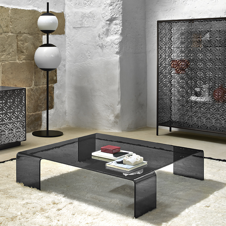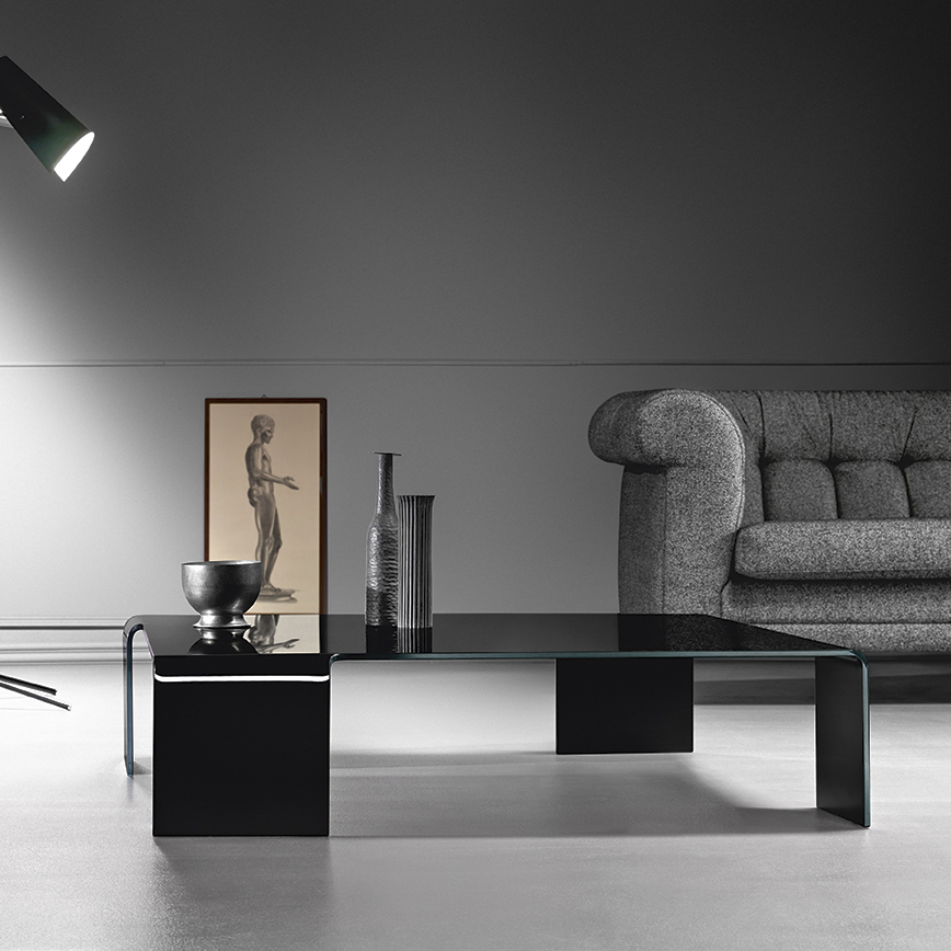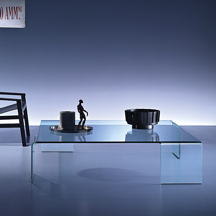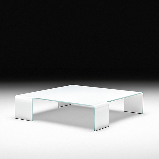 Monolithic coffee table in 12 mm-thick curved glass. On demand also available in extralight glass, extralight white back-stained glass and in black back-stained glass.