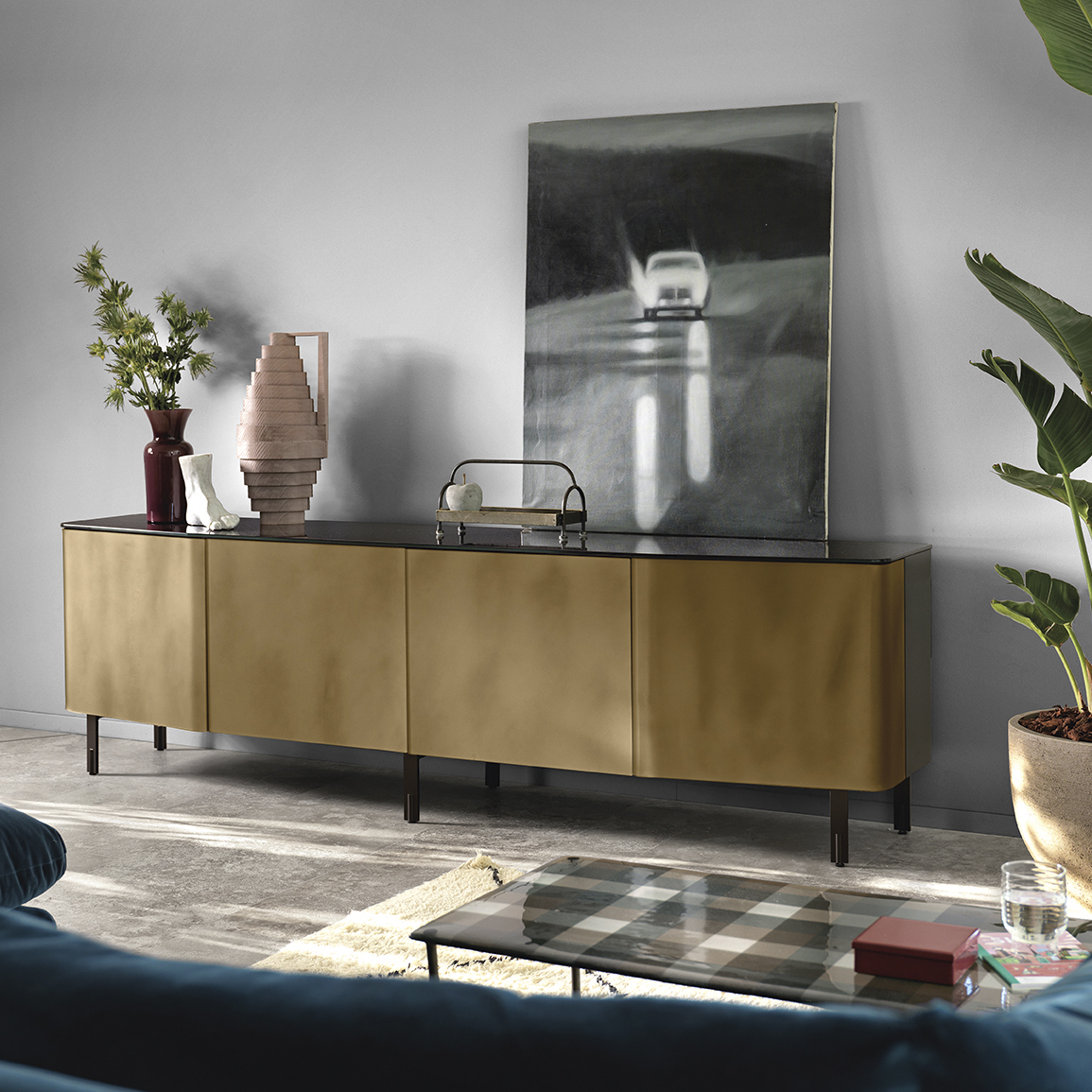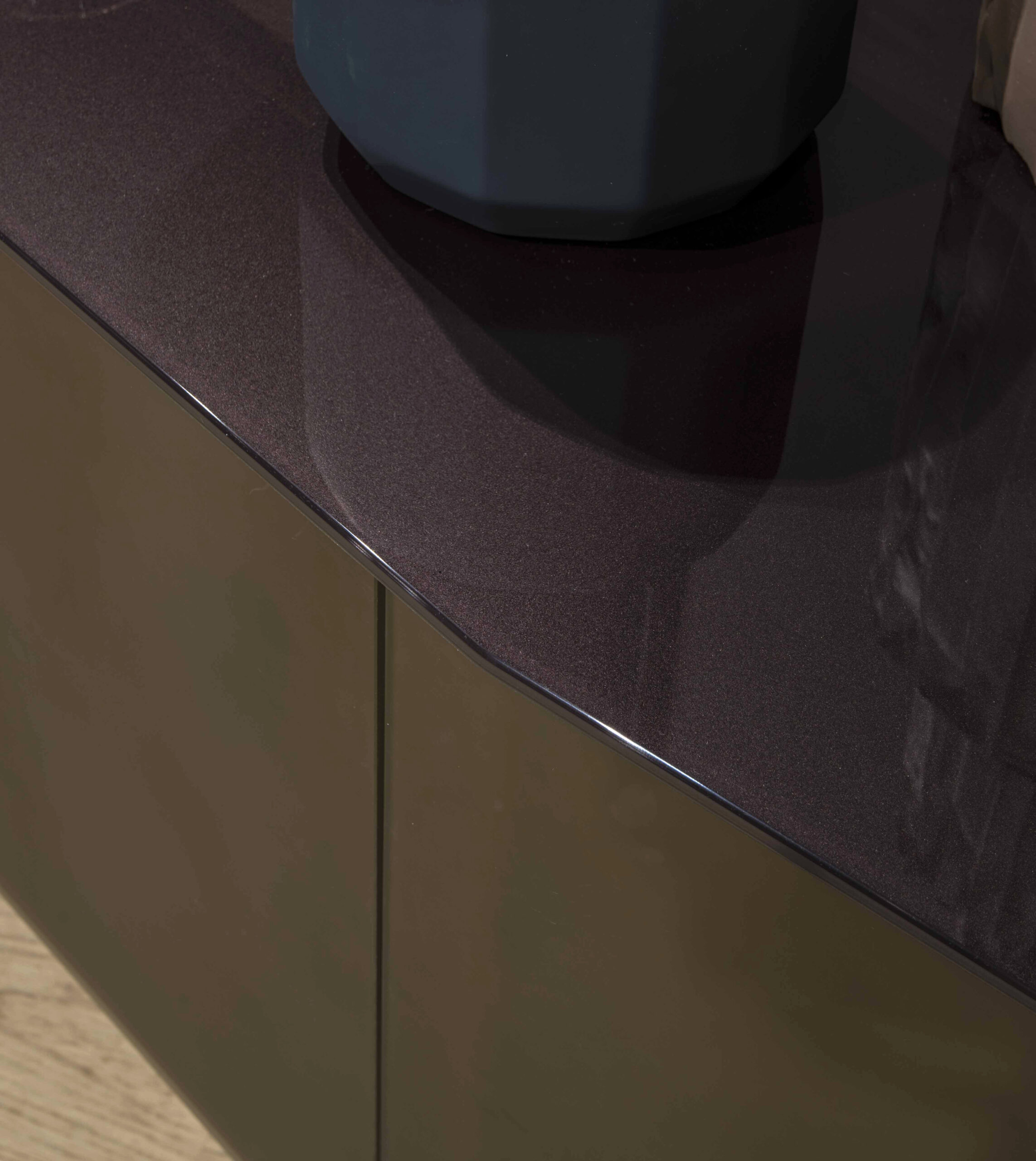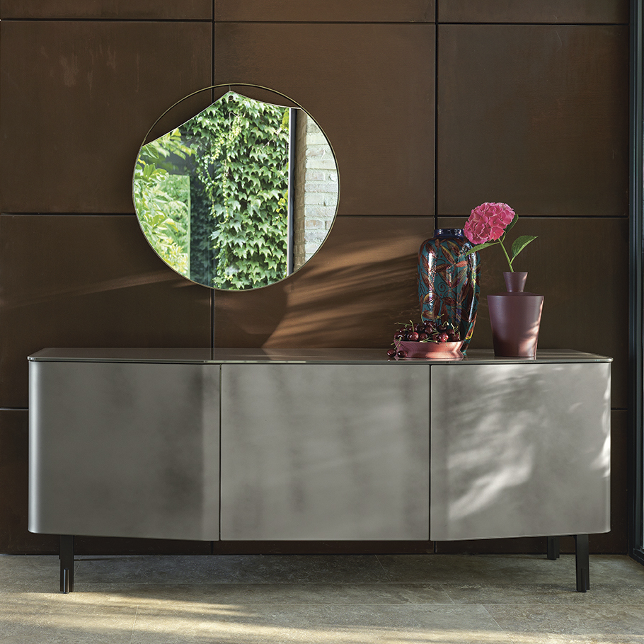 Cupboard with “Lava Grey” lacquered wood structure, doors in 6 mm curved extralight acid-etched glass, back-lacquered with special finish, textured effect. Top in 10 mm back-lacquered extralight glass.