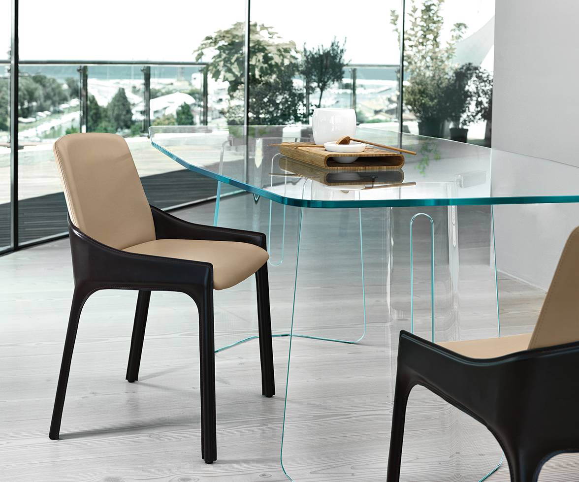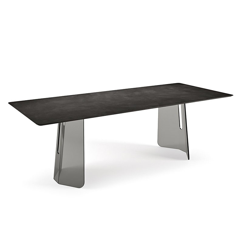 Table consisting of two 12 mm shaped and curved extralight glass bases; top available in 15 mm tempered extralight glass.