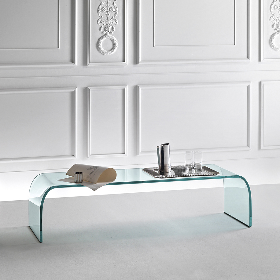 Coffee table in curved glass.
