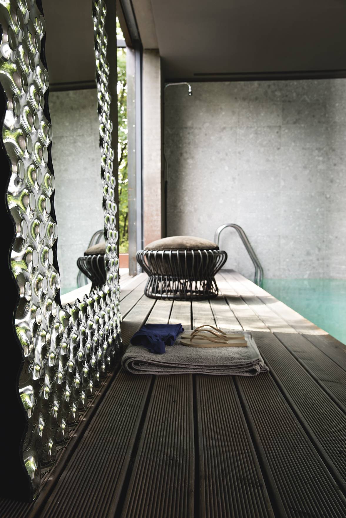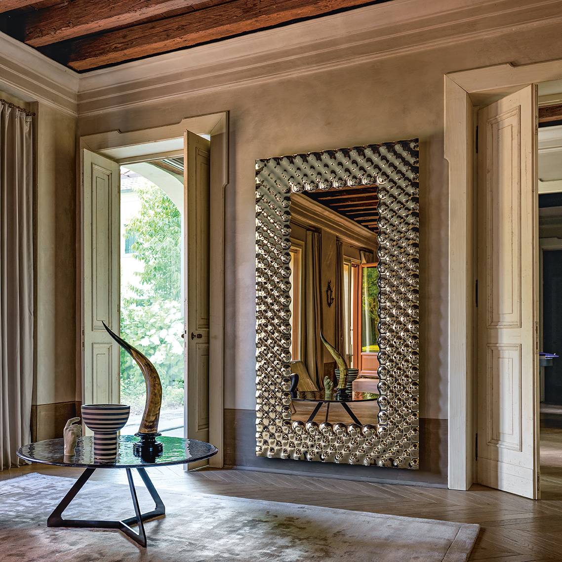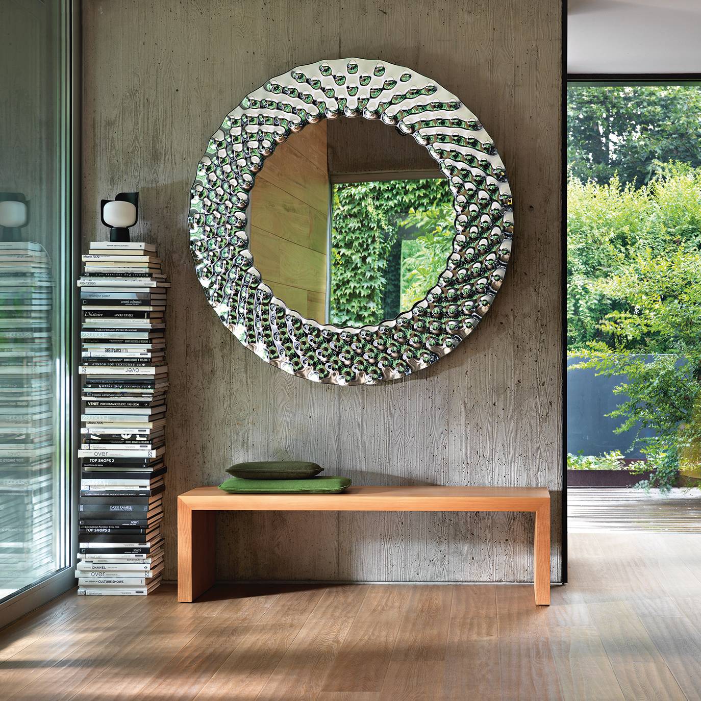 Wall mirror in 6 mm high temperature fused glass, back-silvered; 5 mm flat mirror. Rear frame in painted metal. It can be hung horizontally or vertically.
