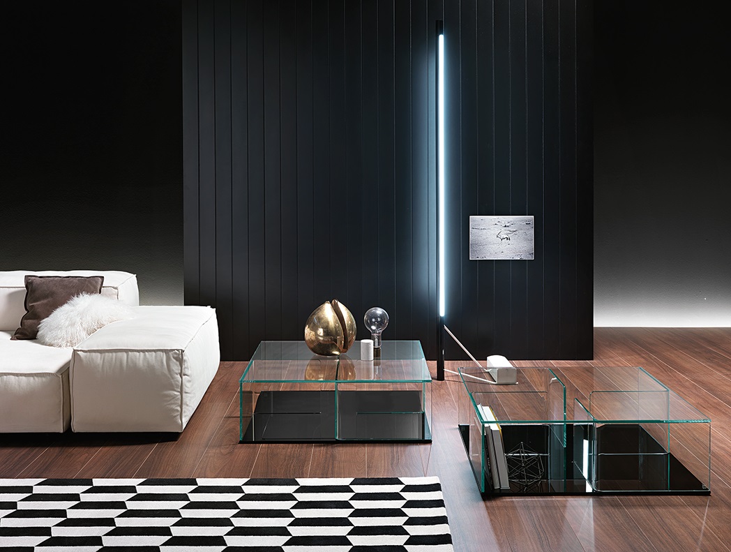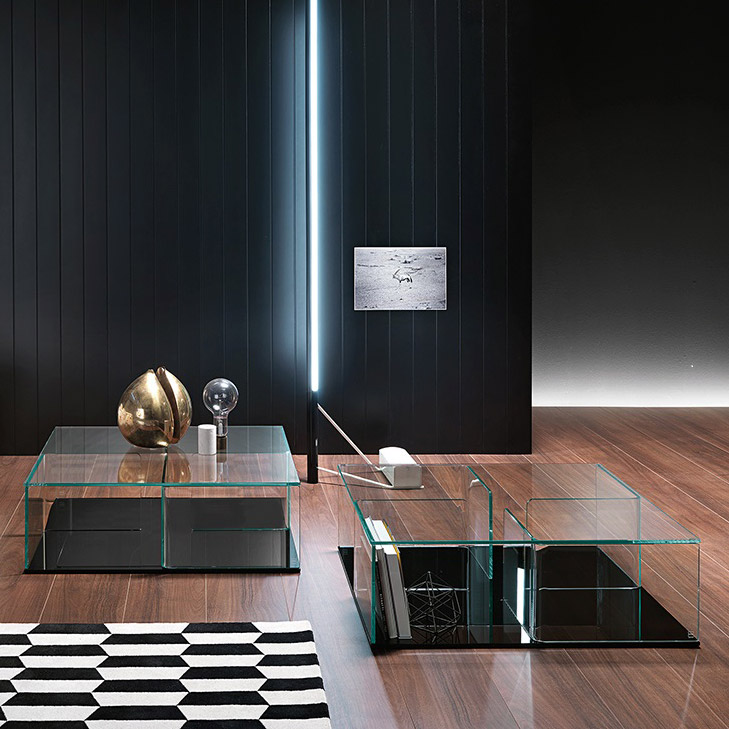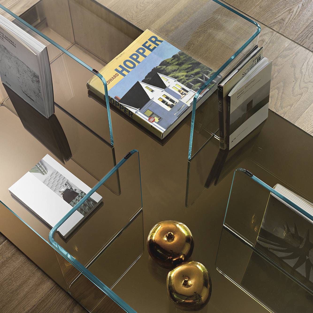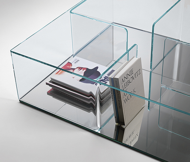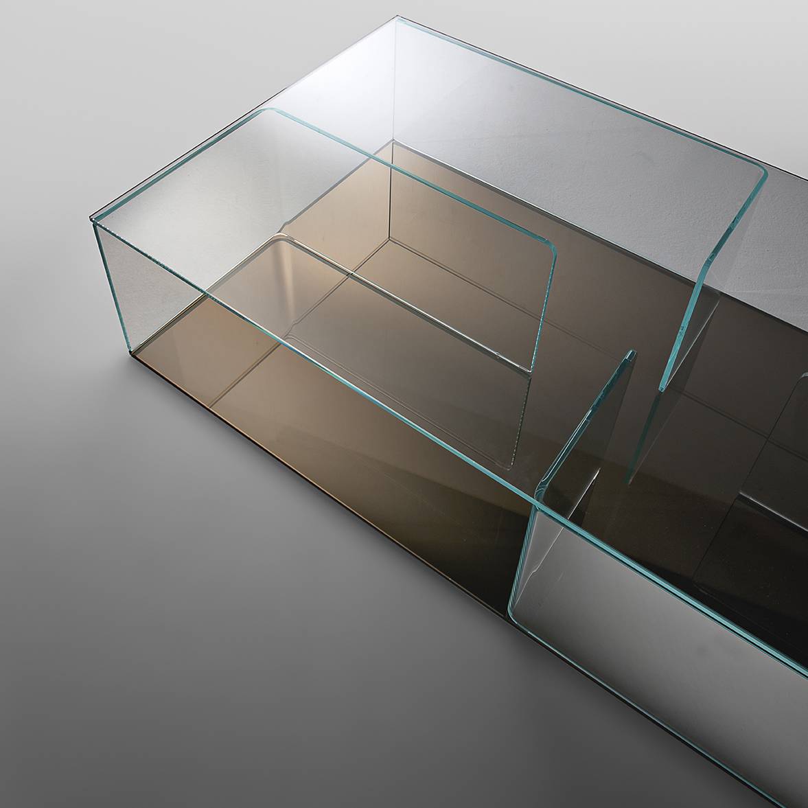 Coffee table/storage unit composed of 4 elements in 10 mm curved glass mounted between two 10 mm glass racks. Top and partitions in extralight glass, bases available in extralight glass, back-painted extralight glass, extralight mirrored glass, back-silvered bronze glass.