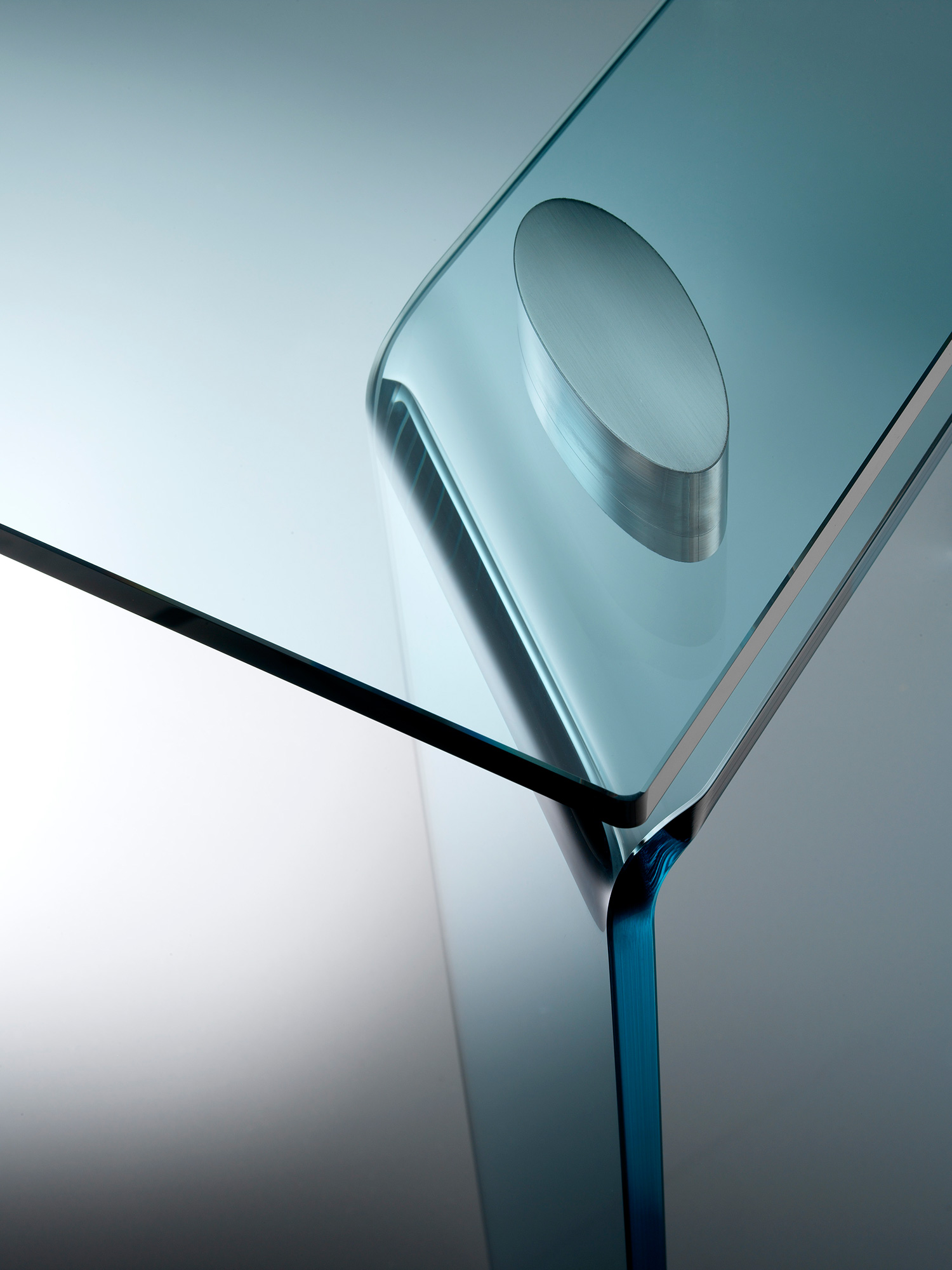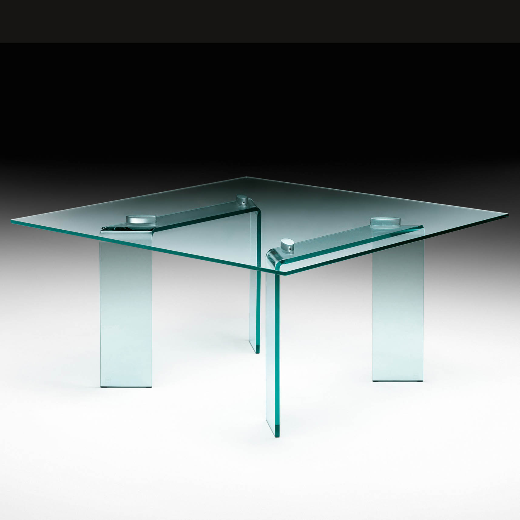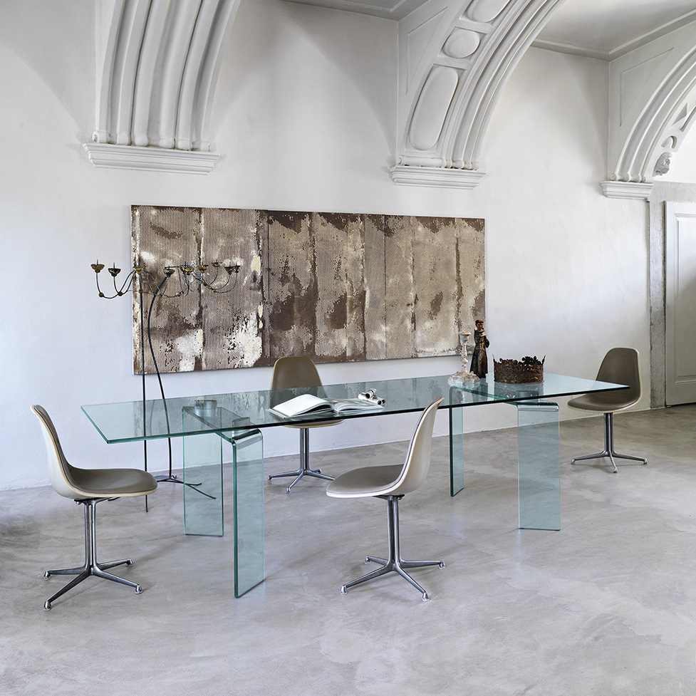 Table with 15 mm-thick glass top and detachabe legs in 19 mm-thick curved glass. Joints in aluminium with gloss finishing. The legs are placed just under the top border.