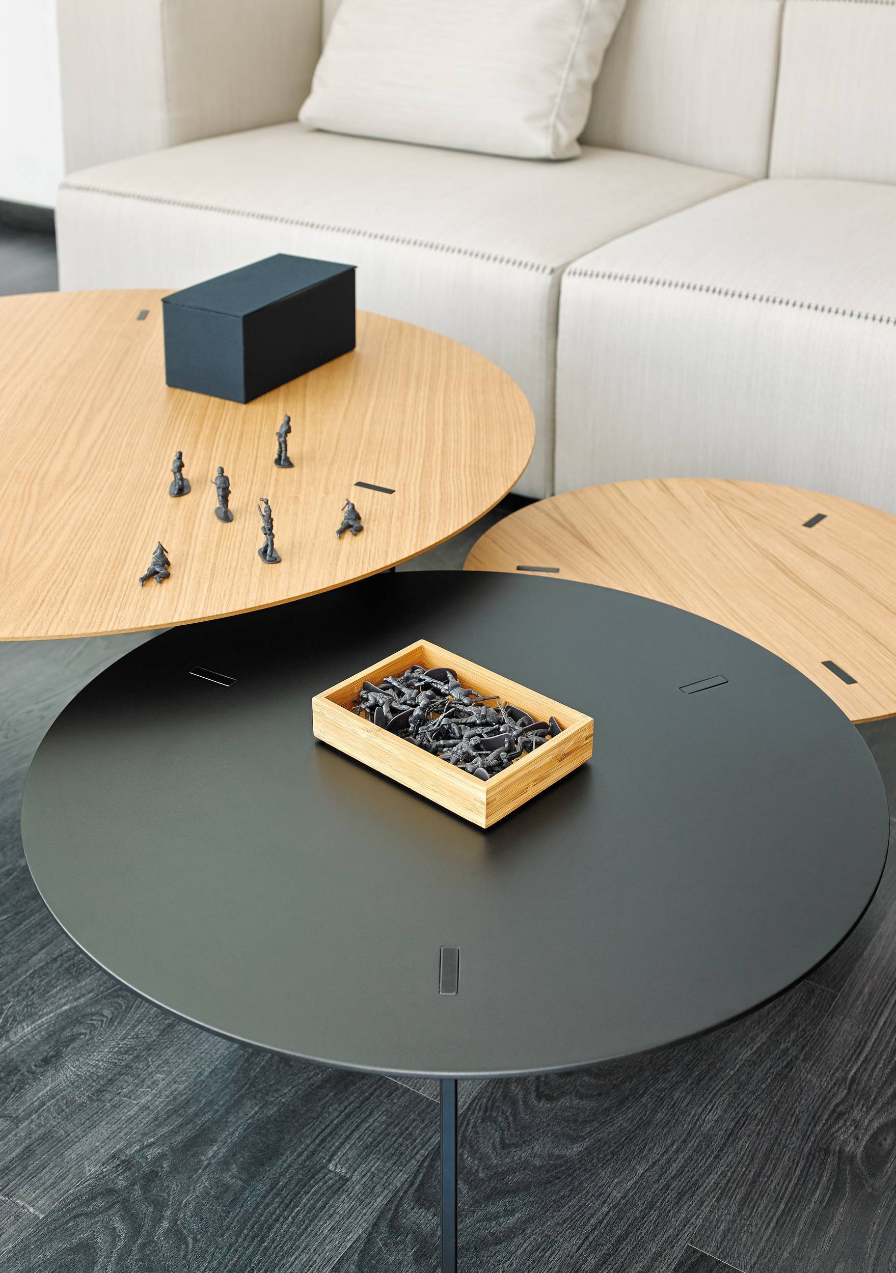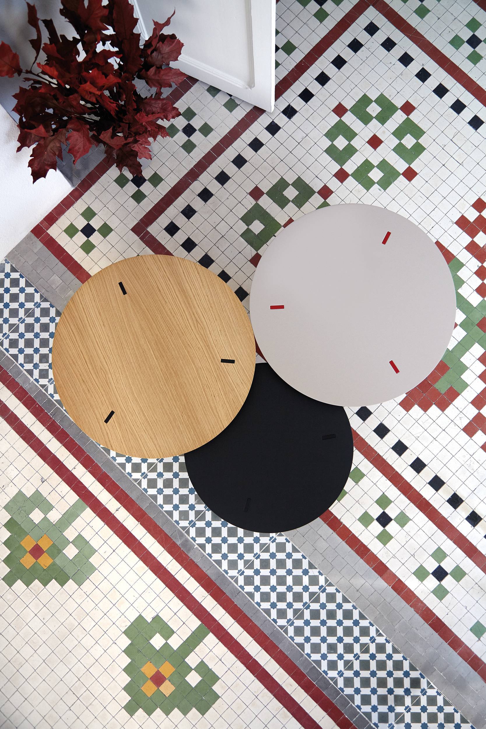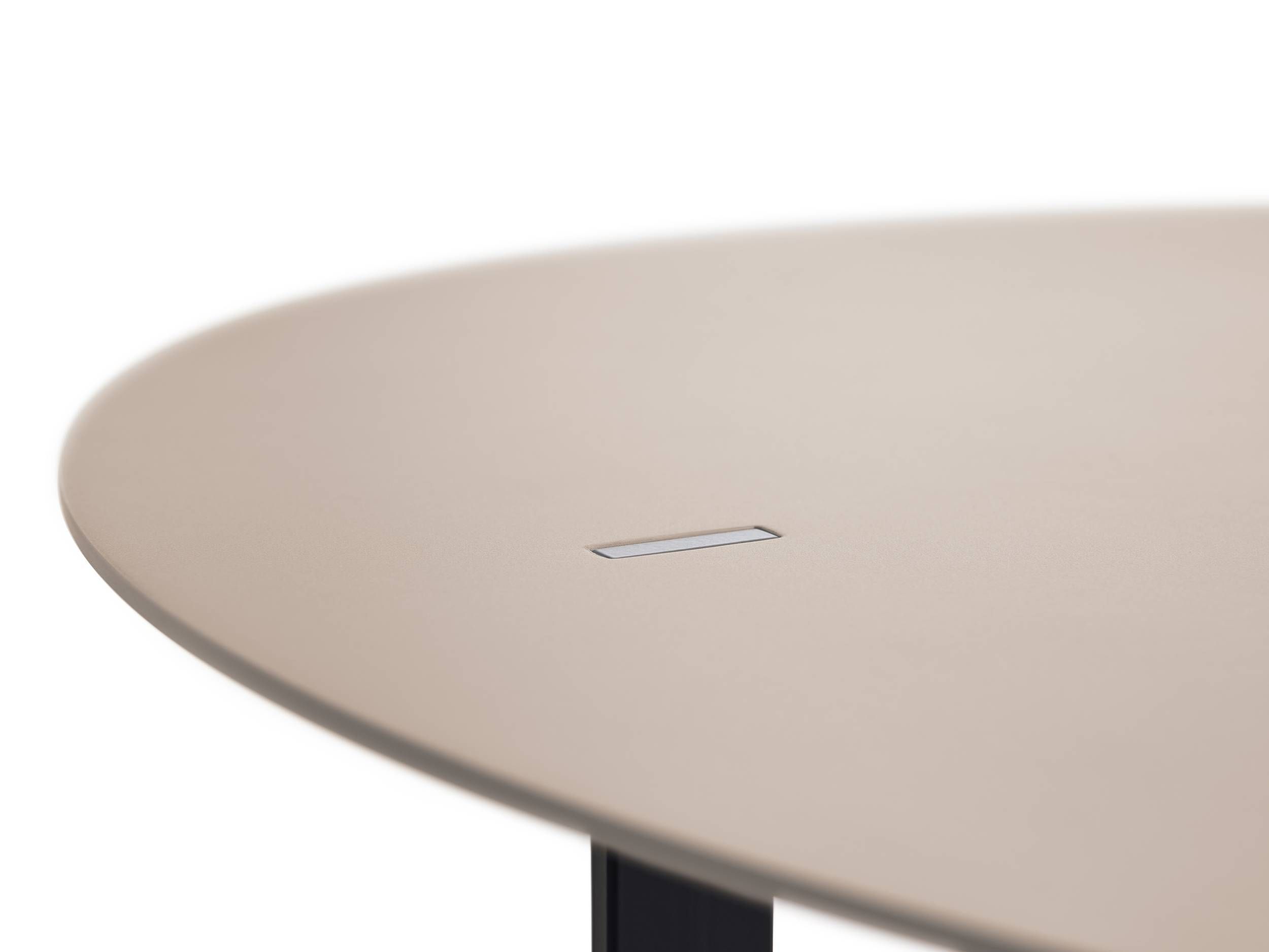 The steel legs are mortised through the top, creating a singular look. Thanks to the multiple finish options, the table can be used in numerous places, whether at home or in different architectural settings.