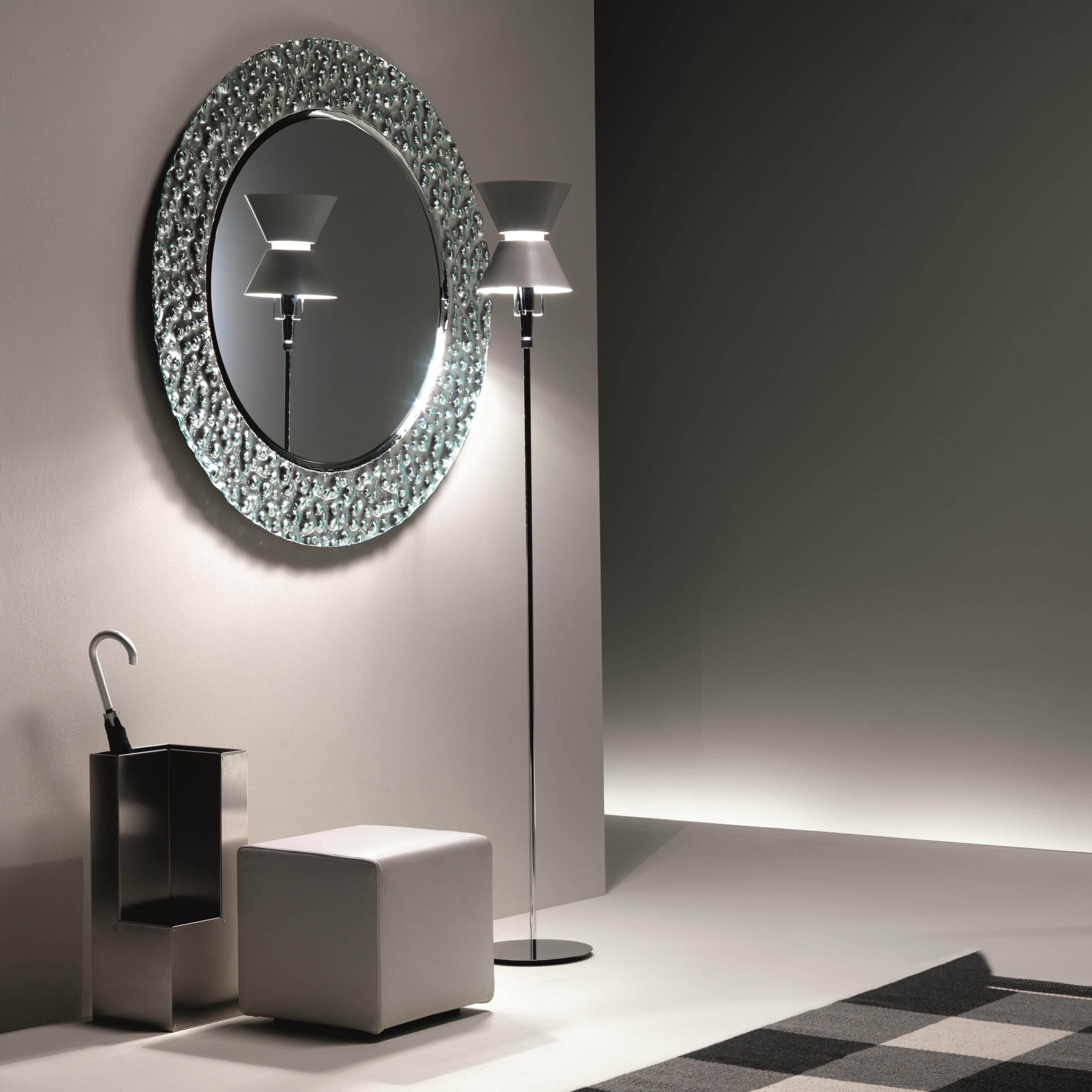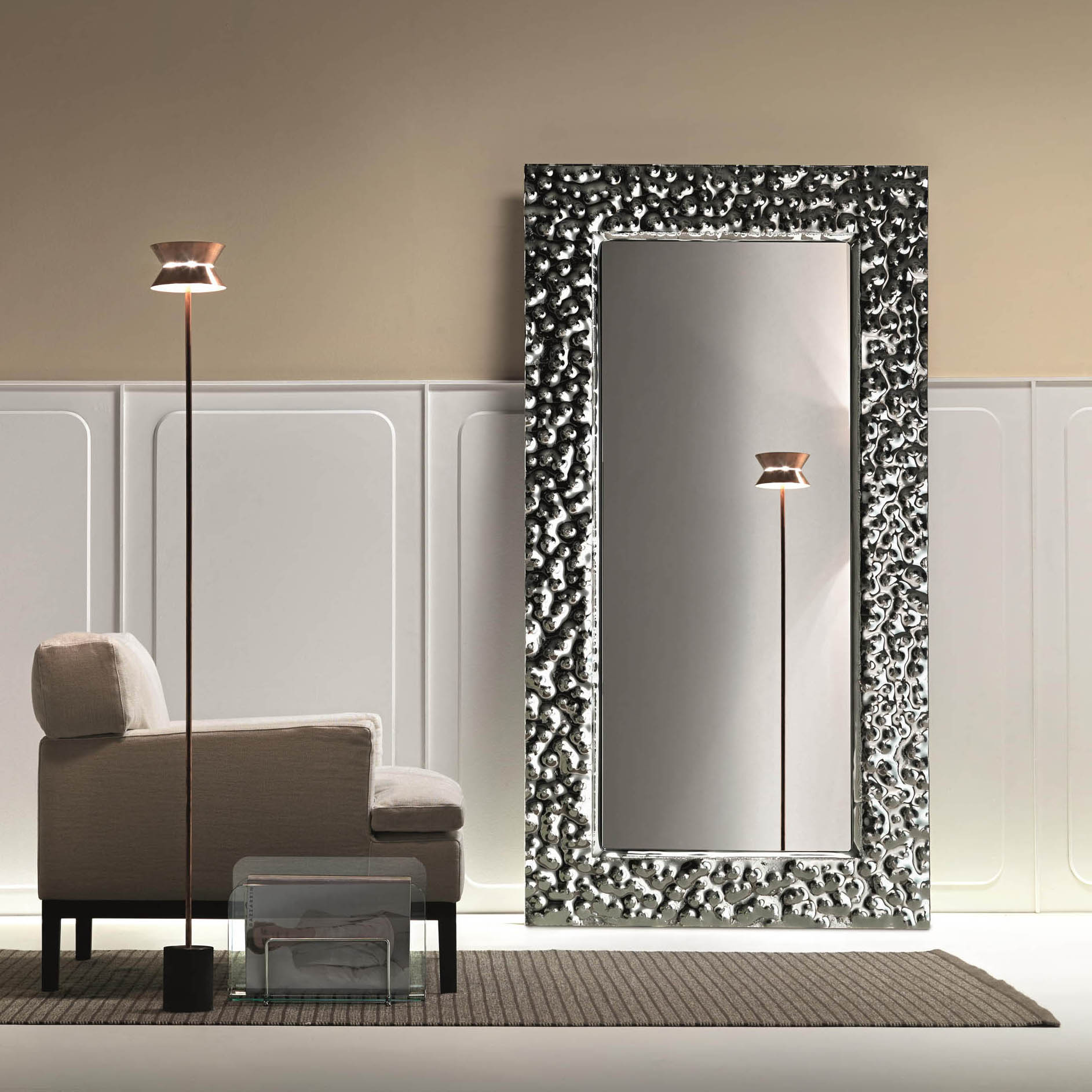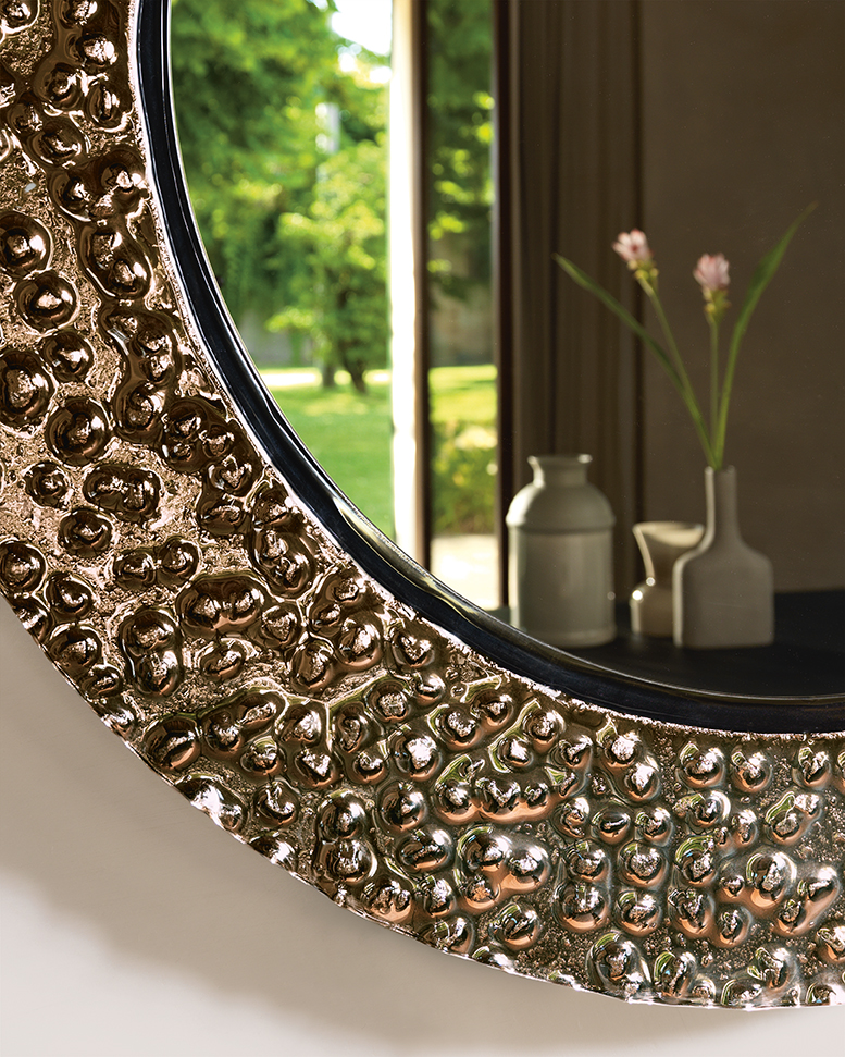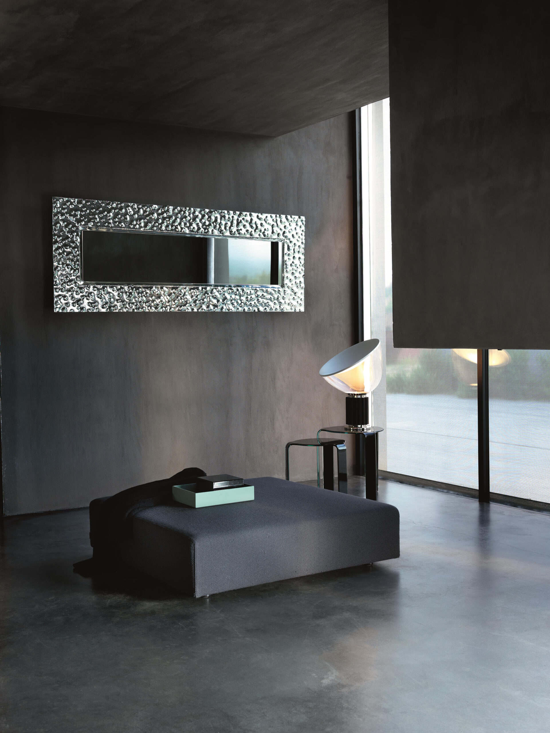 Collection of mirrors in 8 mm-thick high-temperature fused glass with back-silvered. Relief ornamentation on frame, flat mirror 5 mm-thick, painted metal rear frame. It can be hung horizontally or vertically.