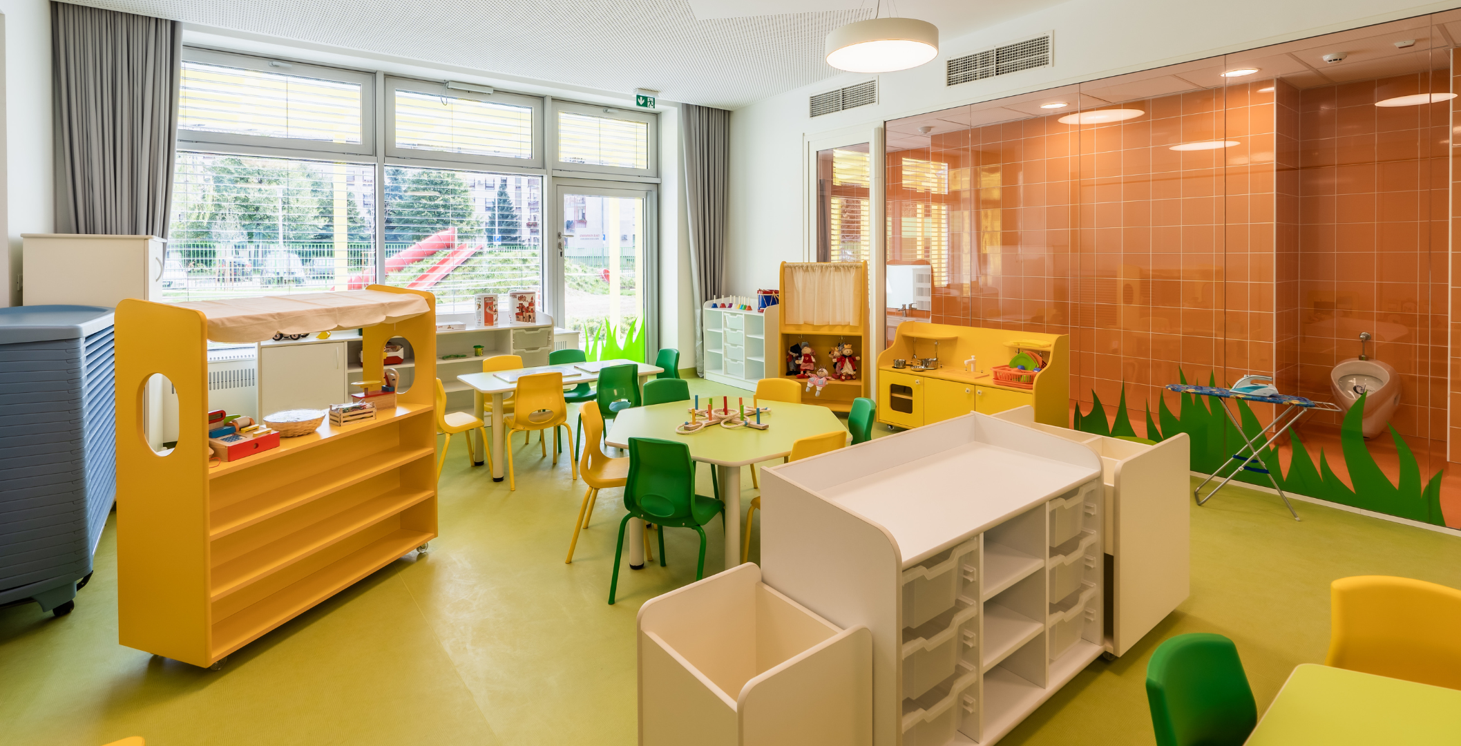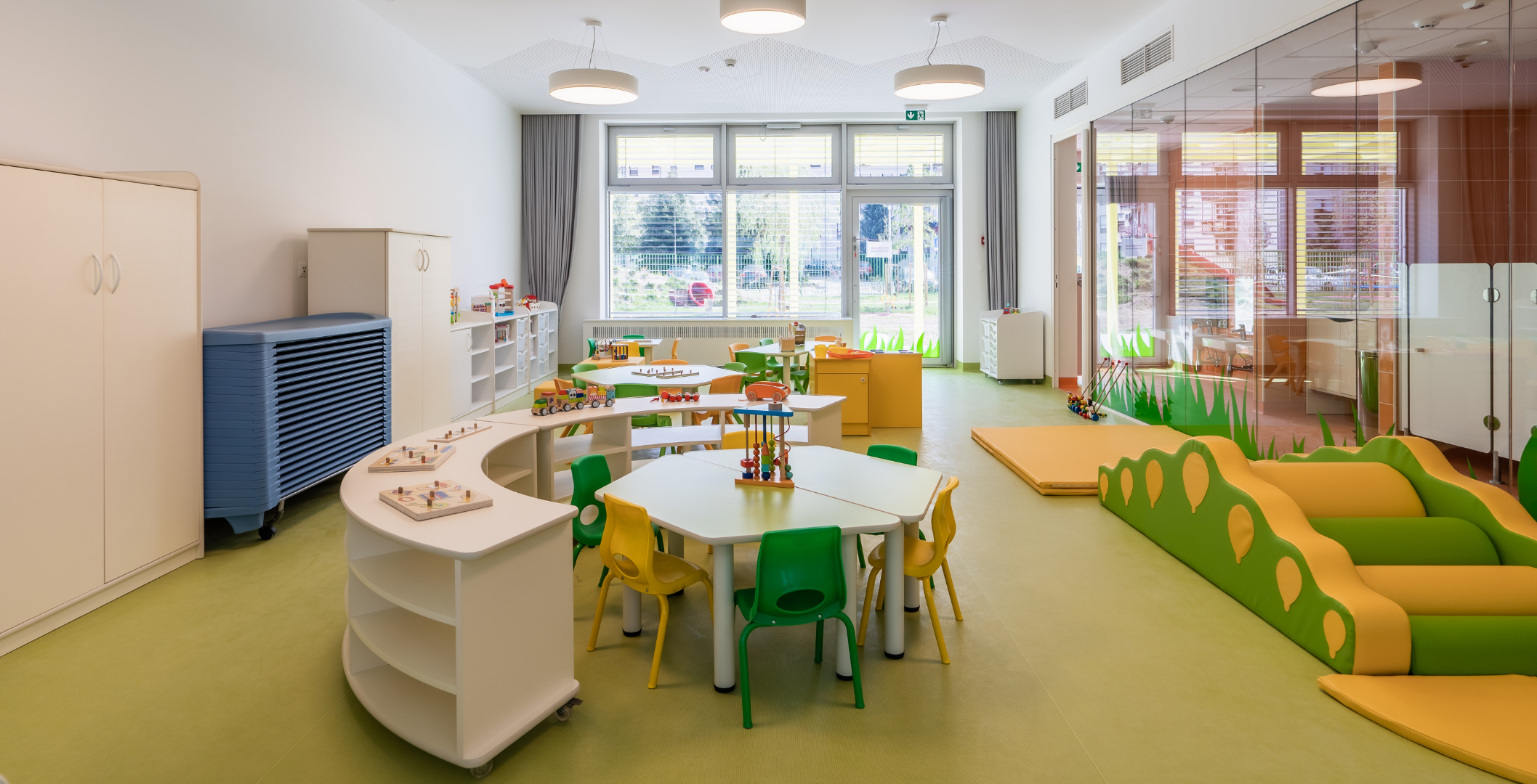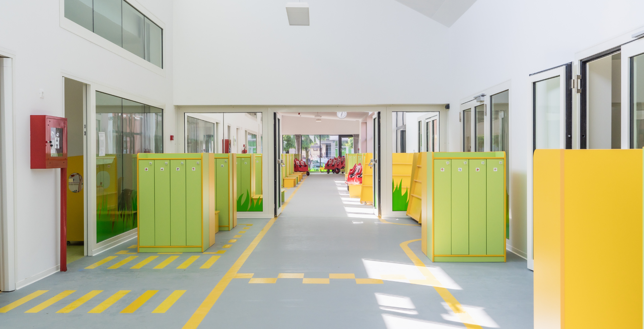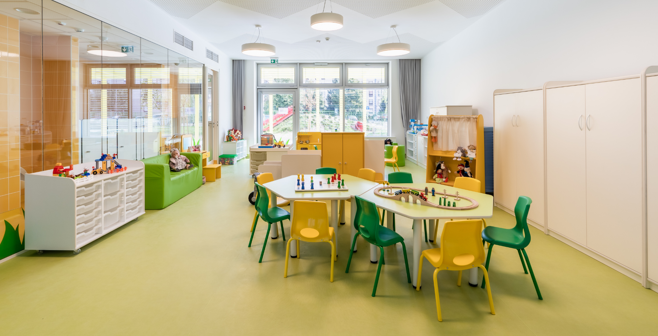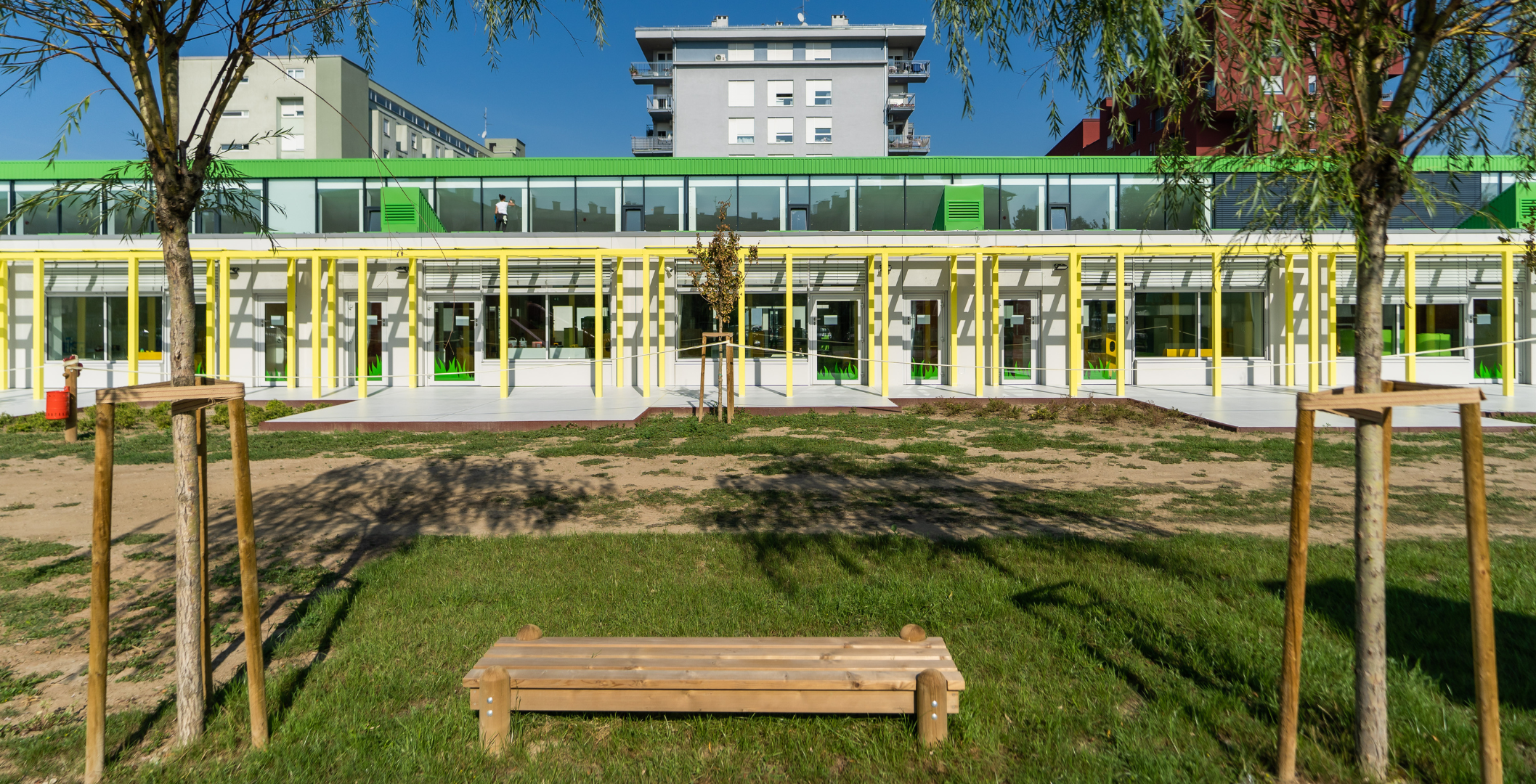 Zgrada vrtića je prizemnica dimenzija 90 x 24 metra u zelenom tonu kako bi se uklopila u prostor okružen visokim stambenim zgradama. Prema projektnom zadatku predviđeno je 12 odgojnih skupina za oko 200 djece.