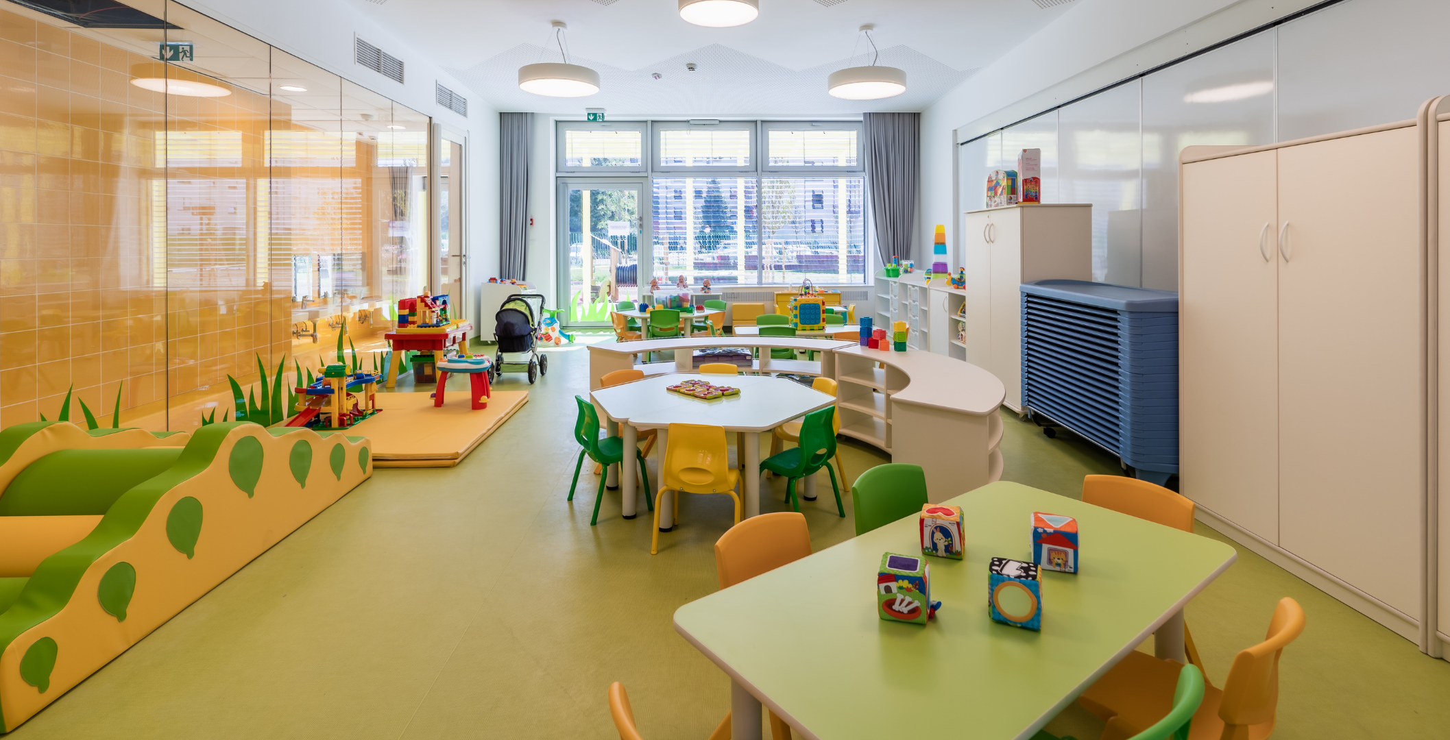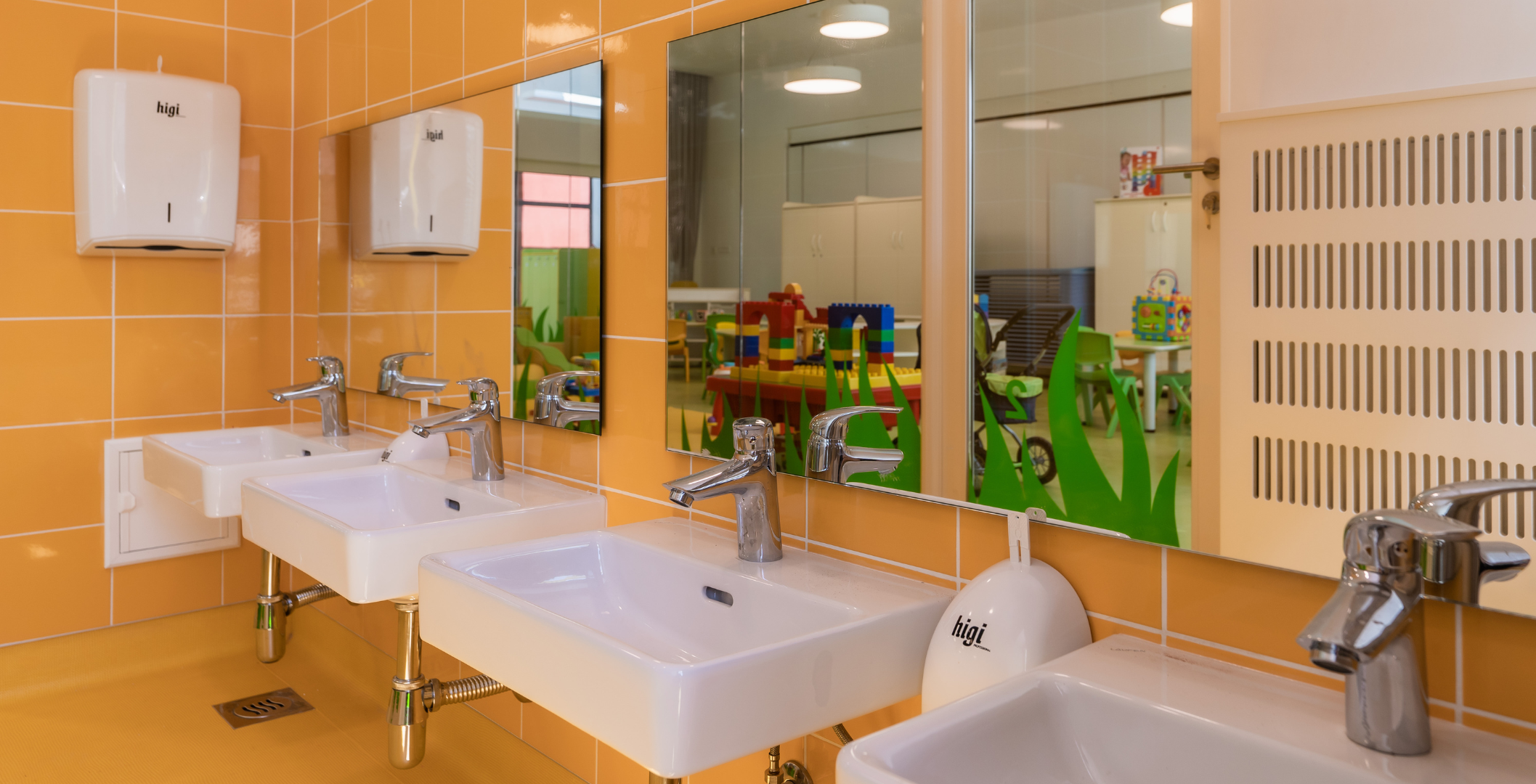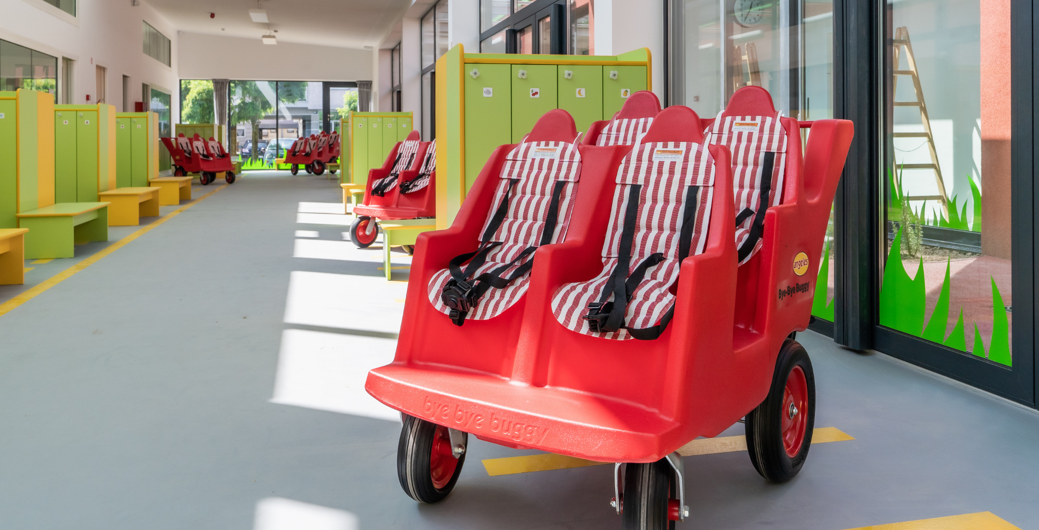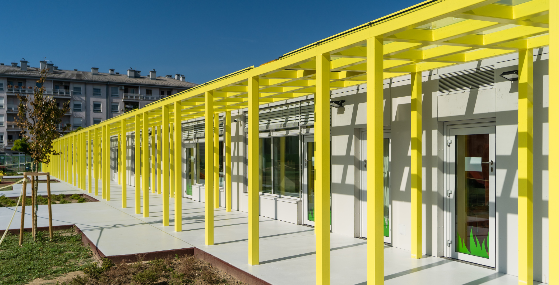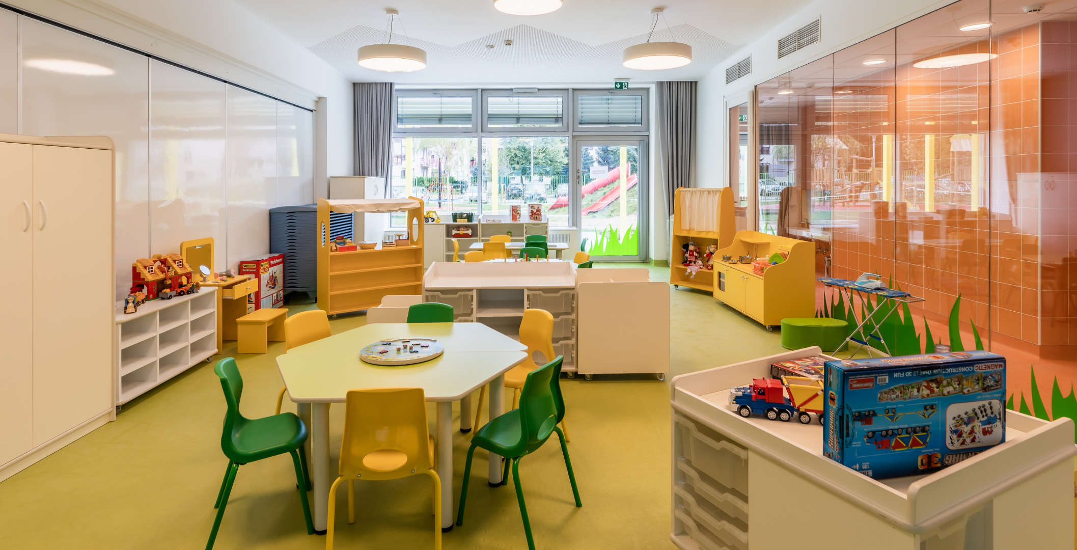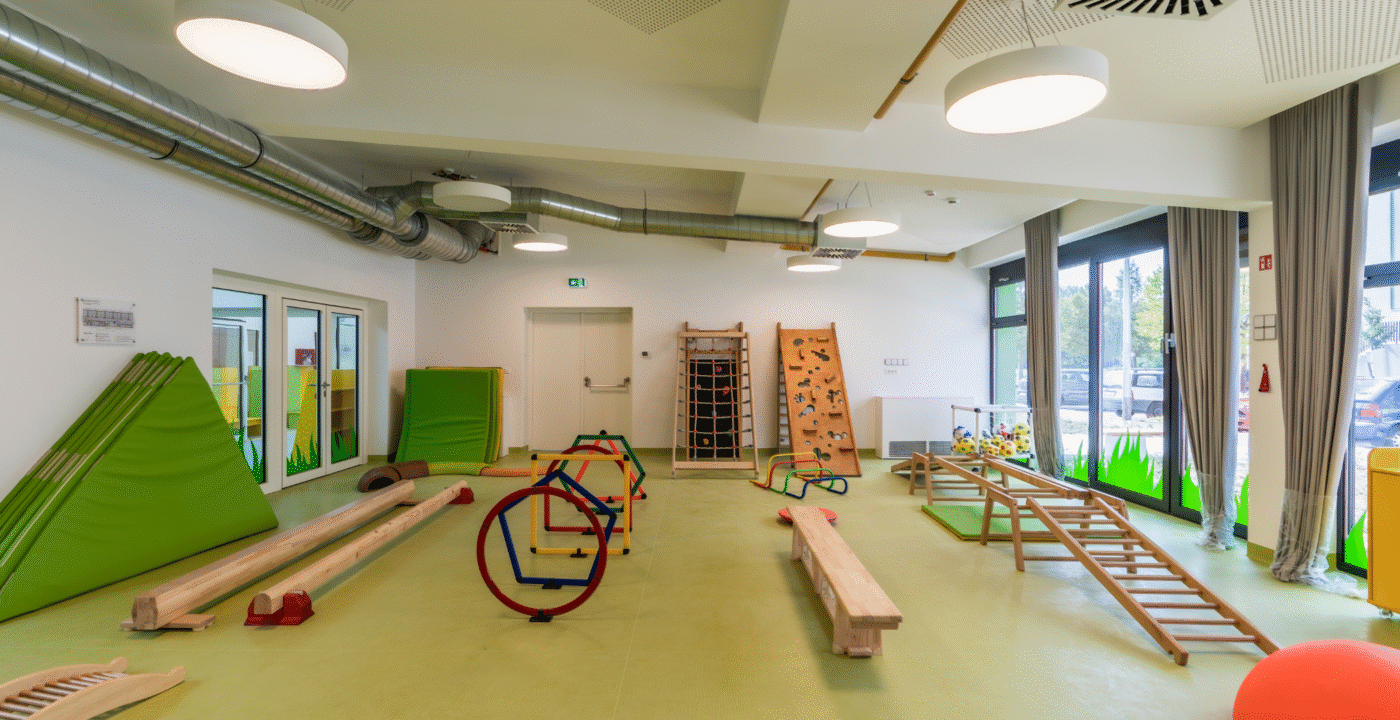 Zgrada vrtića je prizemnica dimenzija 90 x 24 metra u zelenom tonu kako bi se uklopila u prostor okružen visokim stambenim zgradama. Prema projektnom zadatku predviđeno je 12 odgojnih skupina za oko 200 djece.