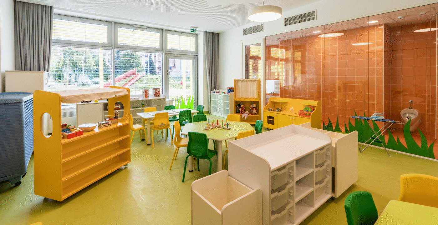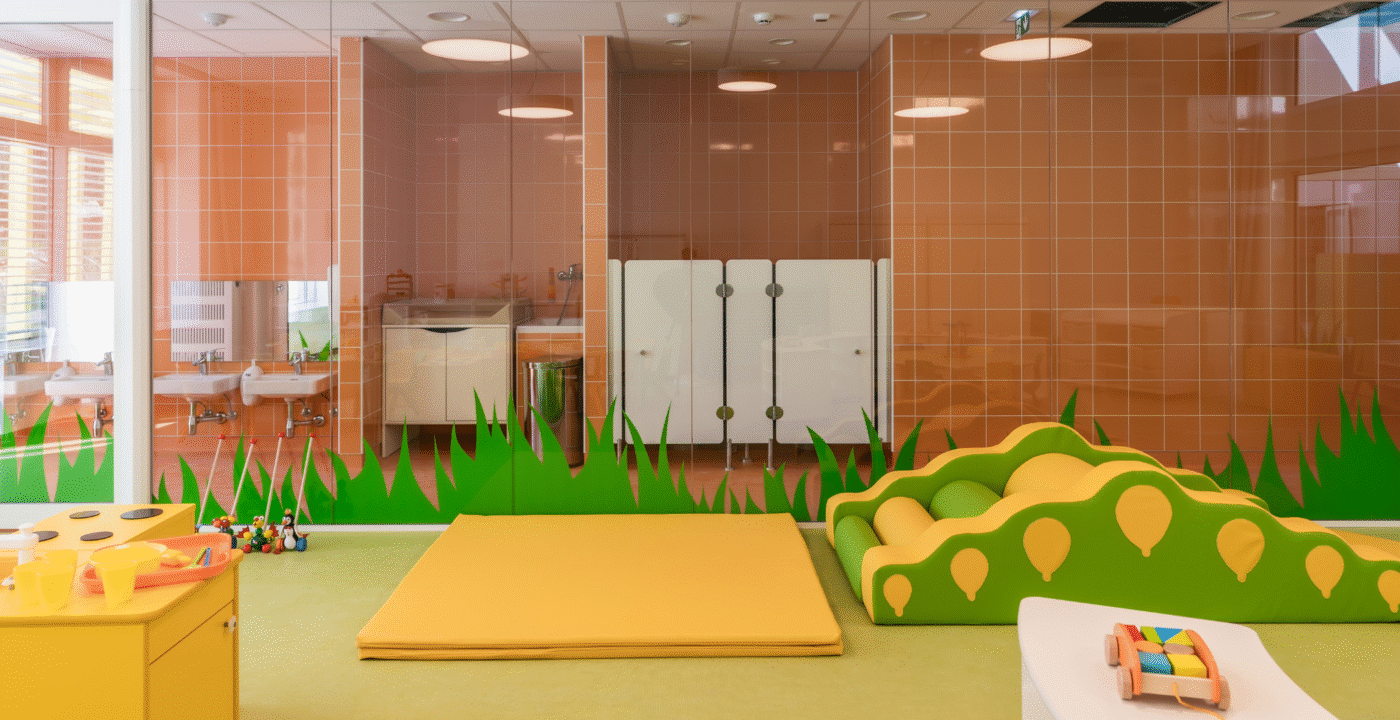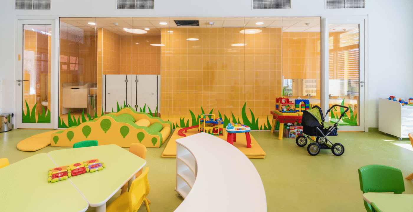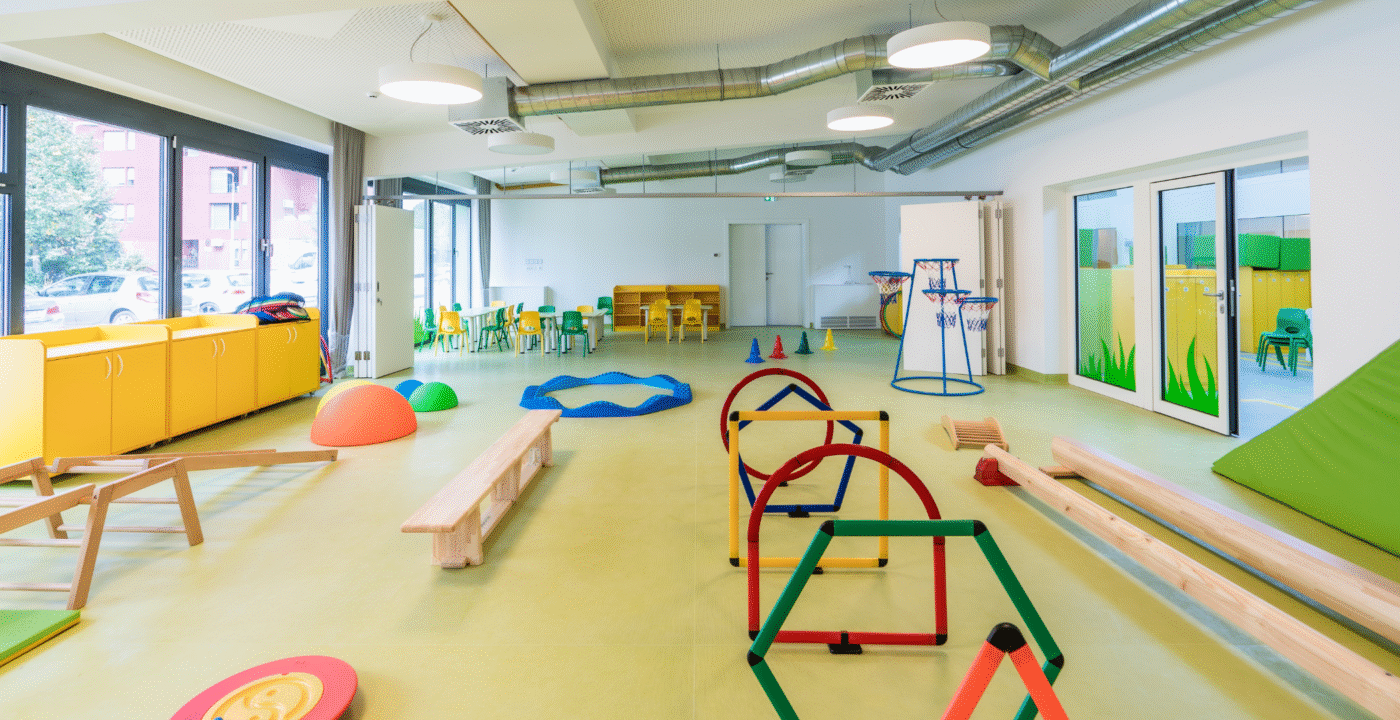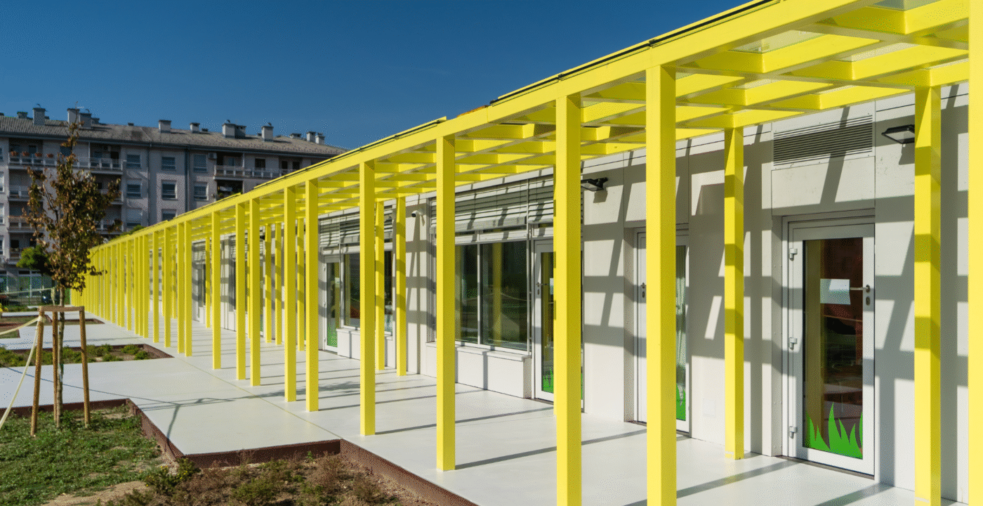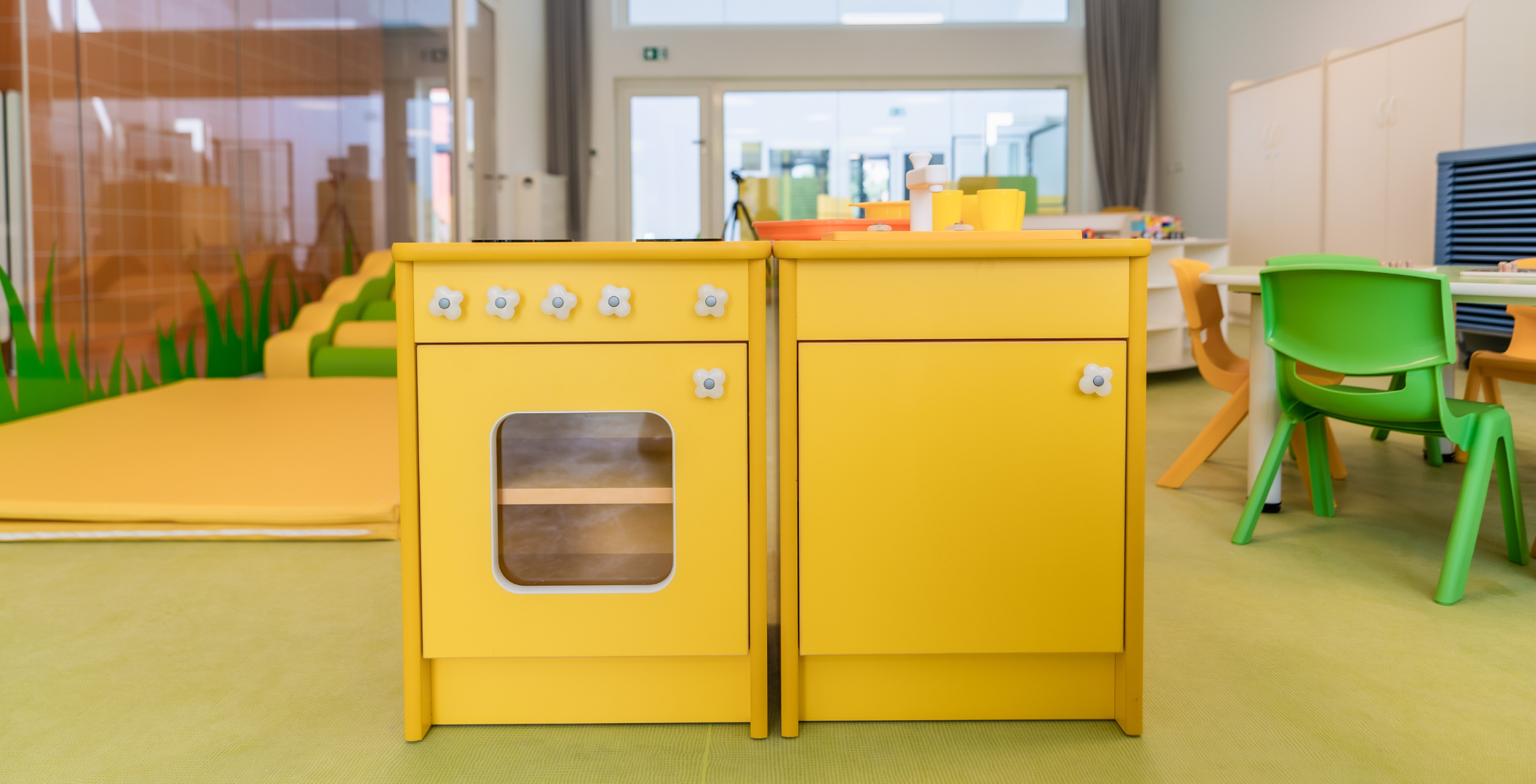 Zgrada vrtića je prizemnica dimenzija 90 x 24 metra u zelenom tonu kako bi se uklopila u prostor okružen visokim stambenim zgradama. Prema projektnom zadatku predviđeno je 12 odgojnih skupina za oko 200 djece.