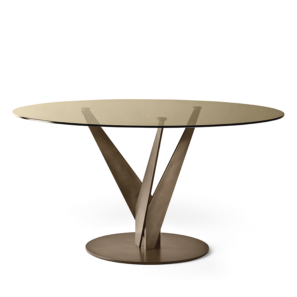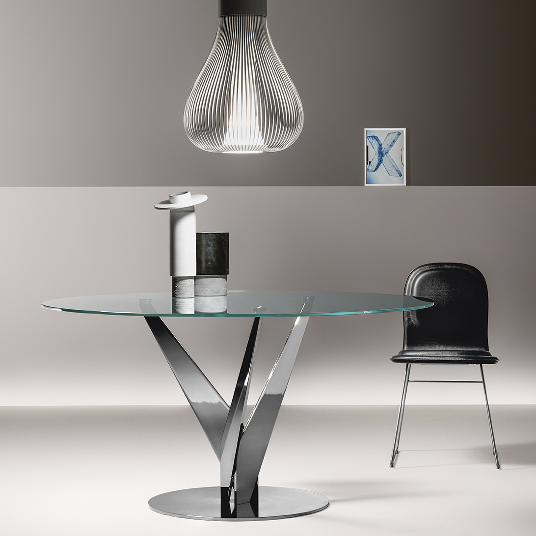 Faimov okrugli stol posjeduje površinu od kaljenog prozirnog, dimljenog ili brončanog stakla debljine 10 mm. Obrada nogu dolazi u opciji kao kromirana ili brušeni-mesing. „Epsylon“ stol također je dostupan s površinom po mjeri, promjera od 90 cm do 140 cm. Uredski stolovi za opremanje prostorija kojima treba dodir sjaja.