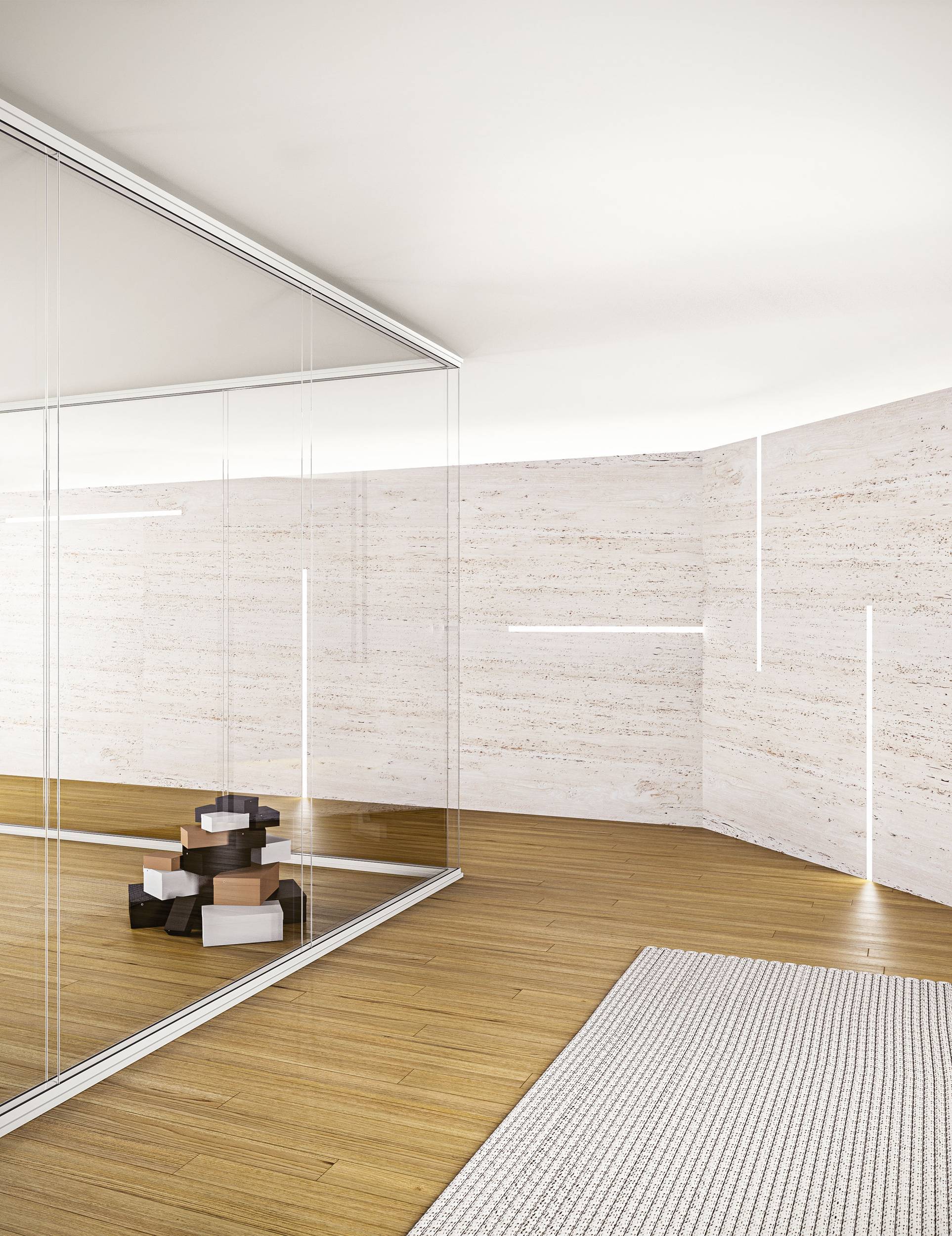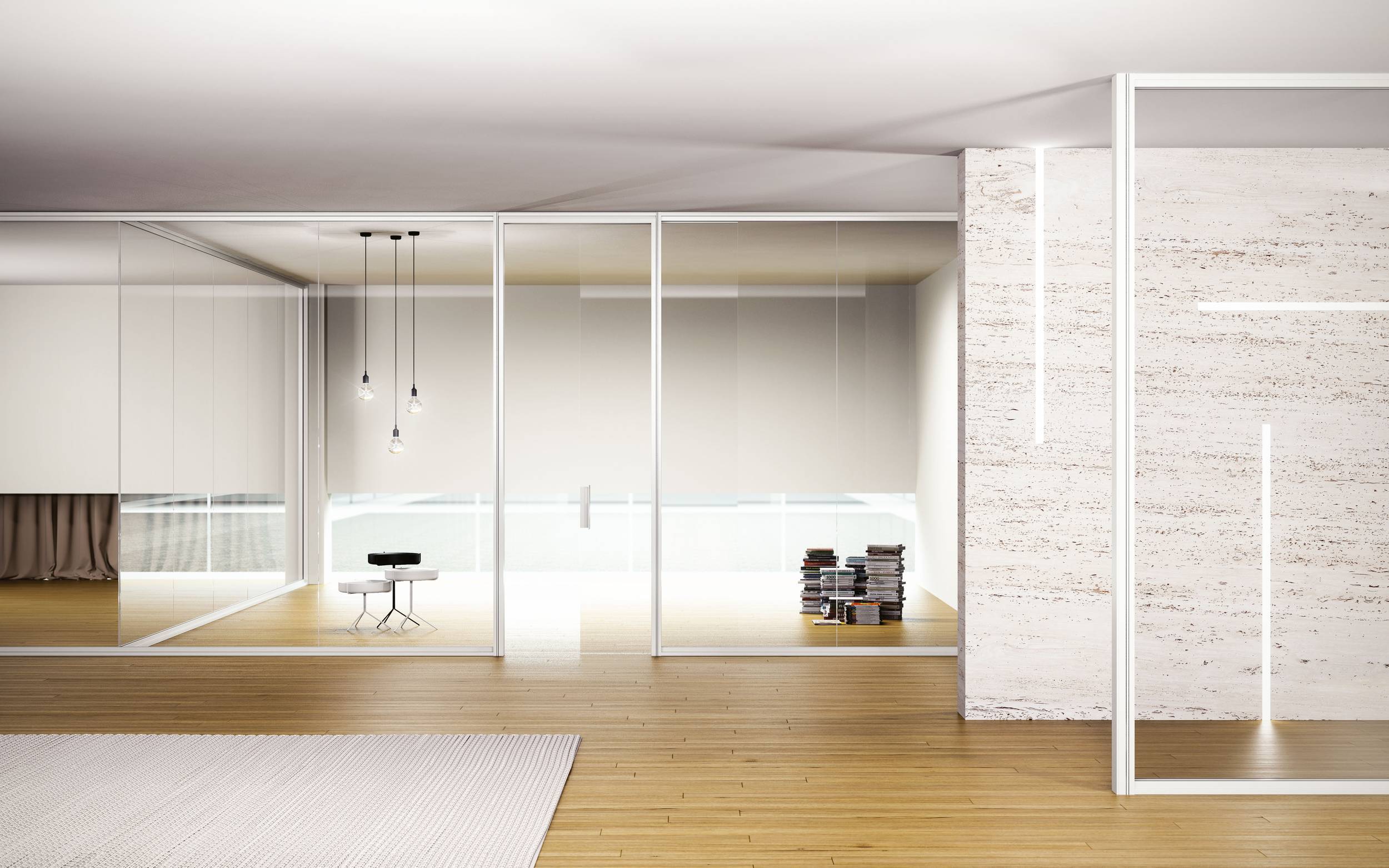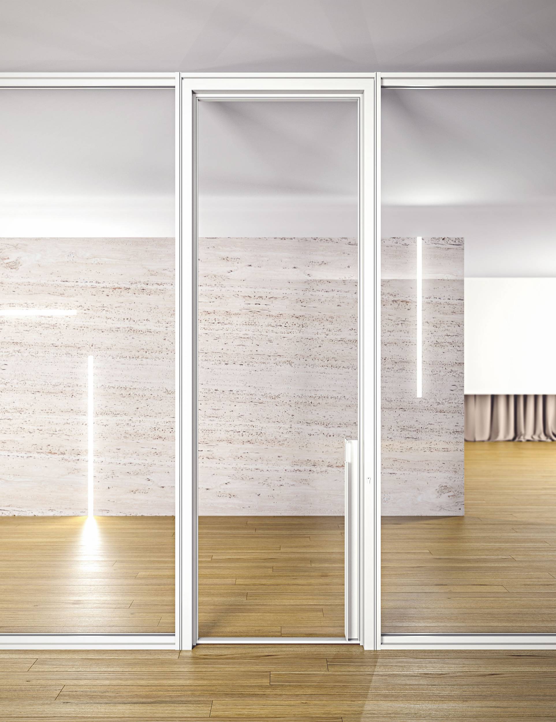 Riječ je o 100 mm širokoj pregradi koju karakteriziraju slobodnostojeće staklene stijenke. Drugačija vrsta koja, eliminacijom strukturalnih ograničenja, teži sjedinjenju suprotnosti, slijedeći ideal snage i savršene transparentnosti, istovremeno zadržavajući velik i kompleksan rubni okvir na vrhu i dnu.
