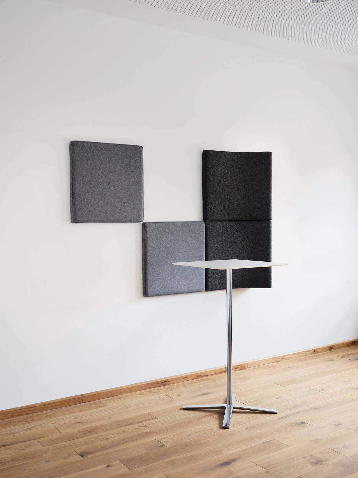 U slučaju „Landing“ zidne opcije, ime govori tisuću riječi. Uspijeva stvoriti toplu atmosferu za čavrljanje u hodnicima, prostorima između soba i stepeništa, tamo gdje prostor ne može primiti više sjedala i bočnih stolova. „Landing“ se sastoji od dva osnovna zvučno-apsorbirajuća modula: jedan od 60×60 cm razmjeran s elementom tapeciranim s 10 milimetara širokom pjenom i prekrivenom tkaninom i jednako veliki trodimenzionalni profilirani reljefni element koji se može koristiti na tri načina, ovisno kako je postavljen: kao polica (s dodatnom čeličnom površinom s posebnim dodatnim slojem), okomito rotirana za 90° kao uspravna metoda stvaranja prostora, pružajući zaslon ili ugodan kut za oslanjanje, i okrenut za 180° vodoravno kako bi se na nju mogli posjesti. Moduli su postavljeni u posebne okvire i mogu se koristiti u neograničenom broju kombinacija. Oni poboljšavaju akustiku, stvaraju male kutove za razgovore ili telefoniranje, nude prostore za ostavljanje pića ili pametnih telefona i omogućuju odmaranje umornih nogu. Presvlake dolaze u sedam standardnih boja kako bi otvorili više dizajnerskih opcija i omogućili da se „Landing“ može koristiti kao način označavanja i komuniciranja pomoću boja.