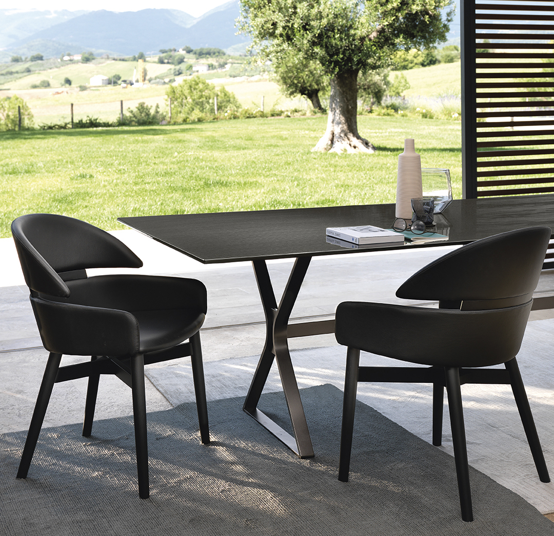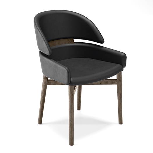 Polivalentne stolice sa strukturom od punog drveta, dostupne su u oak tobacco završnoj obradi ili u sjajnoj crnoj boji s otvorenim porama. Sjedalo i naslon presvučeni su kožom.
