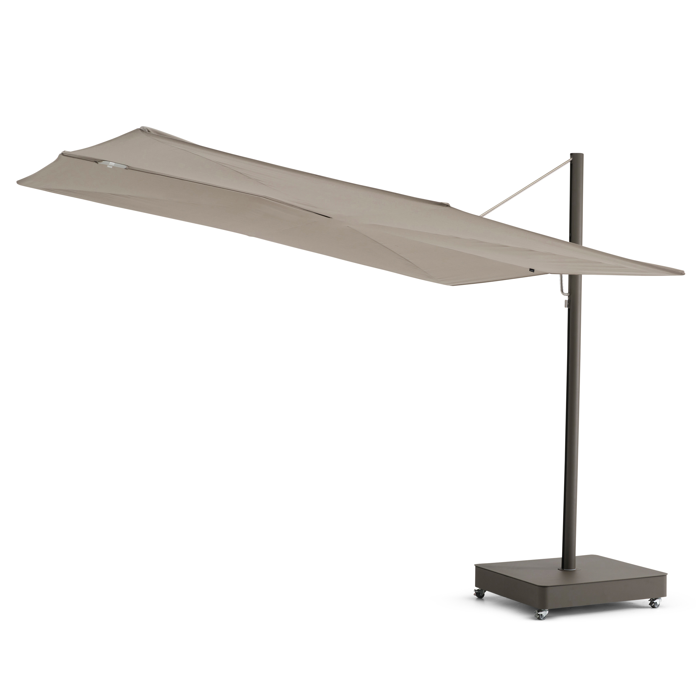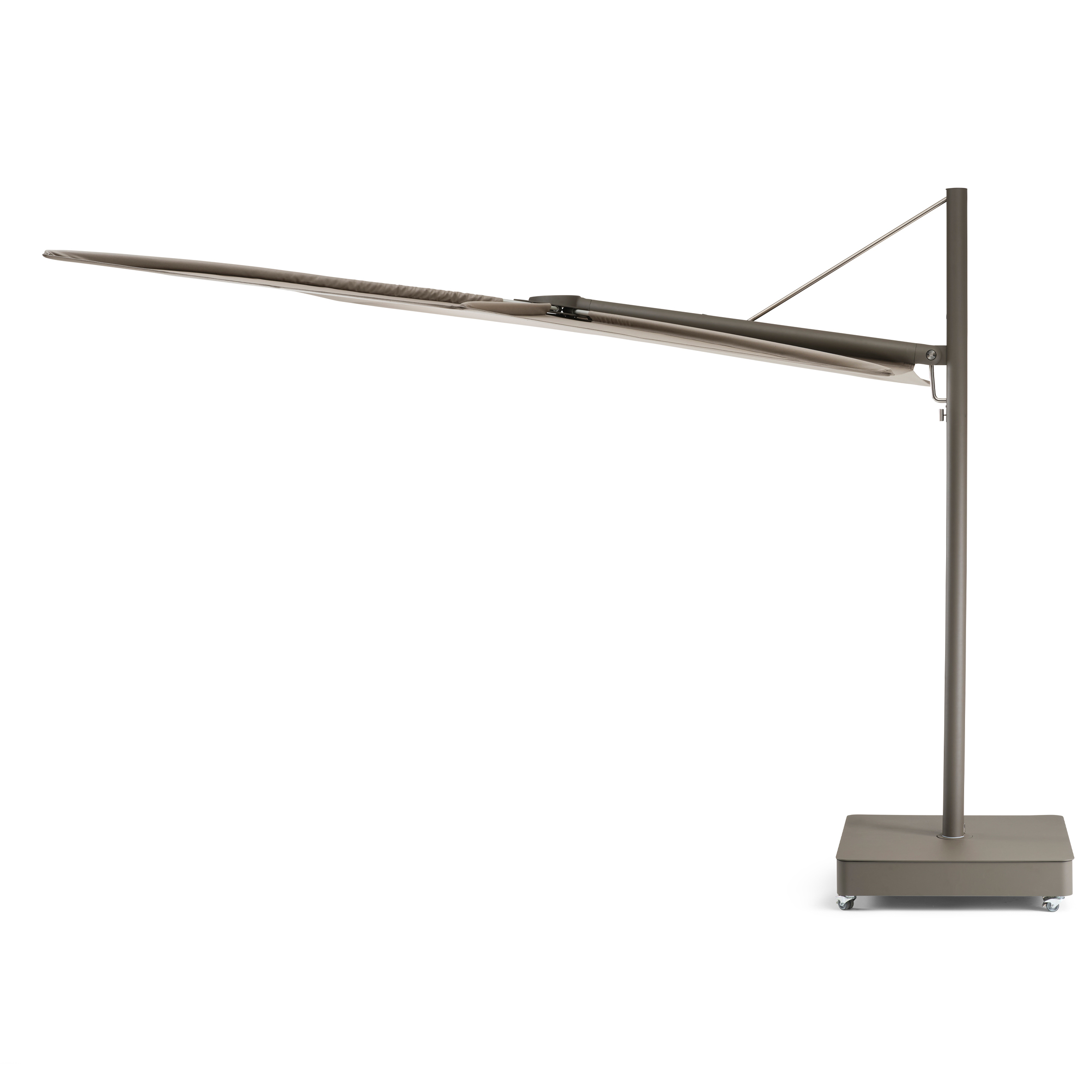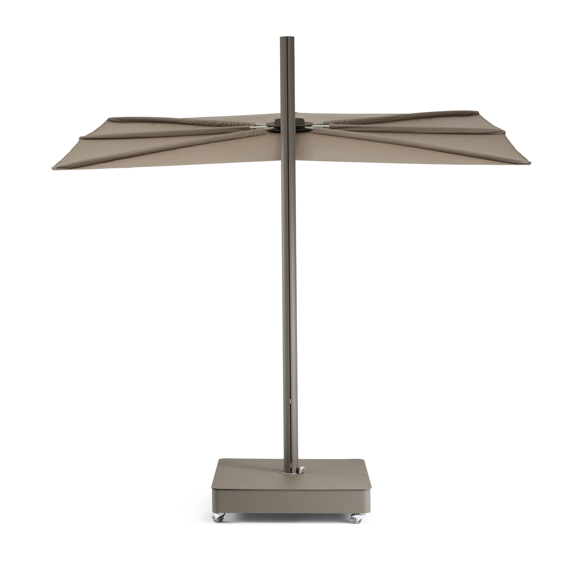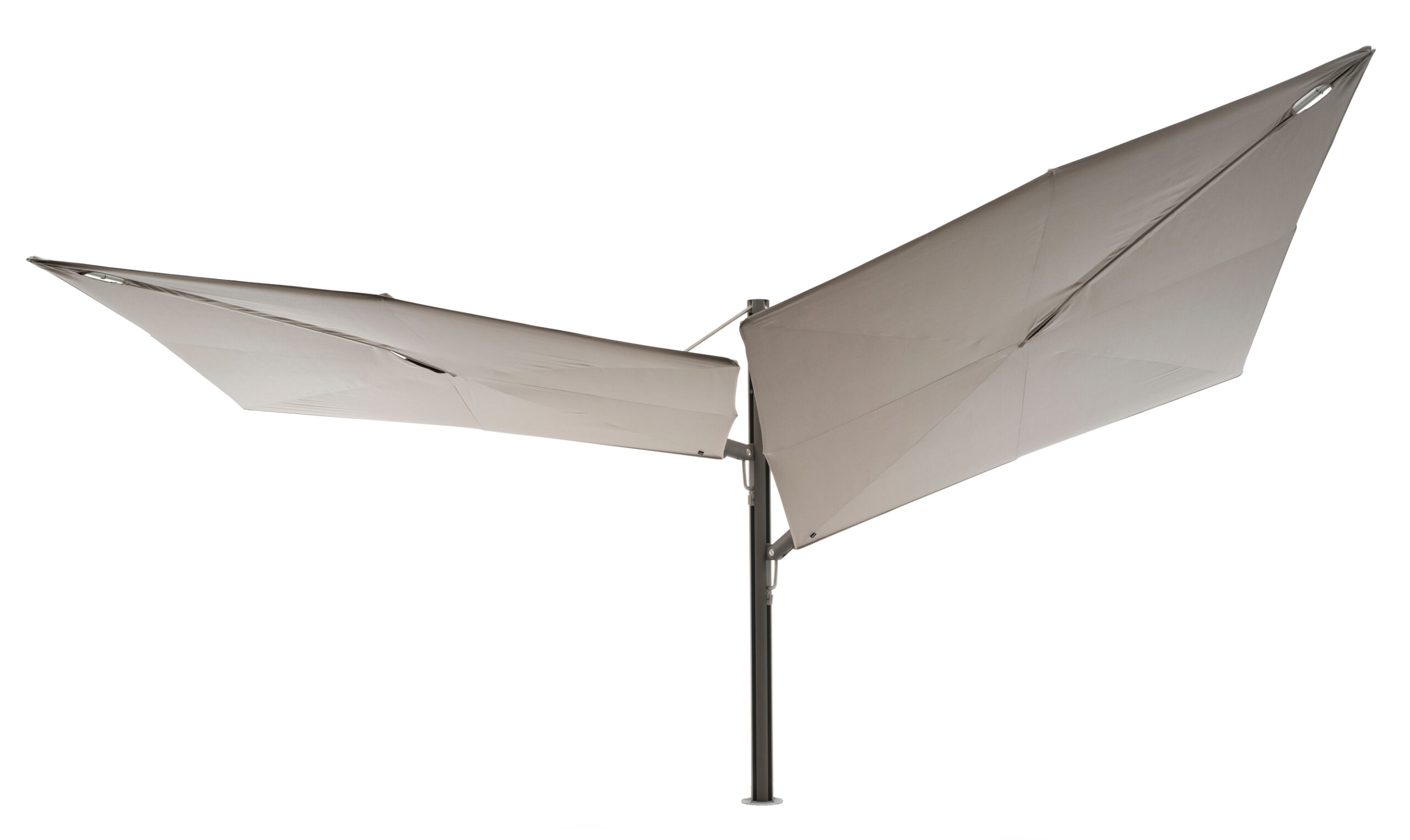 Ovi samostojeći suncobrani otvaraju se vodoravno poput ručne lepeze i ne zauzimaju nikakav prostor na stolu. Zahvaljujući svojoj ravnoj površini, „Sensu“ nudi izvrsnu otpornost na vjetar, a također drži sve tehničke dijelove izvan pogleda. Ova lebdeća zaštita od sunca otvara se i zatvara bez napora. Modularni središnji stup može držati jedno, dva ili čak četiri platna za maksimalnu površinu suncobrana.