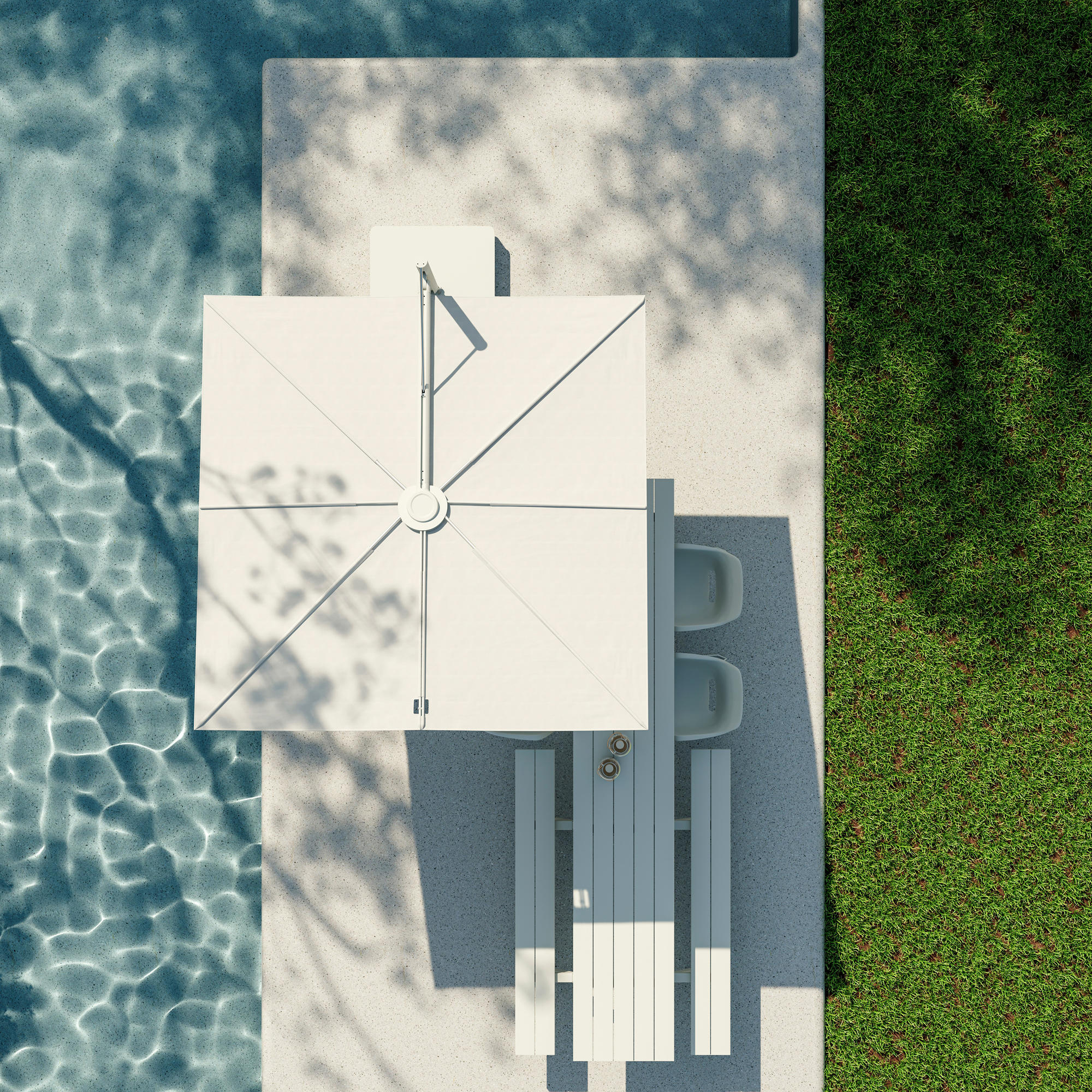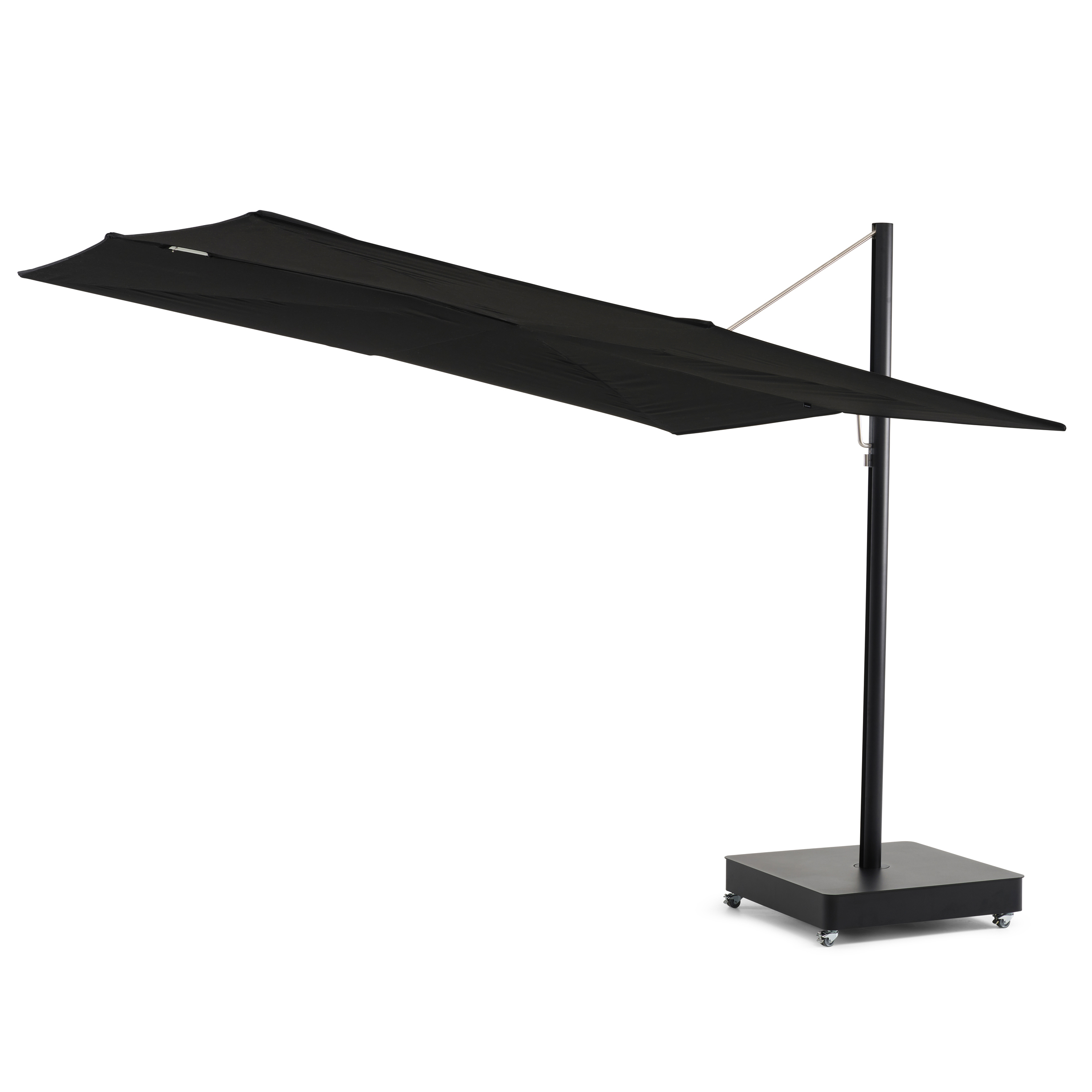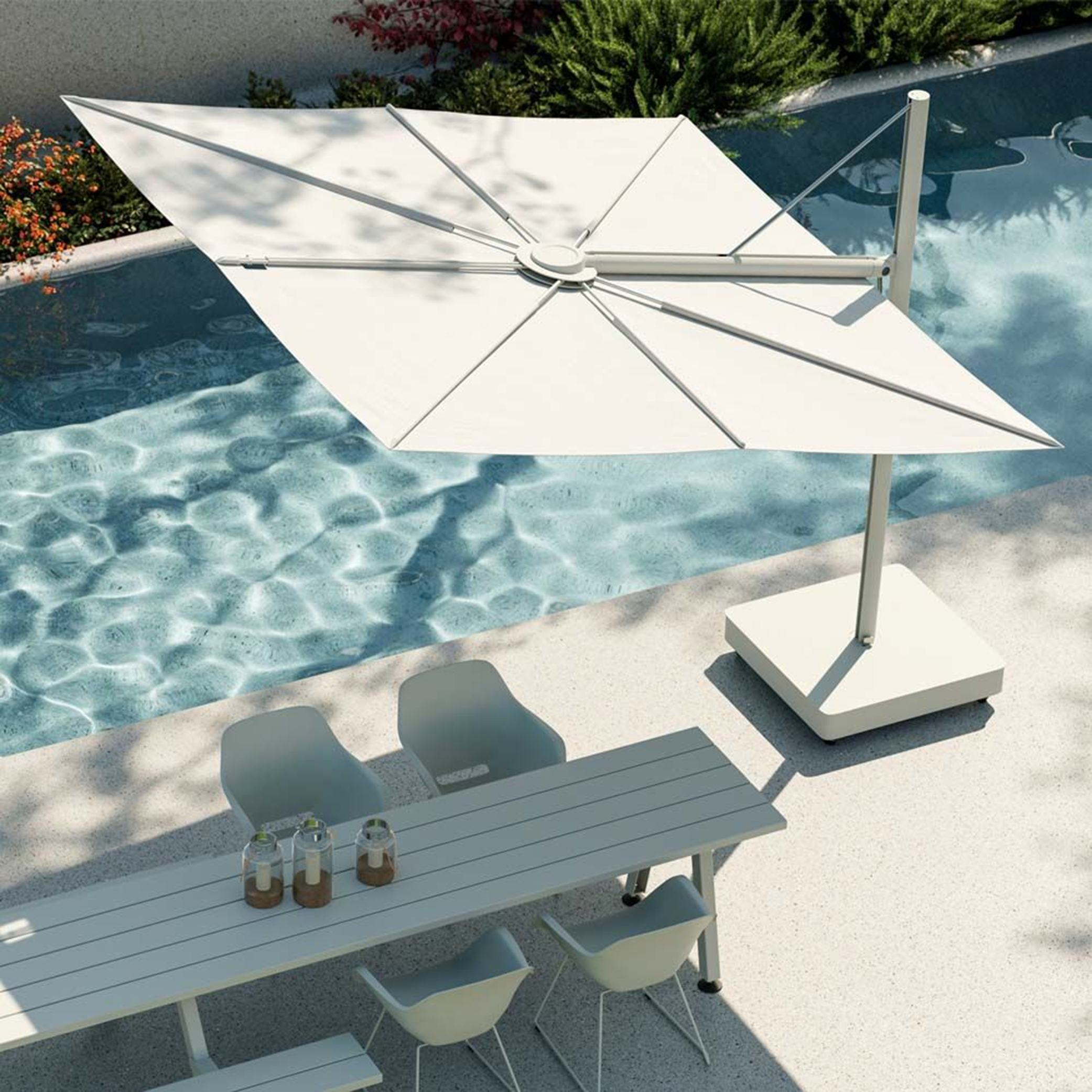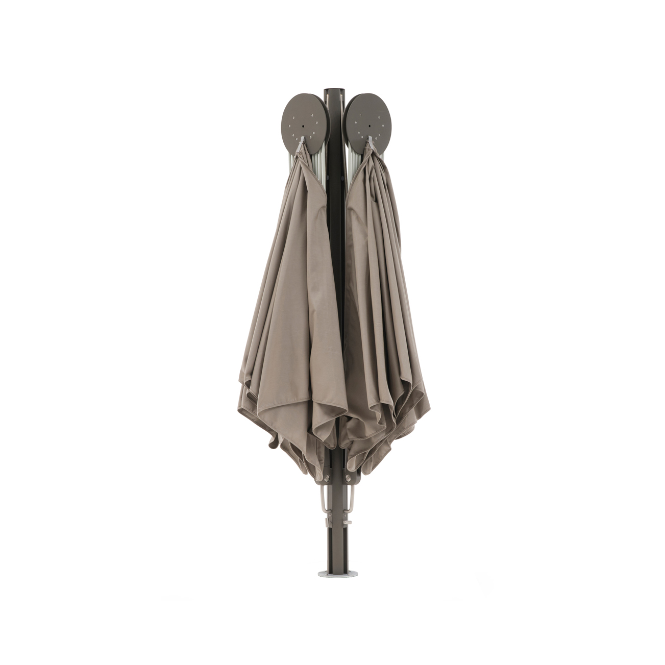 Ovi samostojeći suncobrani otvaraju se vodoravno poput ručne lepeze i ne zauzimaju nikakav prostor na stolu. Zahvaljujući svojoj ravnoj površini, „Sensu“ nudi izvrsnu otpornost na vjetar, a također drži sve tehničke dijelove izvan pogleda. Ova lebdeća zaštita od sunca otvara se i zatvara bez napora. Modularni središnji stup može držati jedno, dva ili čak četiri platna za maksimalnu površinu suncobrana.